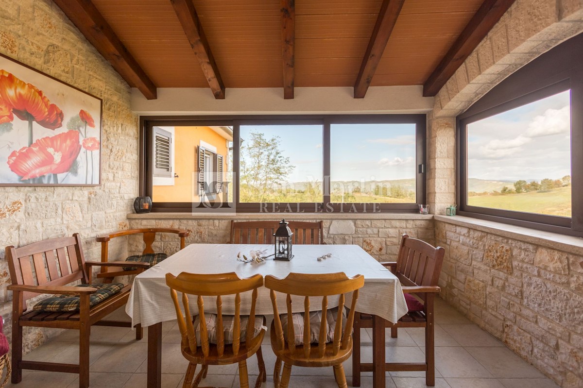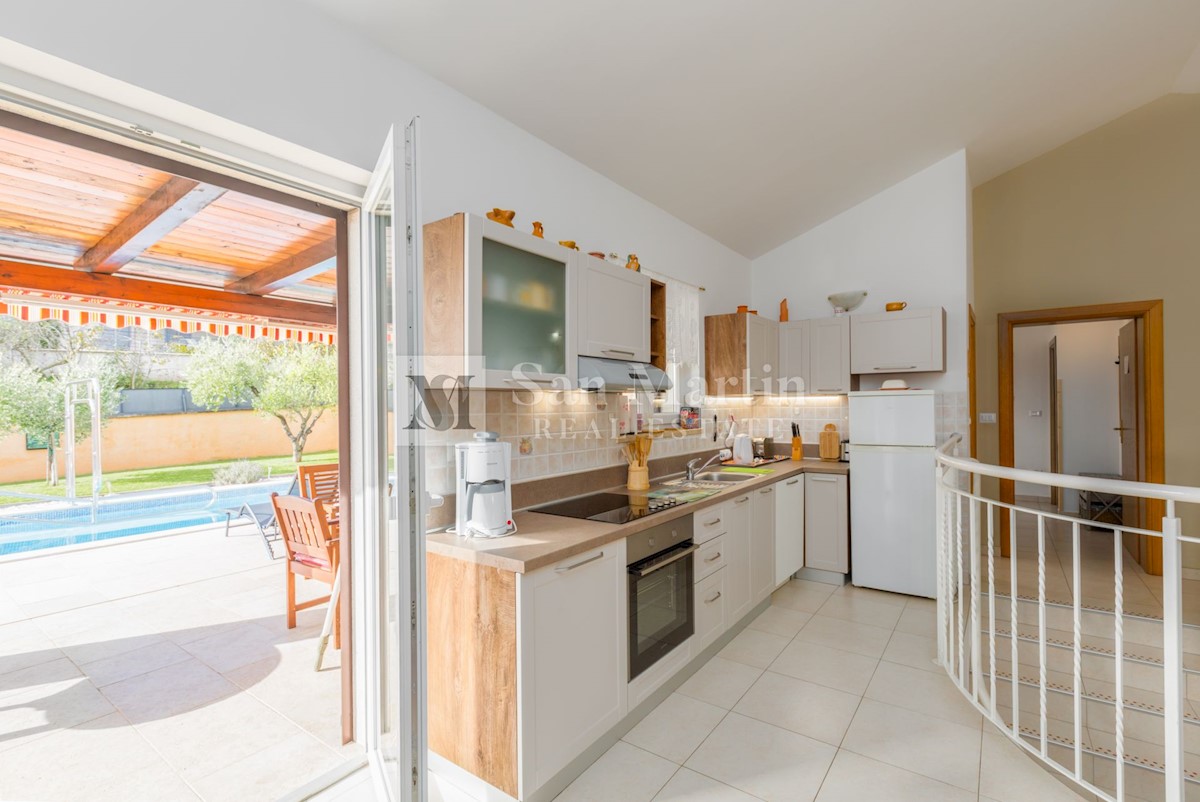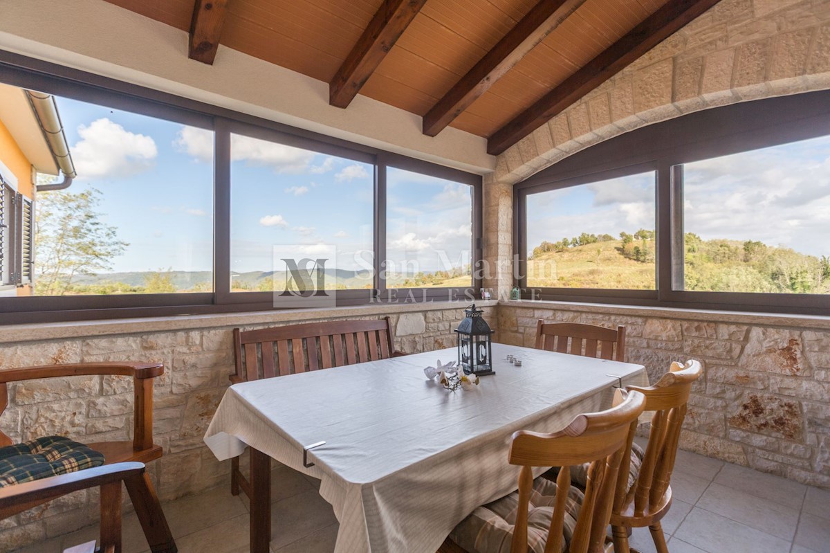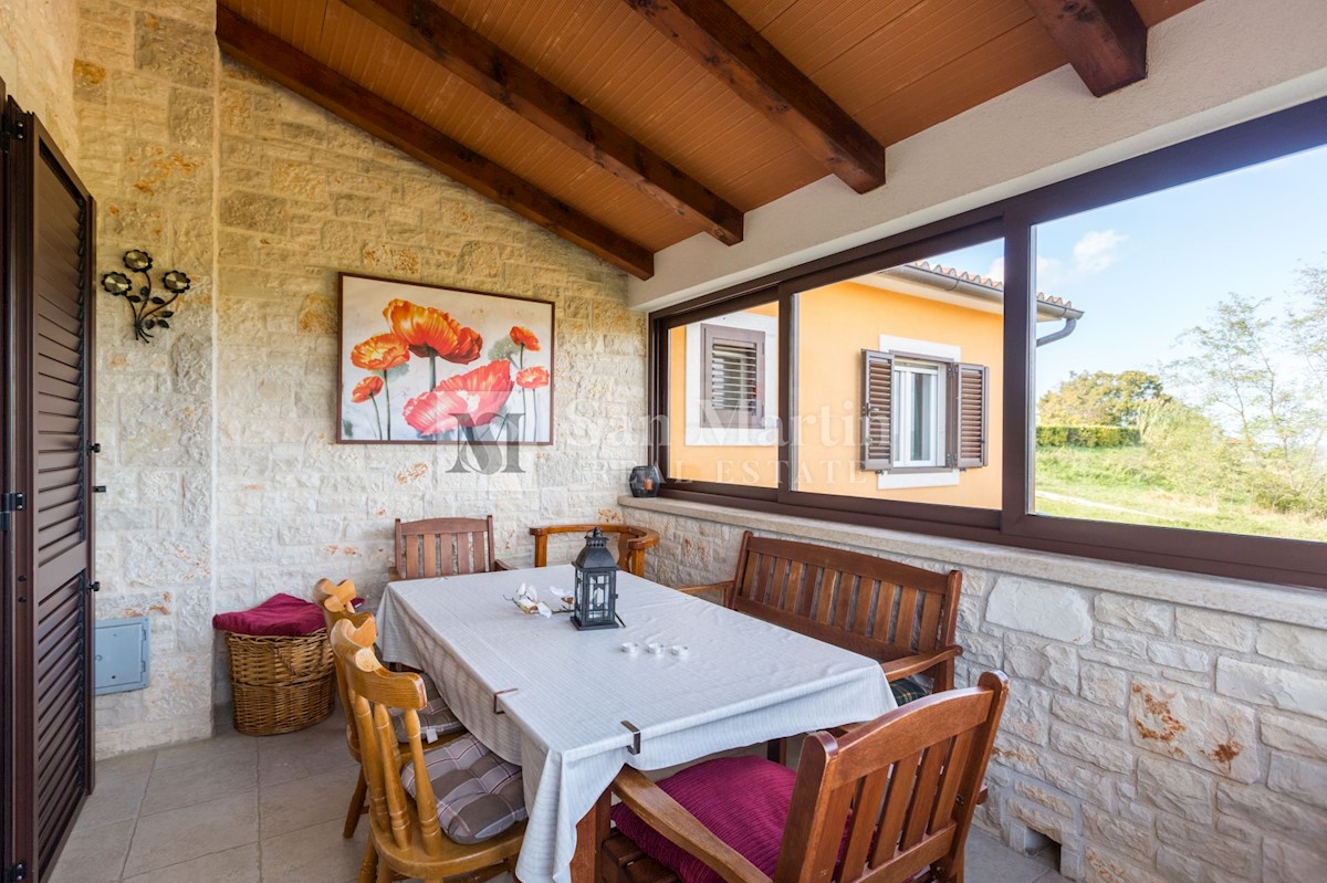 Poreč, okolica, Vila z bazenom in odprtim pogledom Le 15 kilometrov od morja in 18 kilometrov od Poreča, v središču manj znanega mesta z vsemi potrebnimi vsebinami za življenje, se nahaja ta odlično opremljena nepremičnina z odprtim pogledom na naravo.