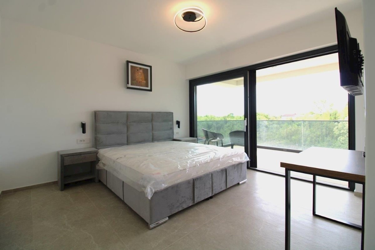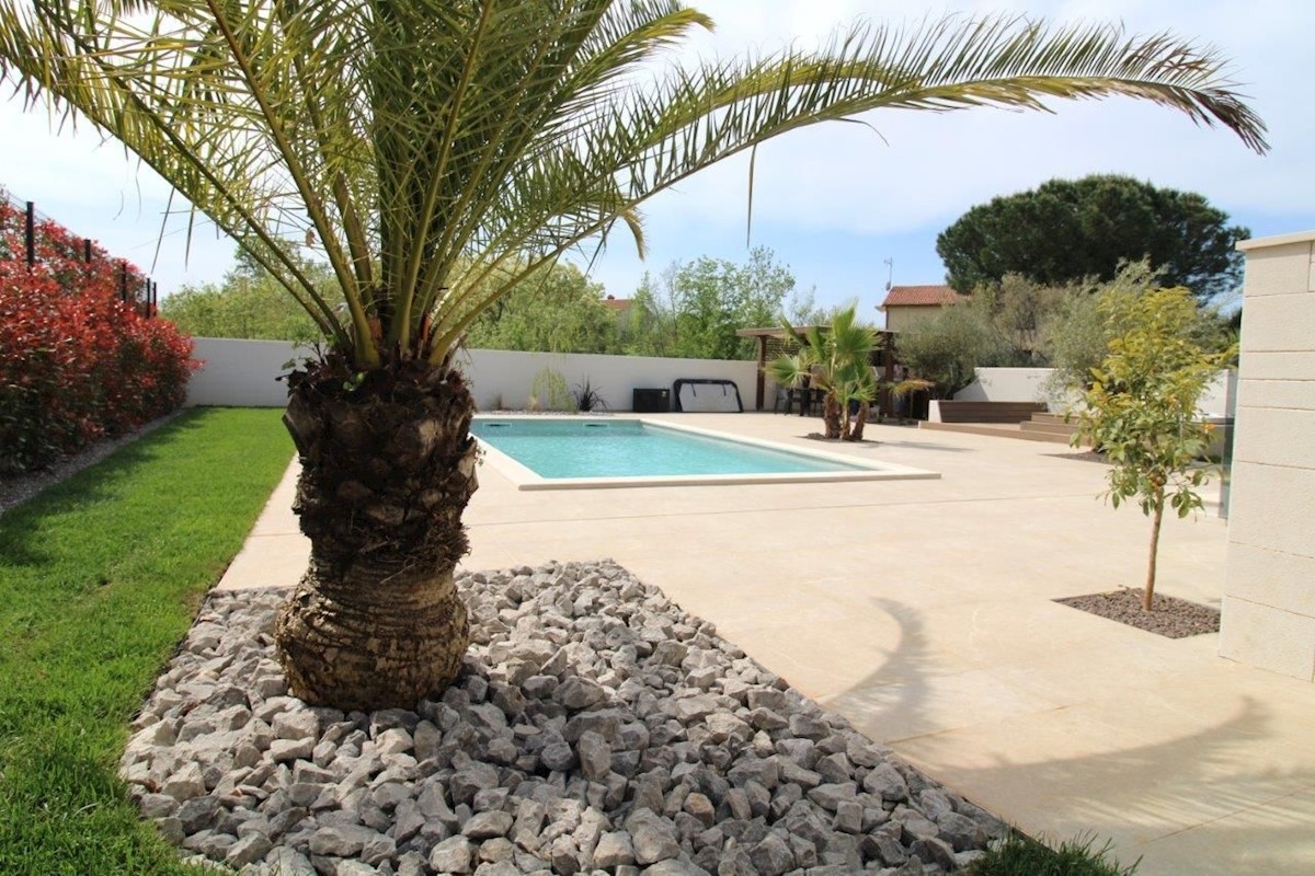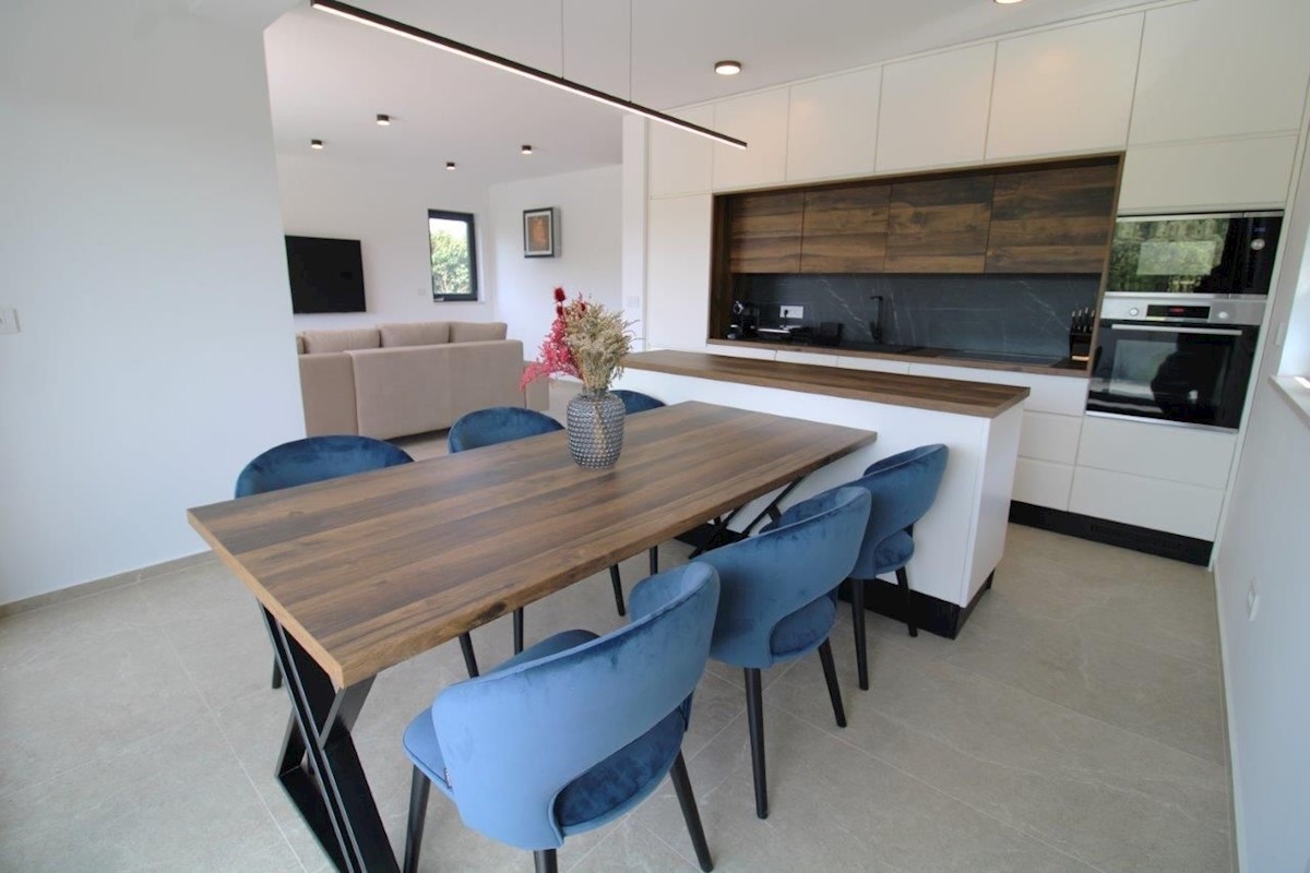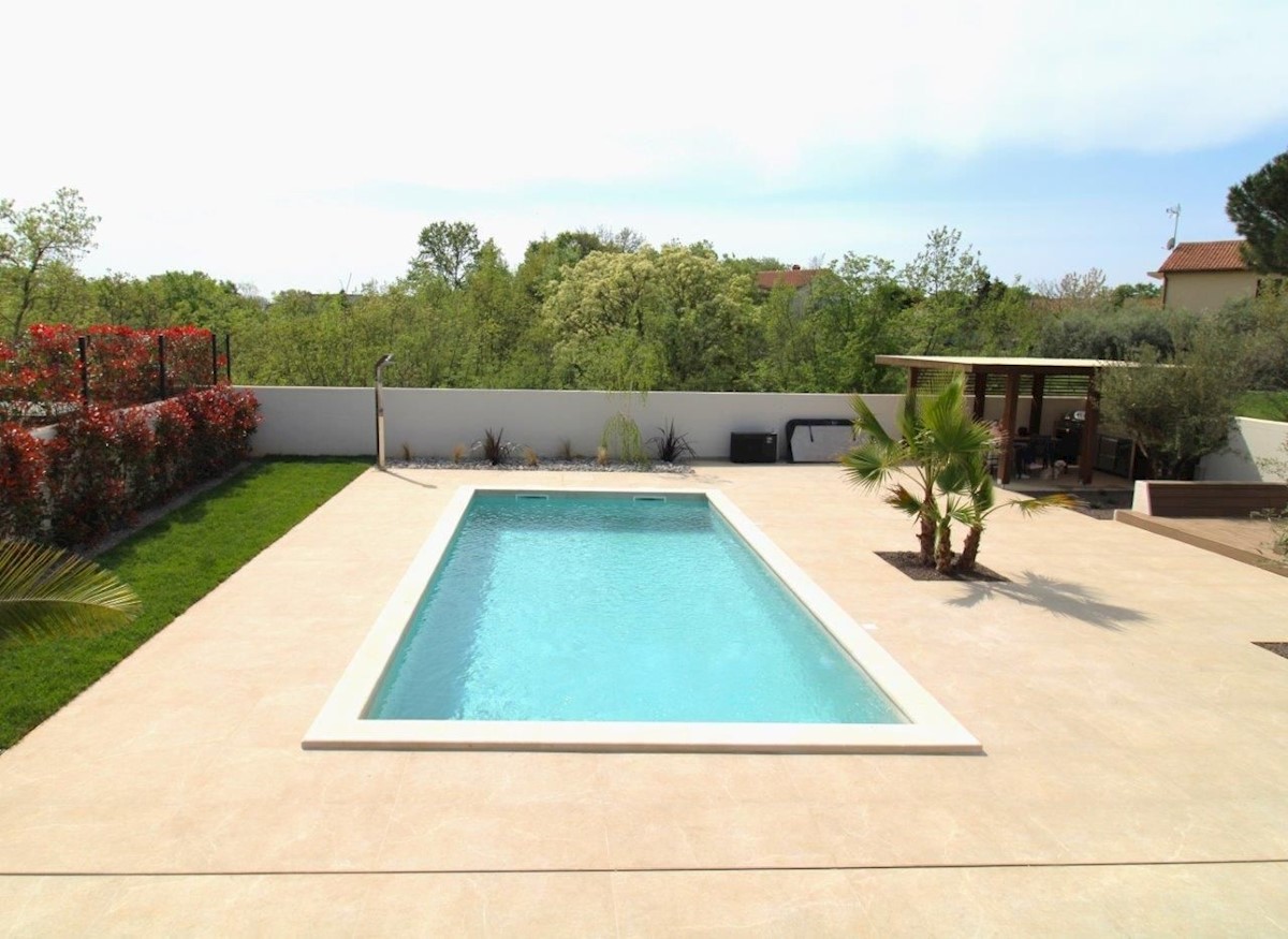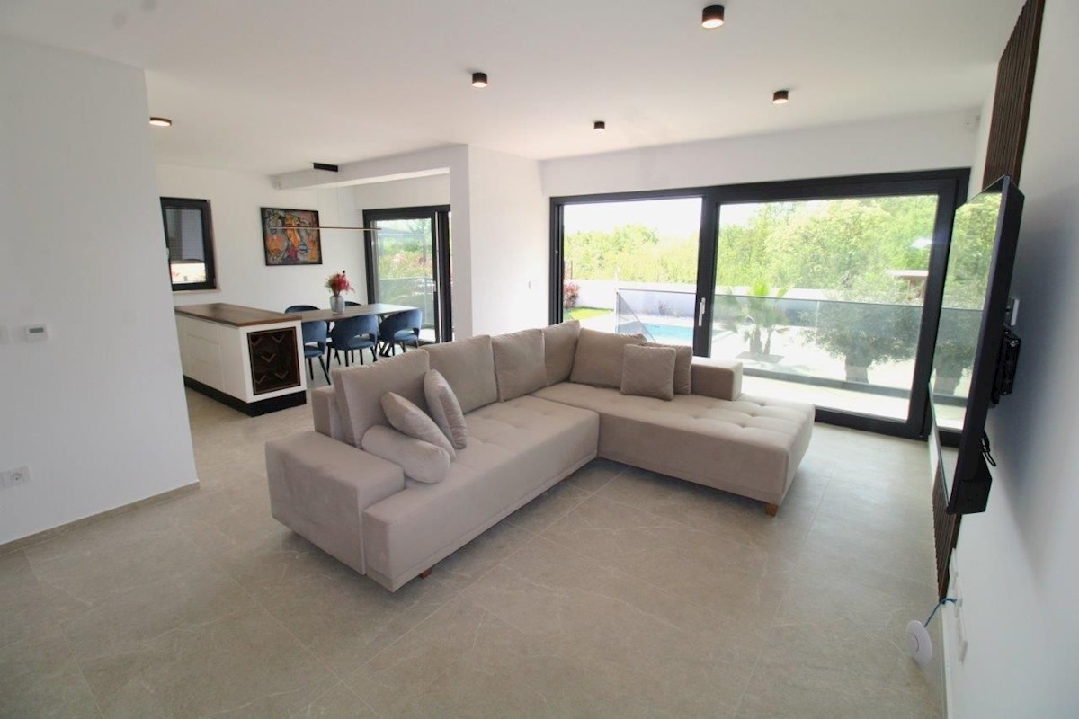 Ta lepa, moderna vila se nahaja v privlačnem naselju in na mirni lokaciji v predmestju Poreča.Vila ima 217,43 m2 bivalne površine in se nahaja na zemljišču velikosti 707 m2.V kletnih prostorih je telovadnica, prostor za sprostitev s savno, tušem in WC-jem