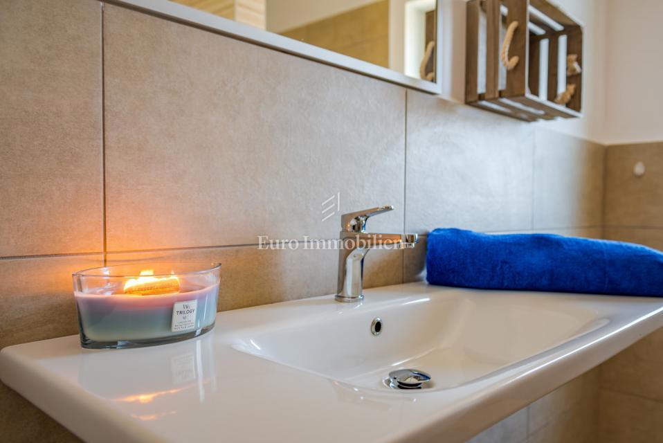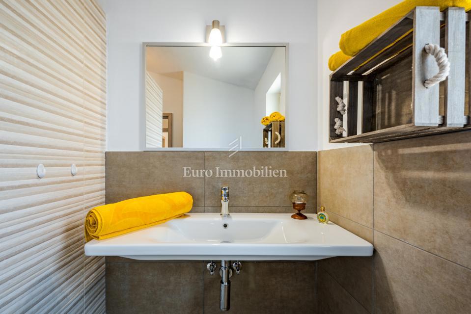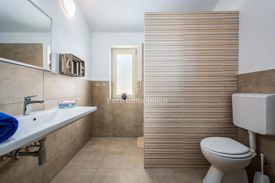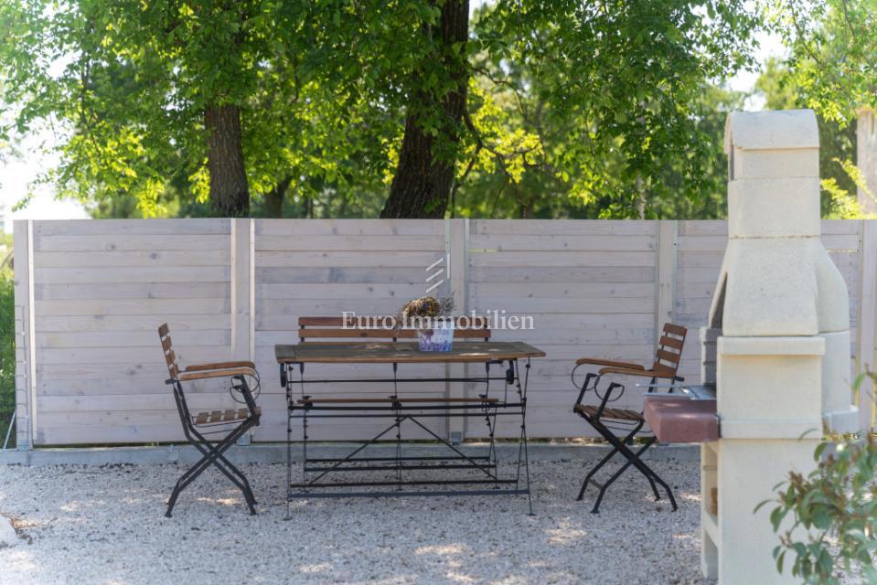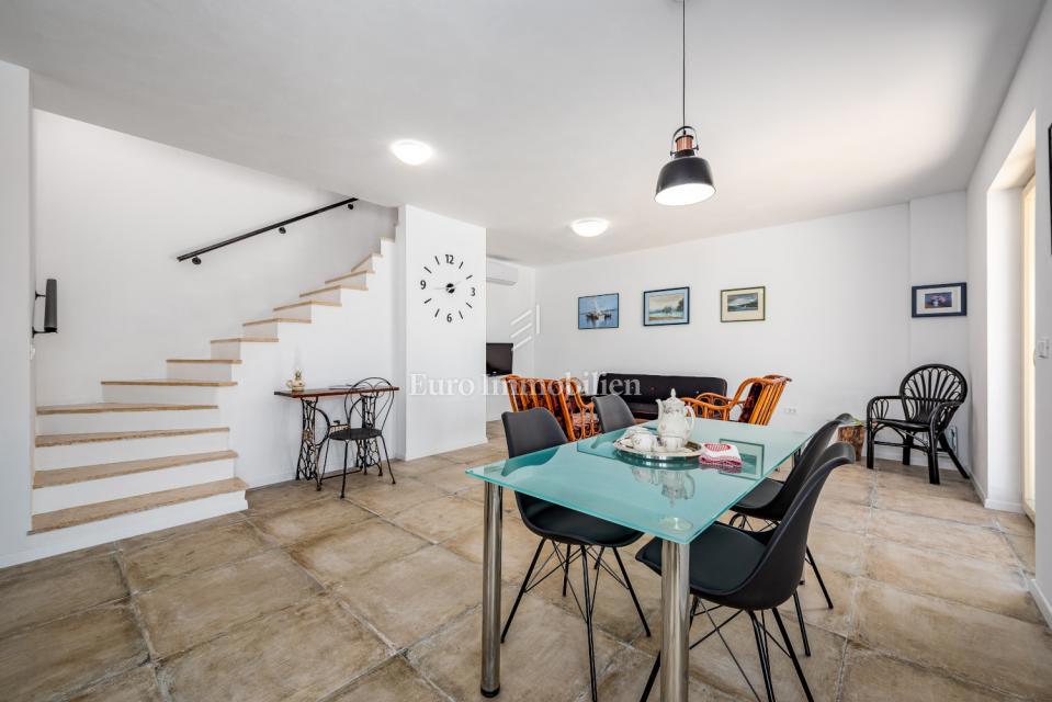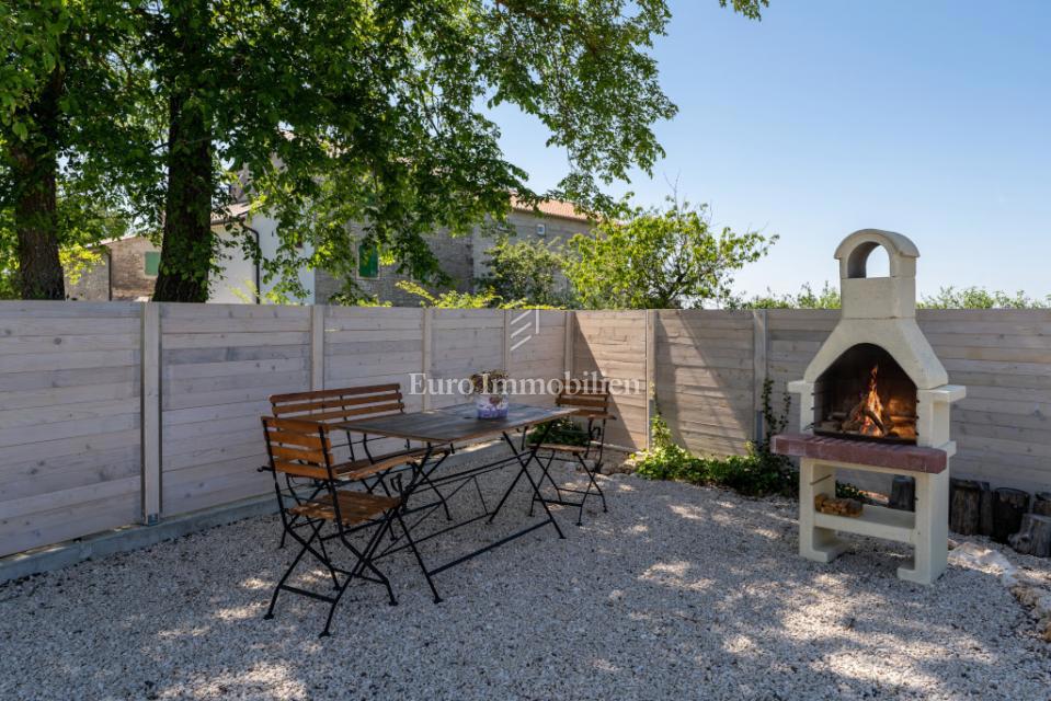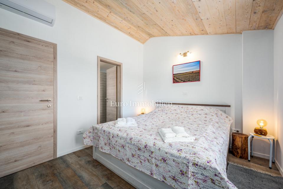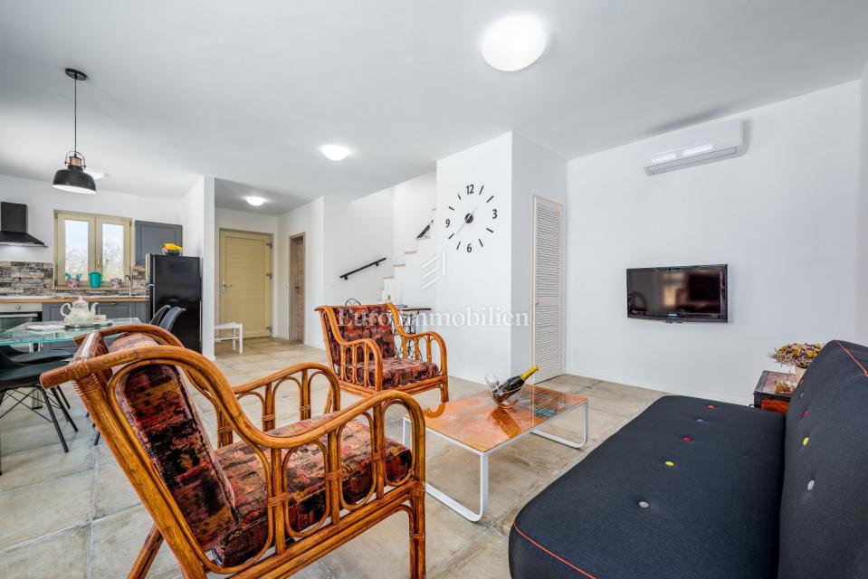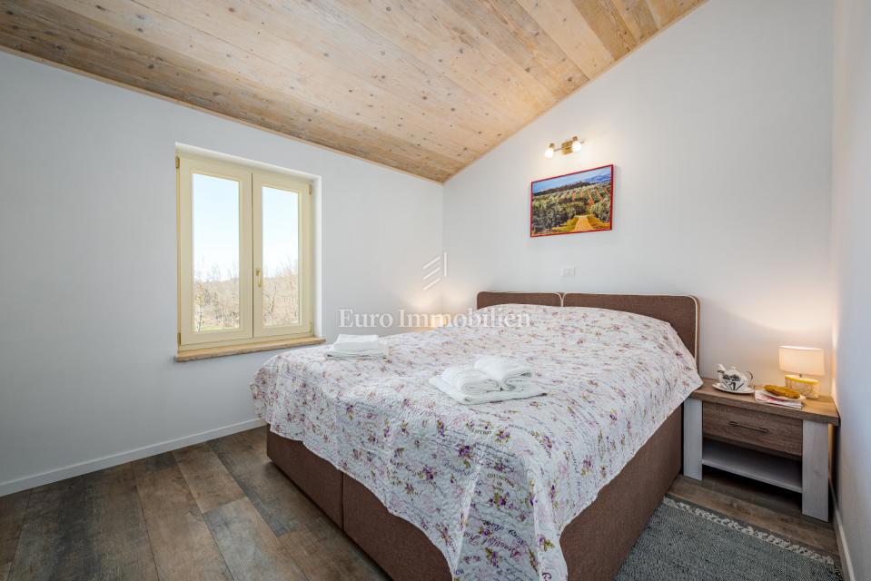 Prodamo samostojno hišo na mirni lokaciji, obdani z naravo in zelenjem v bližini Poreča. Ima 106 m2 in obsega predsobo, WC, shrambo, kuhinjo, jedilnico in dnevno sobo z izhodom na dvorišče, kjer se nahaja bazen in lepo urejen vrt. Notranje stopnice vodijo