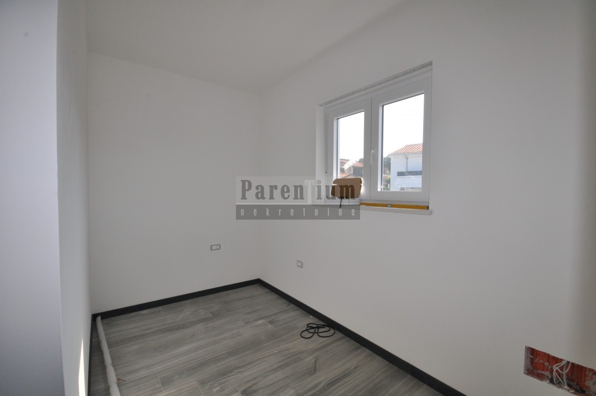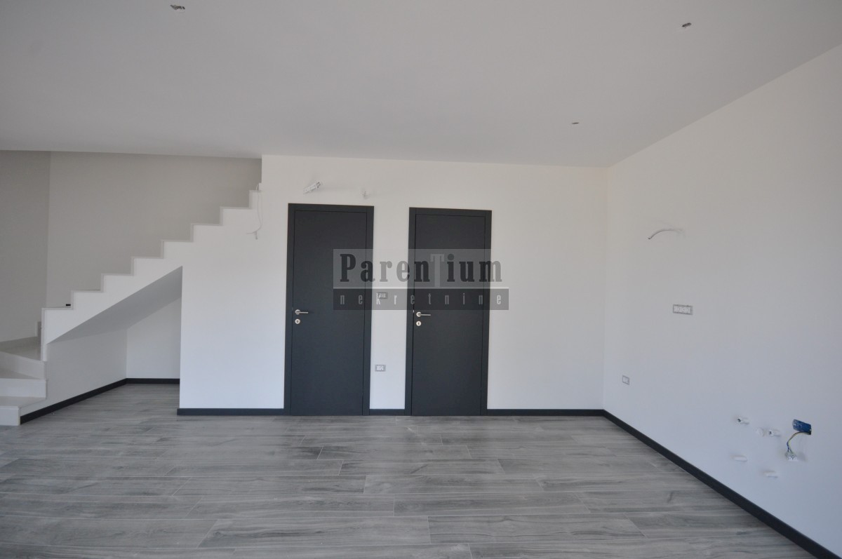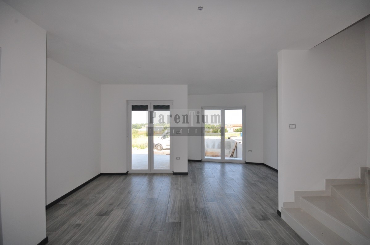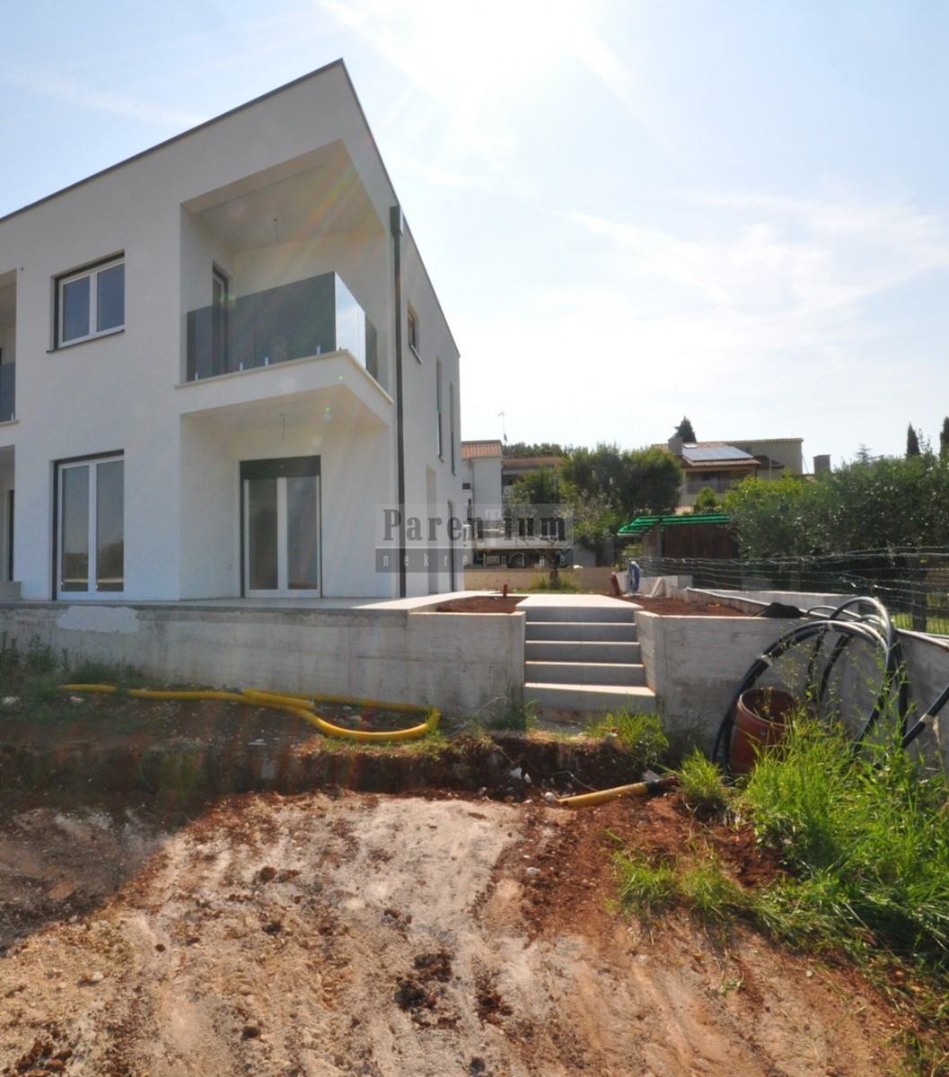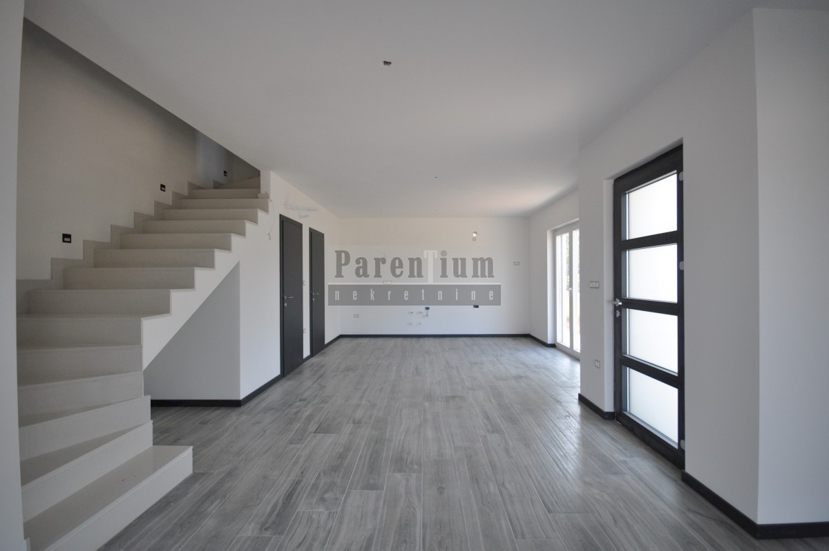 Poreč, bližje centru Prodamo moderno novo hišo dvojček, ki se nahaja na cca. 4,5 km od mesta Poreč in morja. Hiša se nahaja na obrobju vasi z odprtim pogledom na naravo in morje. Hiša v izmeri 96m2, v dveh etažah. V pritličju hiše je dnevna soba, kuhinja