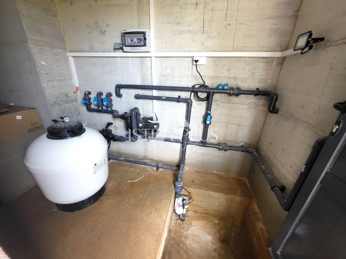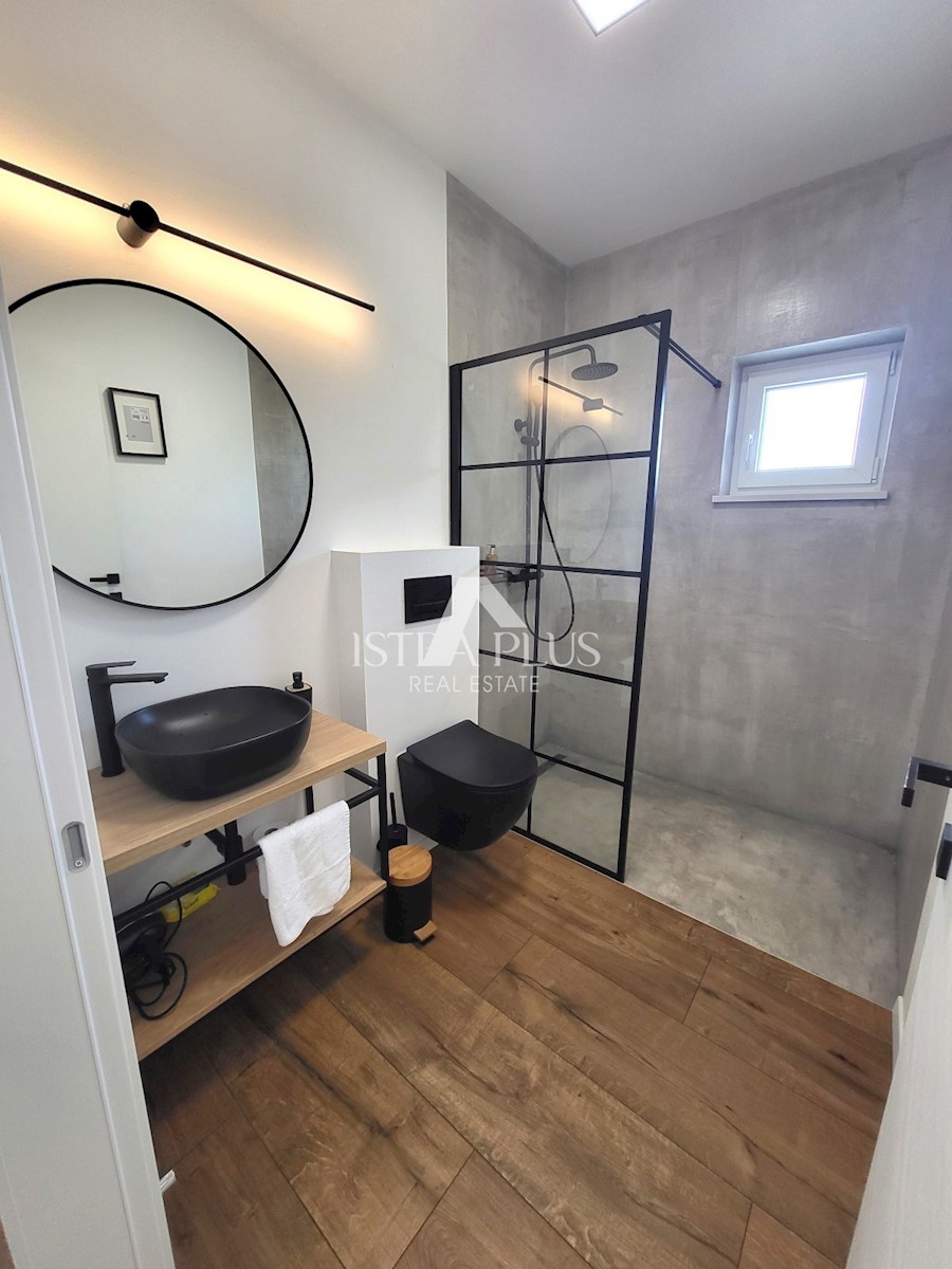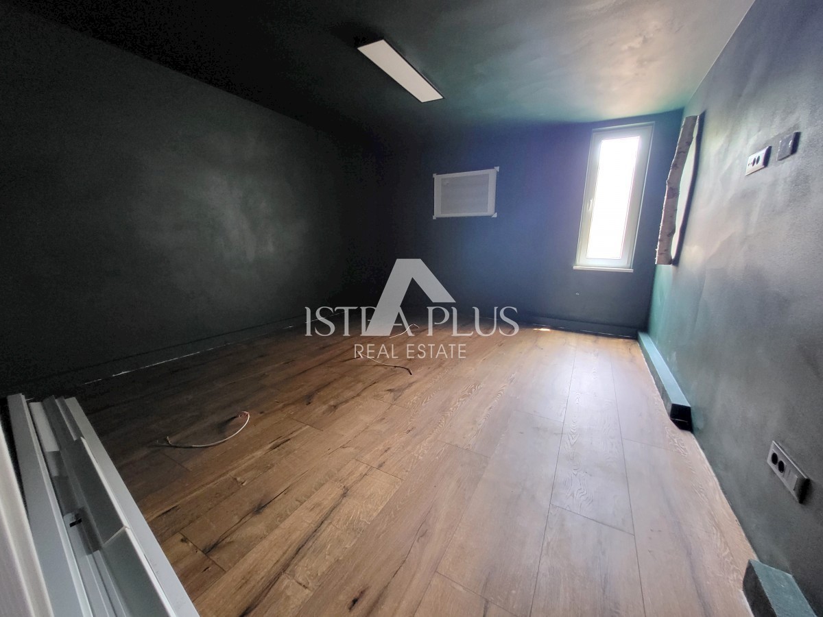 K214 Hiša z bazenom in prostornim dvoriščem - blizu Poreča Hiša je sestavljena iz kleti, pritličja in nadstropja. V kletni etaži je tehnični prostor za bazen, nato prostor, kjer je savna, tuš, wc, prostor s fitnesom/igralnico ter kletni/shrambni prostor.