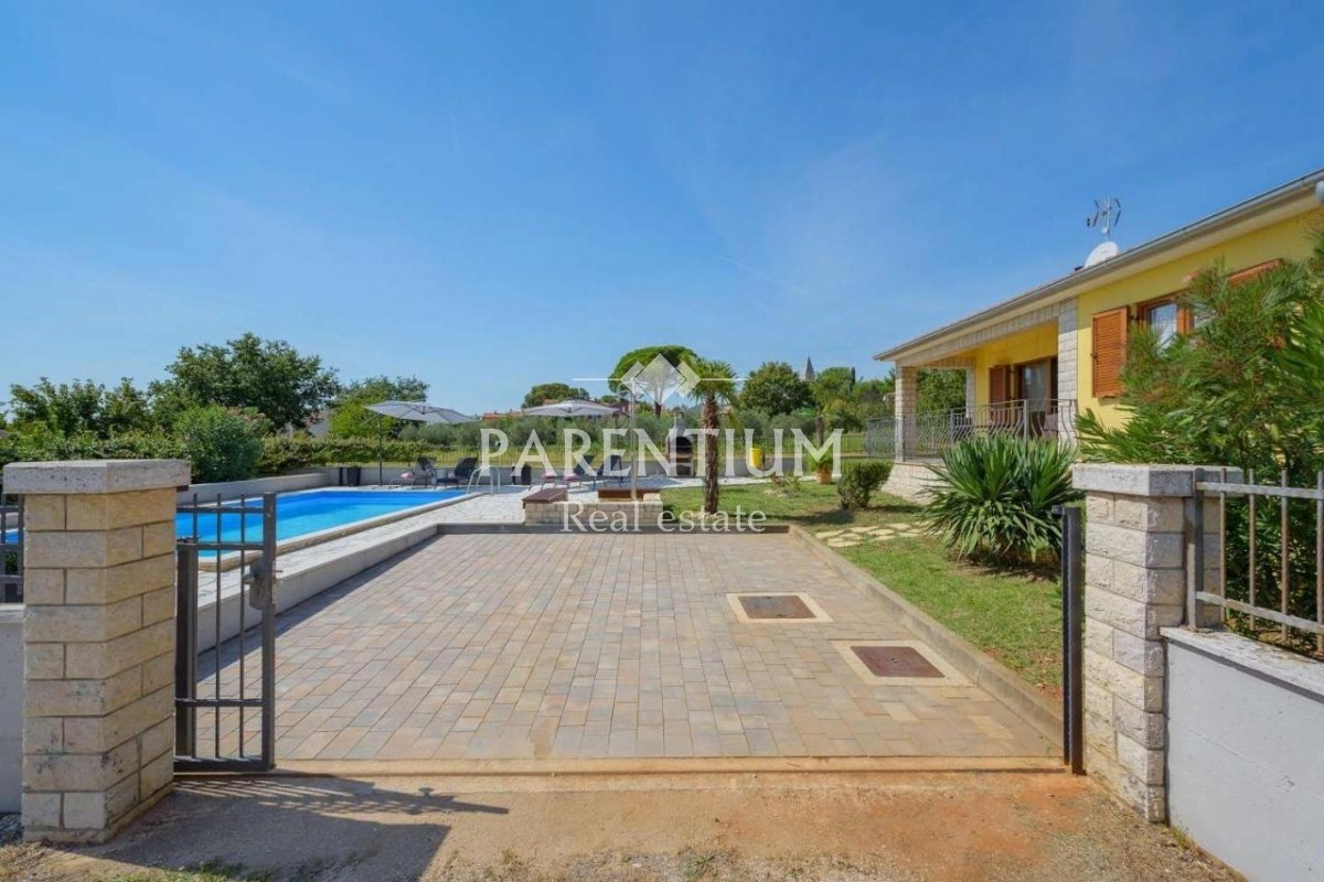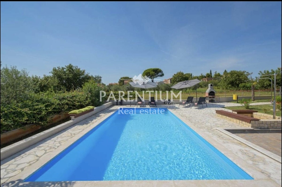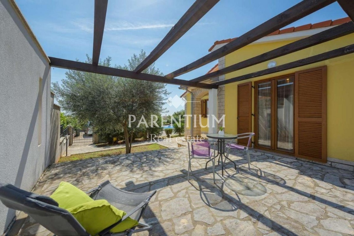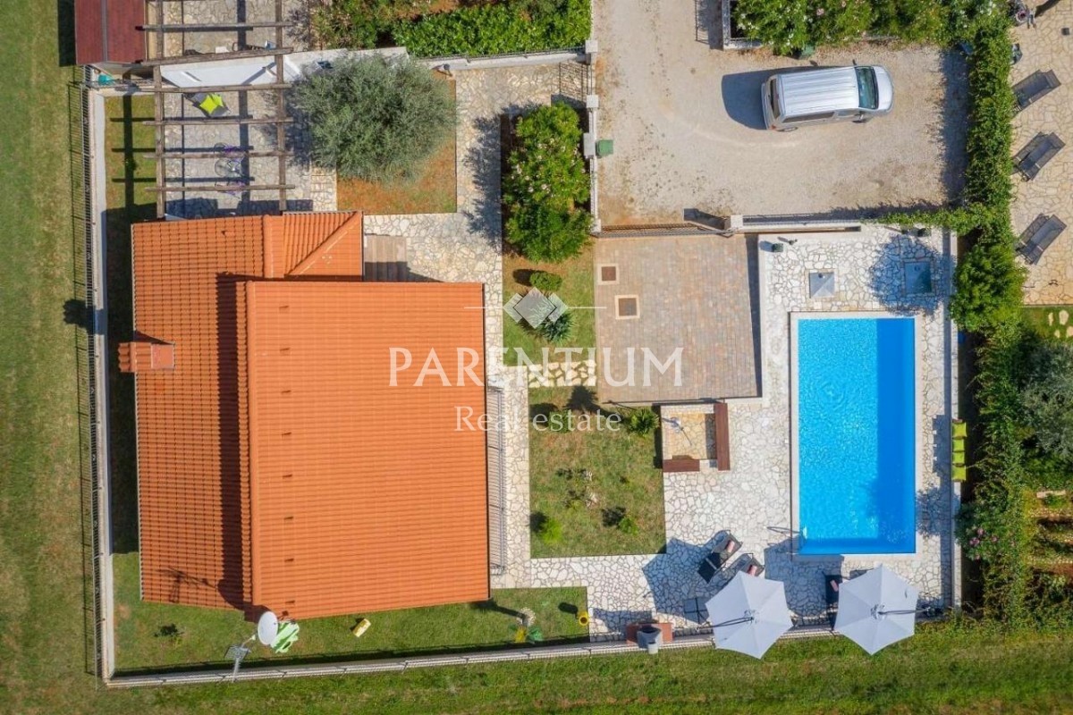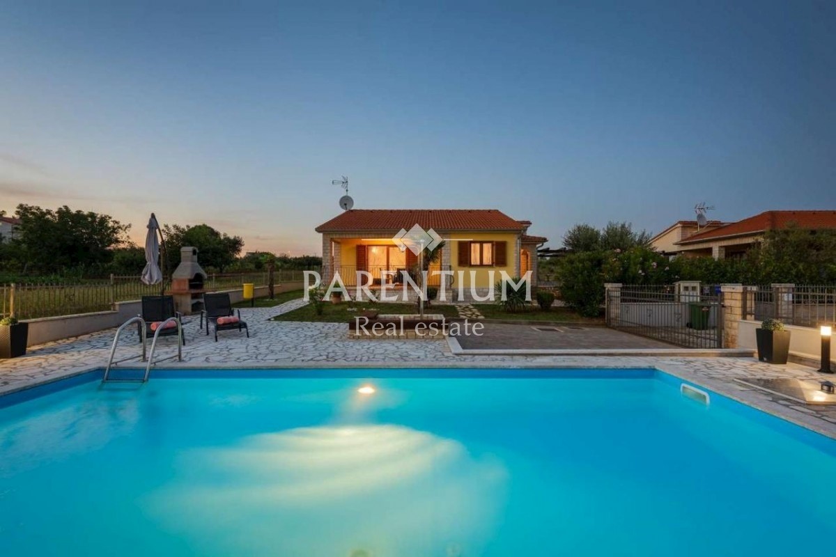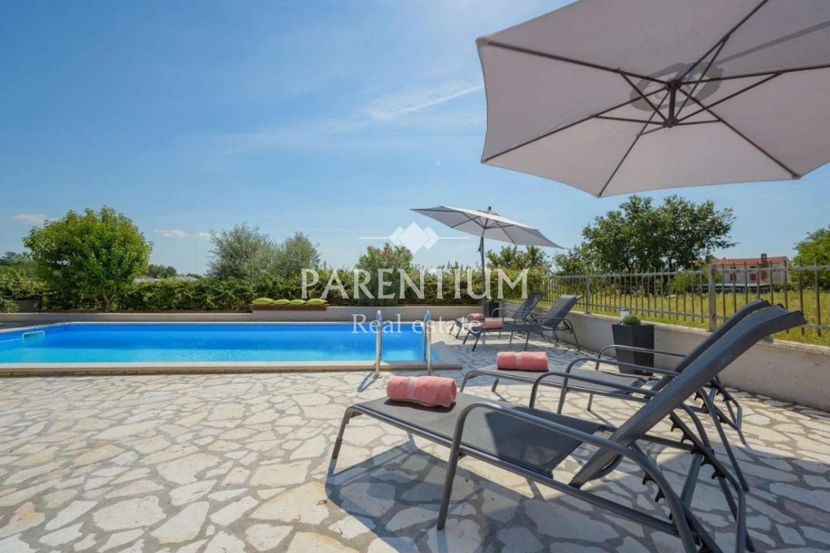 Istra, Poreč V okolici Poreča prodamo hišo v pritličju v skupni izmeri 110m2. Nahaja se na parceli velikosti 776m2, ki ima 32m2 bazen in lepo plažo s pokrito teraso. Hiša je sestavljena iz hodnika, dnevne sobe, kuhinje, jedilnice, 2 spalnici in kopalnice