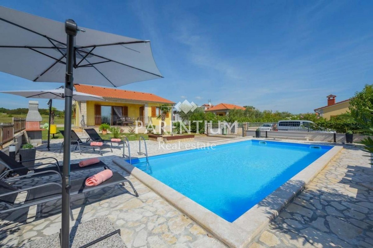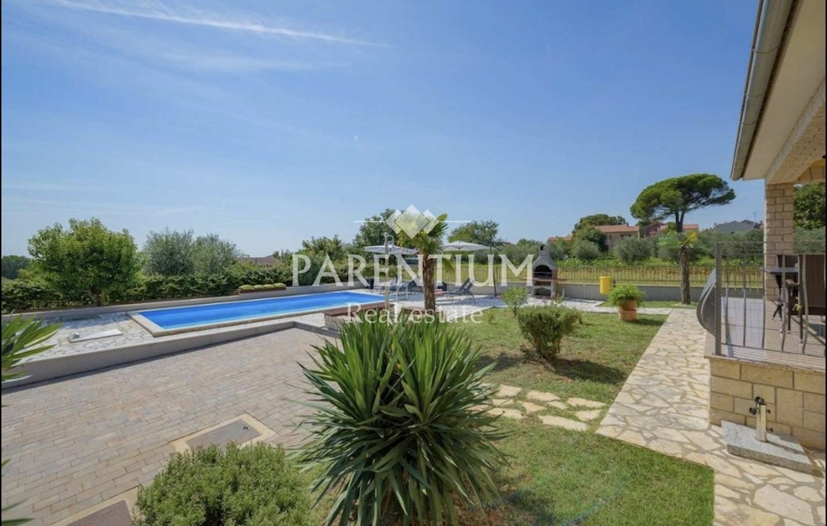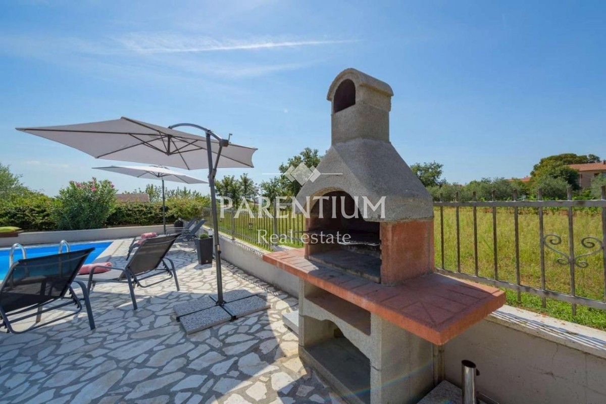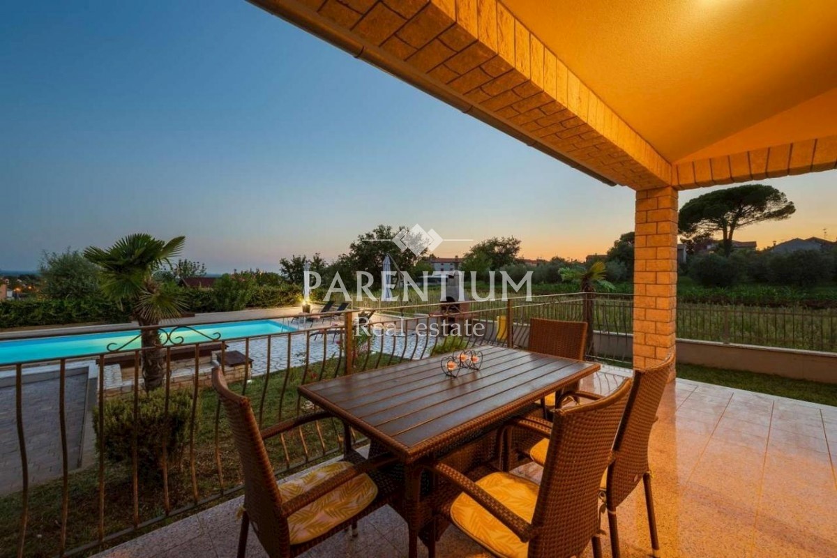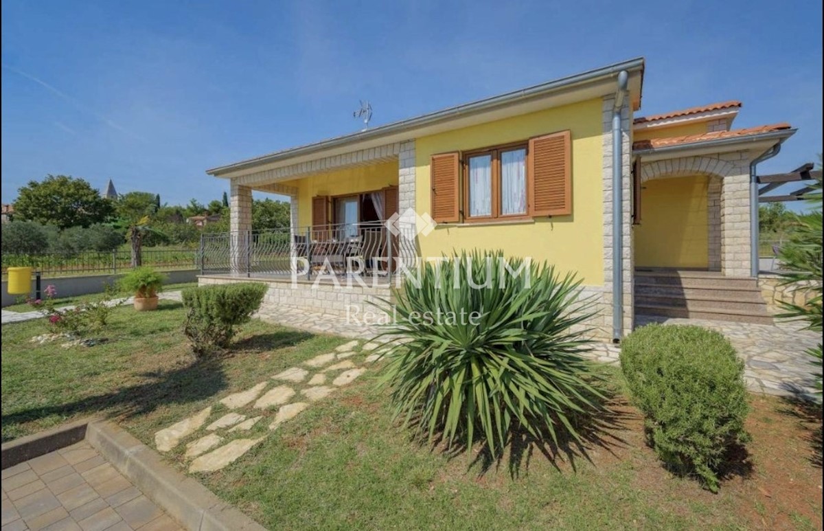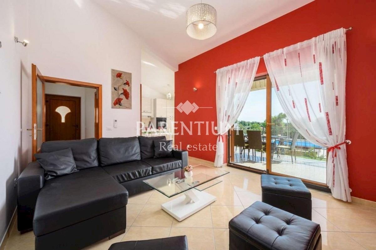 Istra, Poreč V okolici Poreča prodamo hišo v pritličju v skupni izmeri 110m2. Nahaja se na parceli velikosti 776m2, ki ima 32m2 bazen in lepo plažo s pokrito teraso. Hiša je sestavljena iz hodnika, dnevne sobe, kuhinje, jedilnice, 2 spalnici in kopalnice