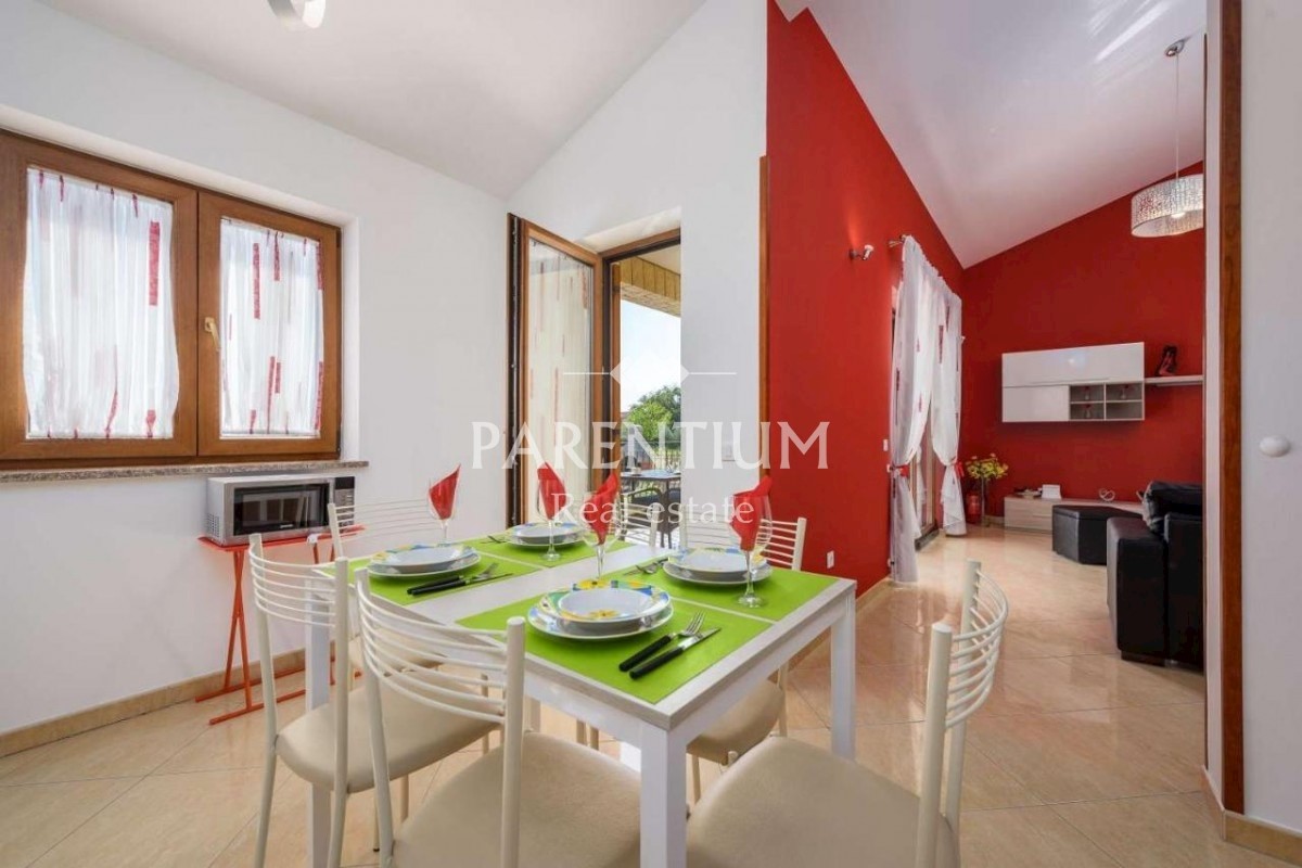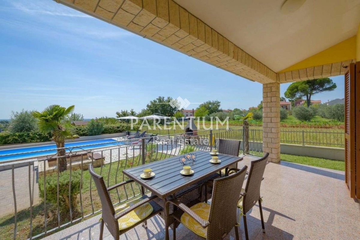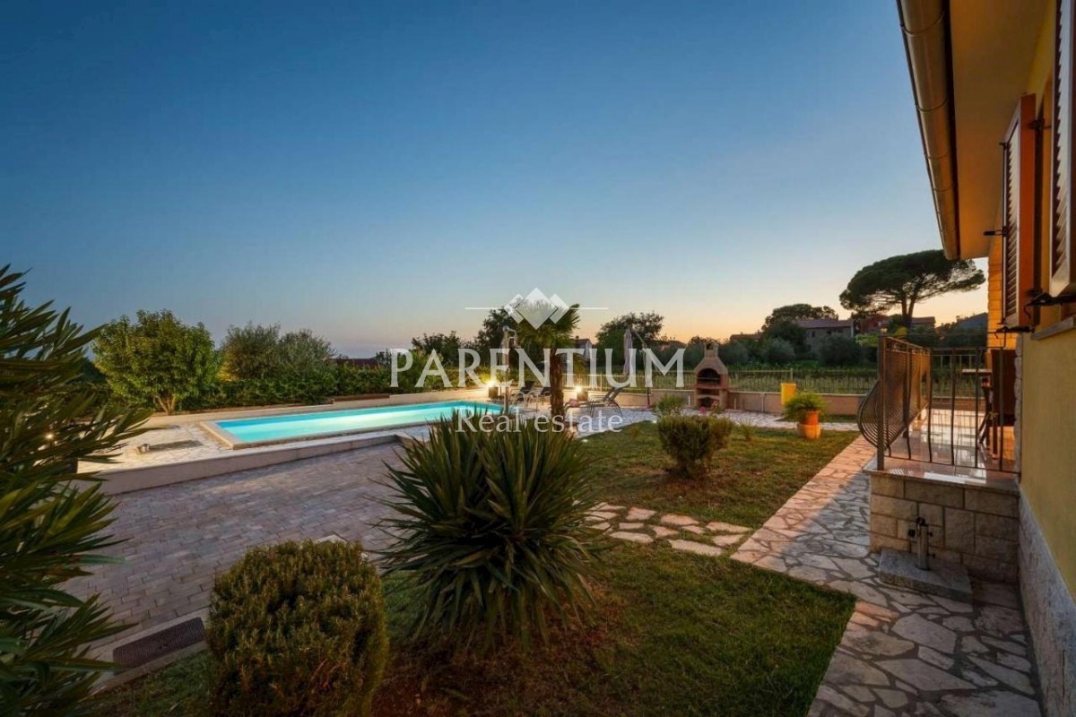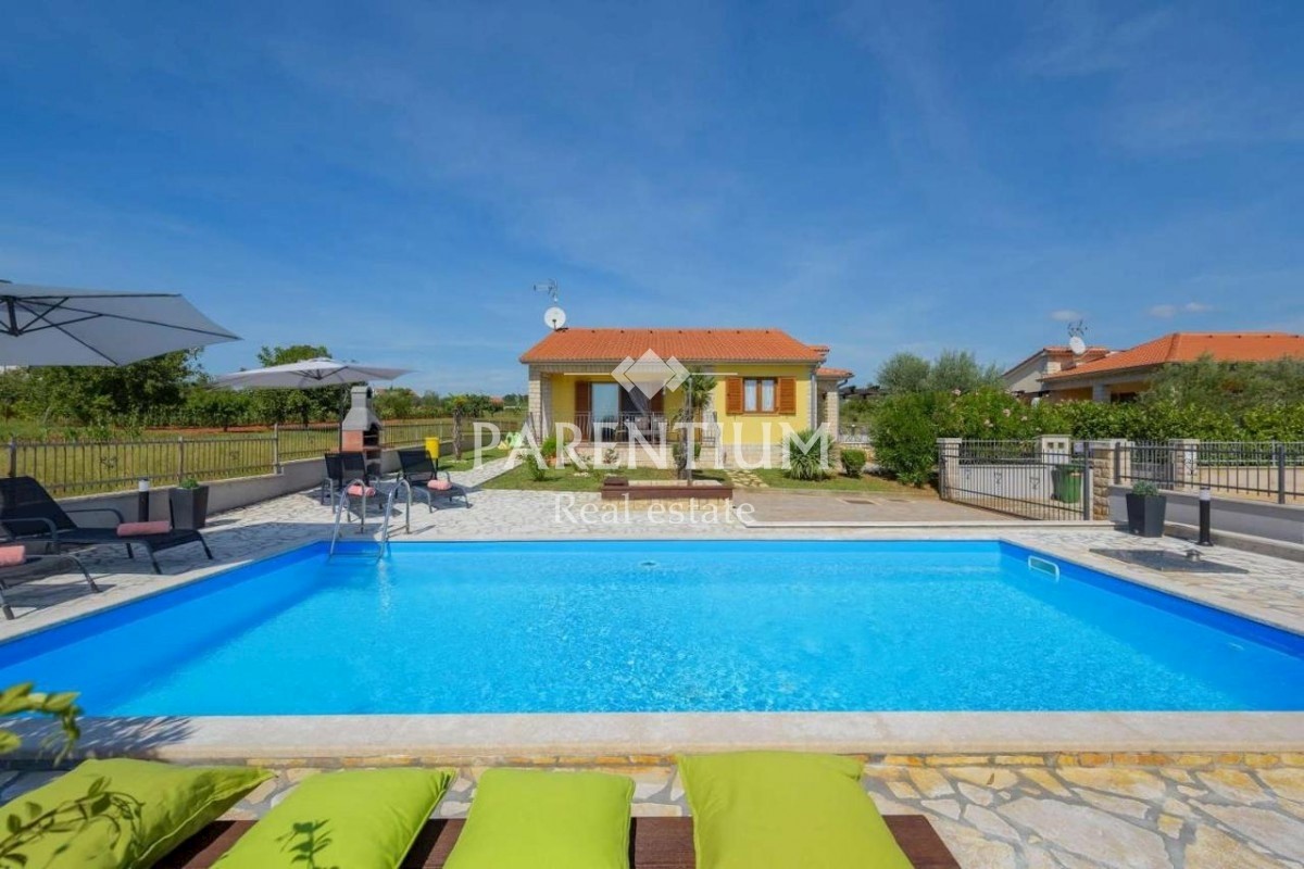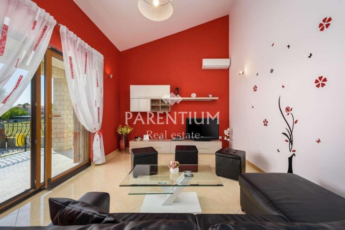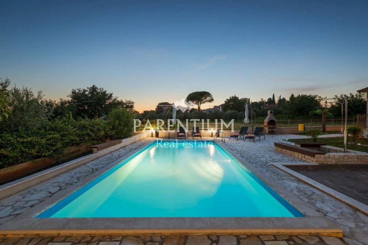 Istra, Poreč V okolici Poreča prodamo hišo v pritličju v skupni izmeri 110m2. Nahaja se na parceli velikosti 776m2, ki ima 32m2 bazen in lepo plažo s pokrito teraso. Hiša je sestavljena iz hodnika, dnevne sobe, kuhinje, jedilnice, 2 spalnici in kopalnice