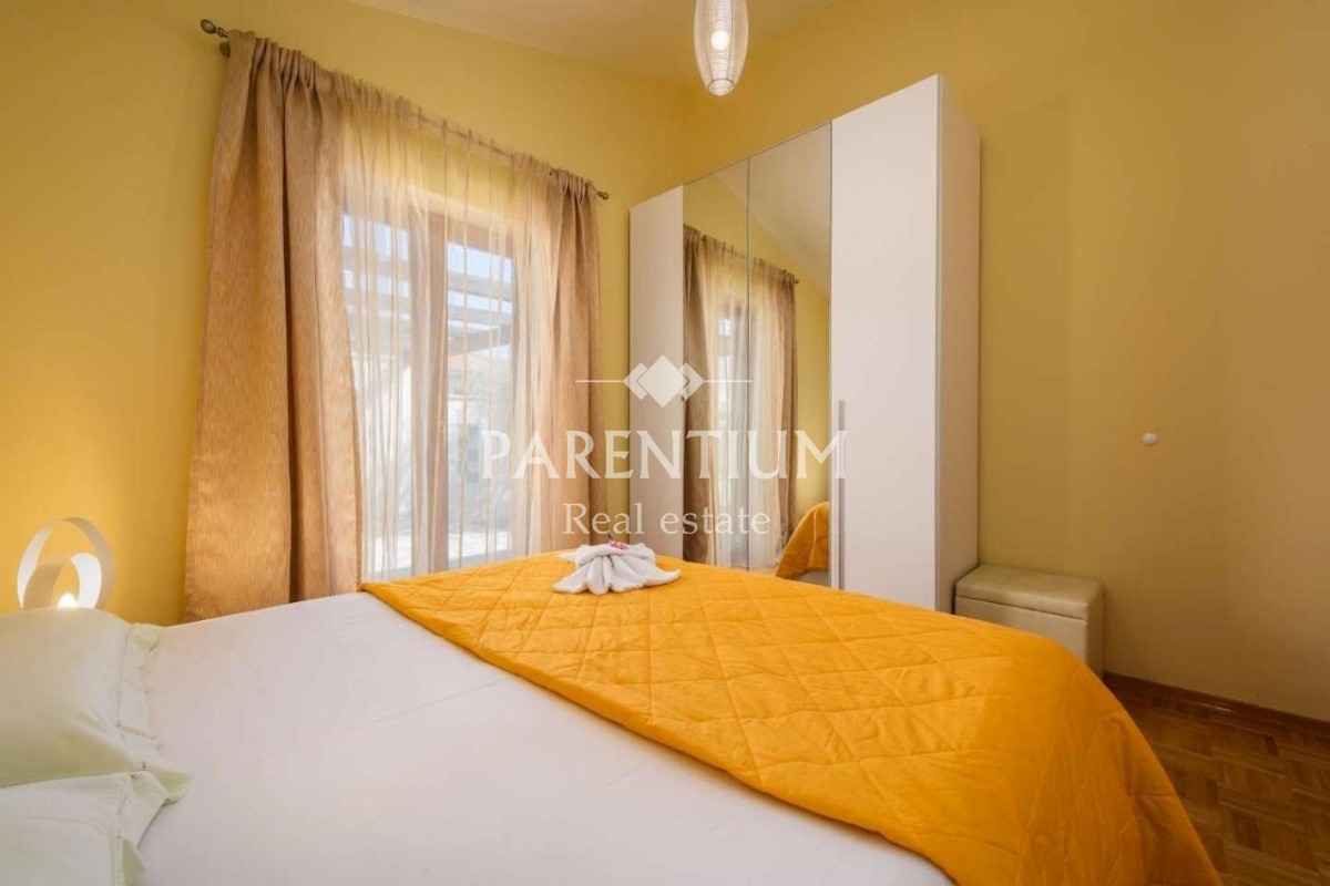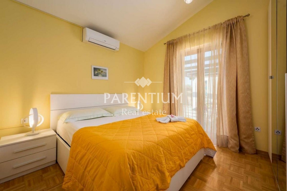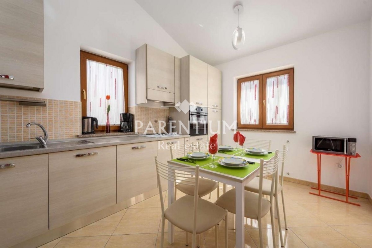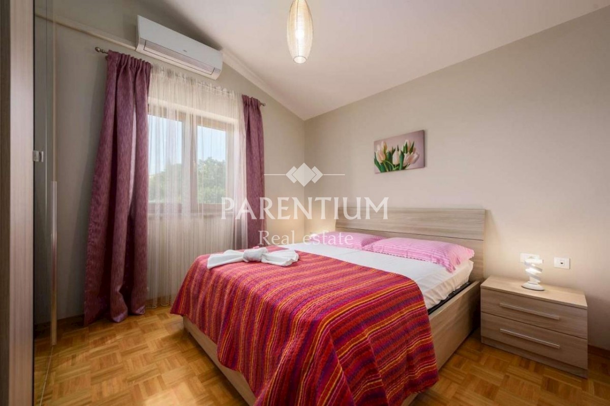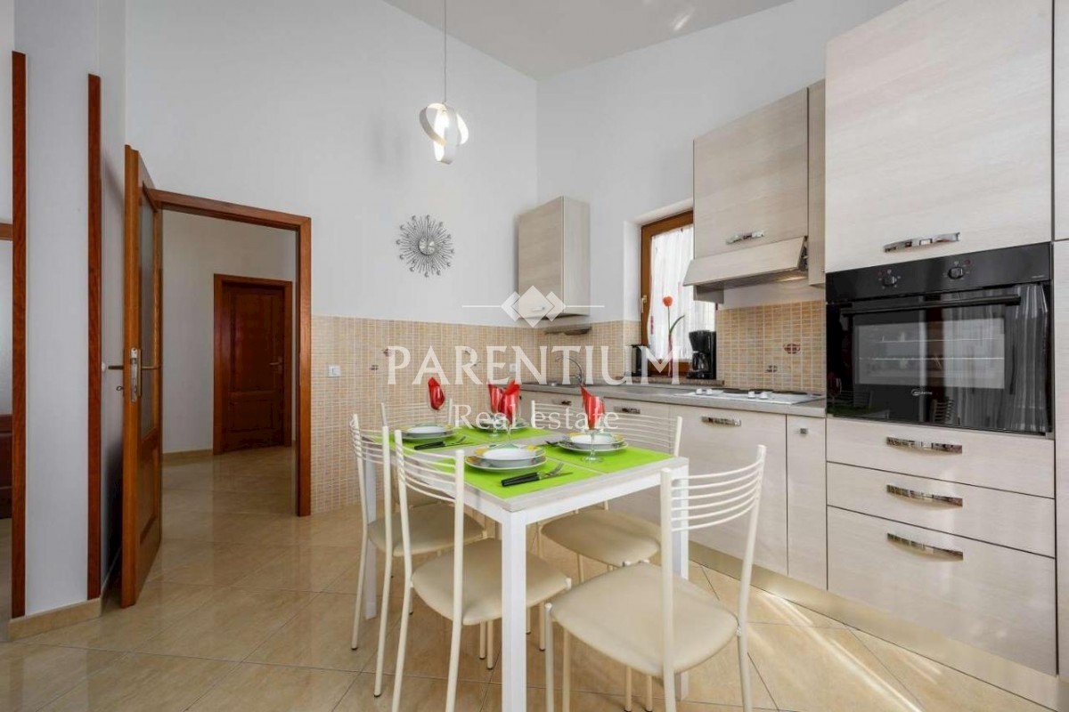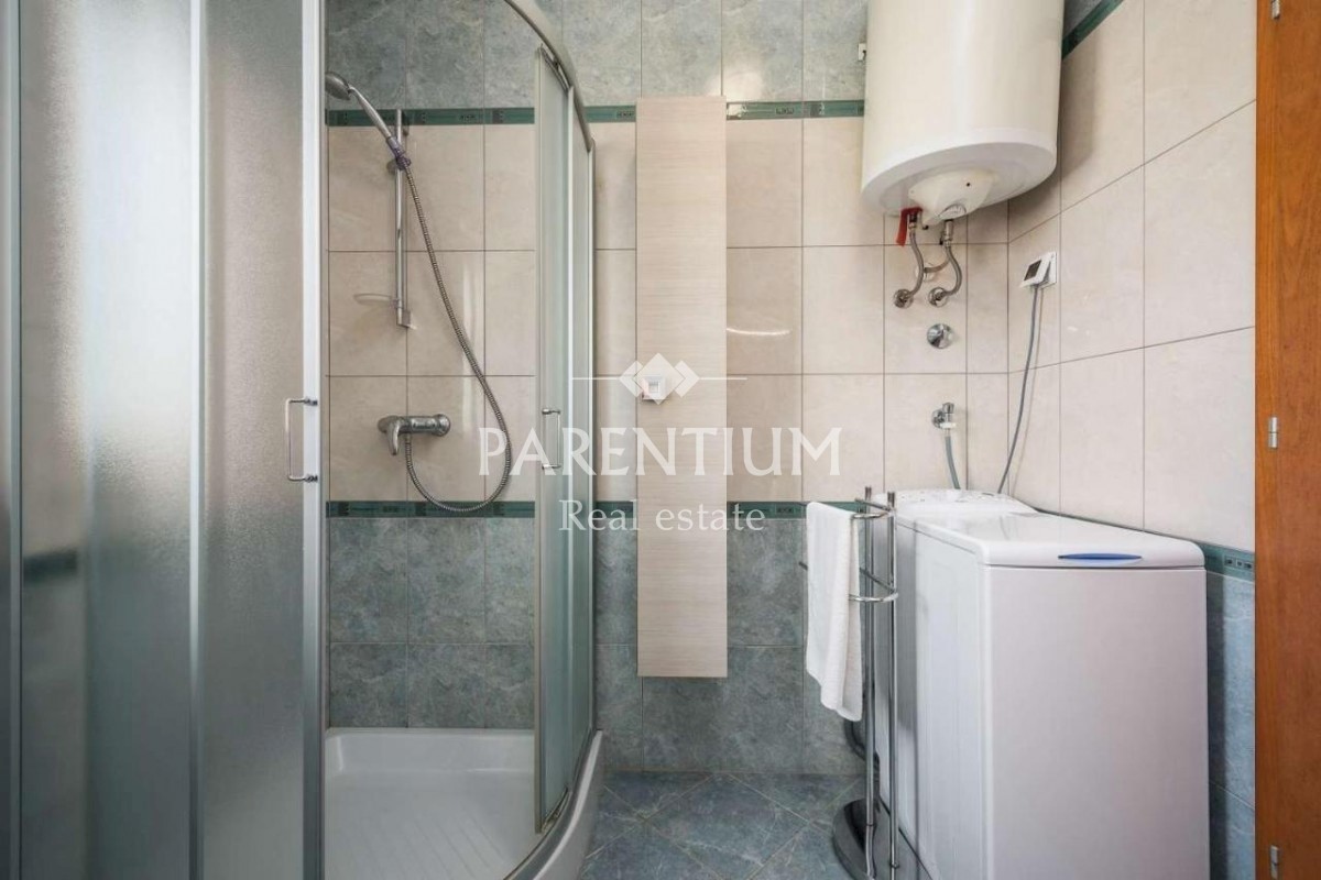 Istra, Poreč V okolici Poreča prodamo hišo v pritličju v skupni izmeri 110m2. Nahaja se na parceli velikosti 776m2, ki ima 32m2 bazen in lepo plažo s pokrito teraso. Hiša je sestavljena iz hodnika, dnevne sobe, kuhinje, jedilnice, 2 spalnici in kopalnice
