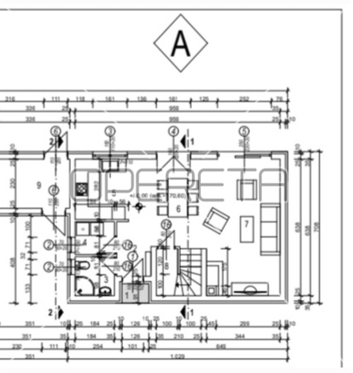 ISTRA, POREČ (okolica) – Hiša na koncu niza s pogledom na morjeTa družinska hiša se nahaja v majhnem istrskem mestu nedaleč od Poreča, na koncu niza, z lastnim vrtom in bazenom.Hiša A, stanovanjske površine 170 m2 in 500 m2 vrta.Pritličje obsega predsobo,