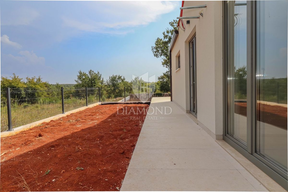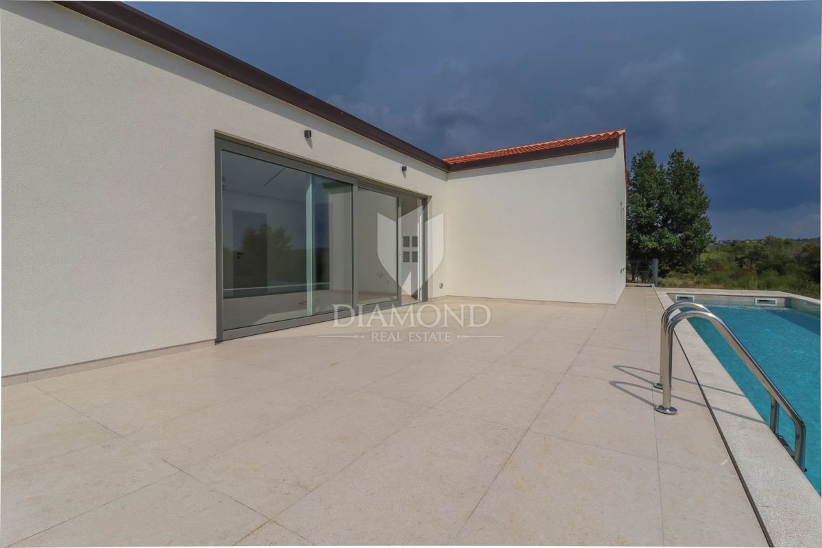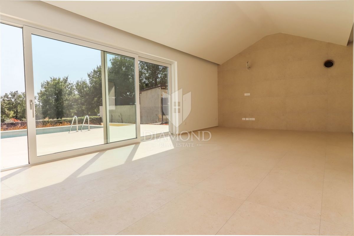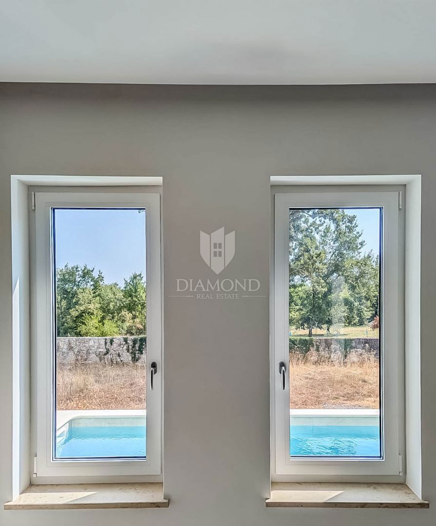 Poreč, okolica, pritlična hiša z bazenom na robu naselja! Le 15 minut vožnje od središča Poreča, Vrsarja in prvih plaž ter 30 minut od Rovinja, se nahaja ta fantastična pritlična hiša. Hiša s skupno neto površino 114 m² ponuja potrebno udobje, medtem ko