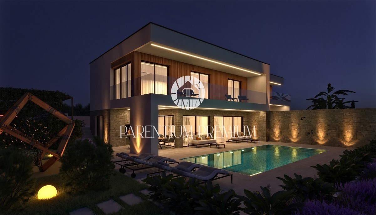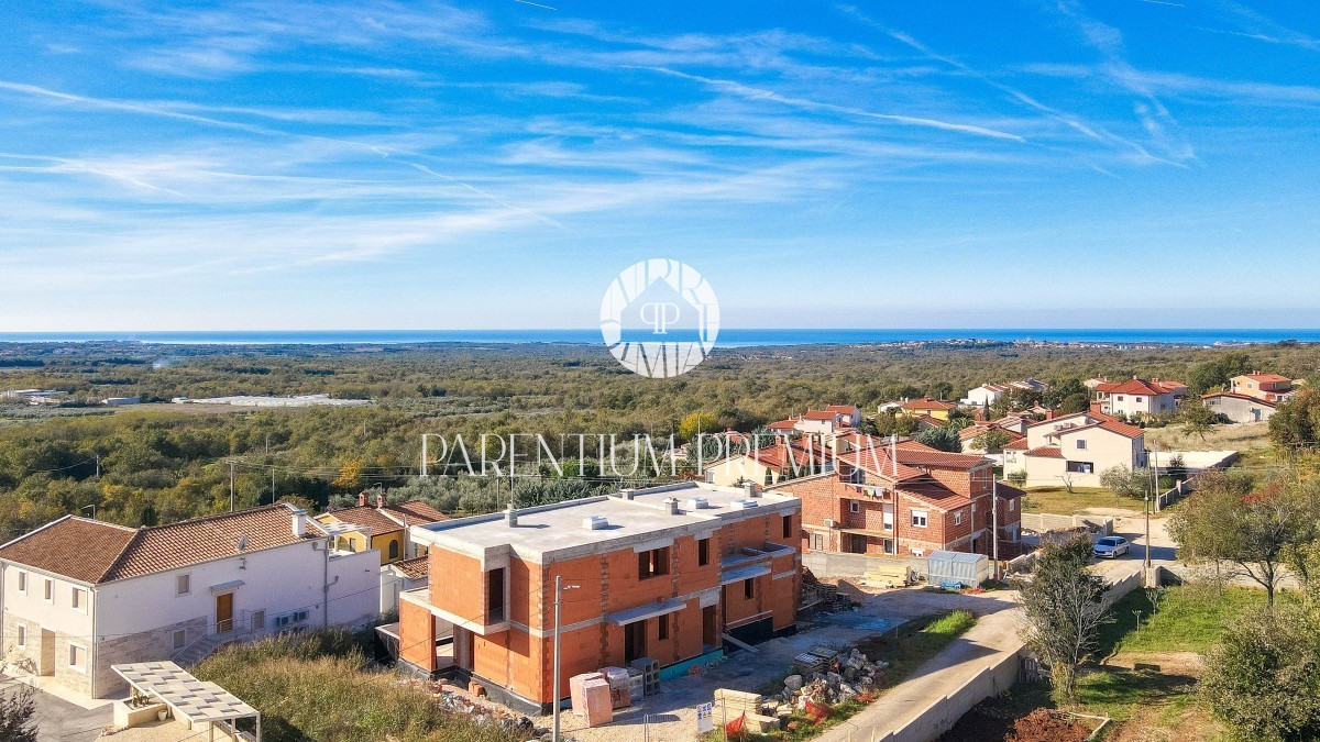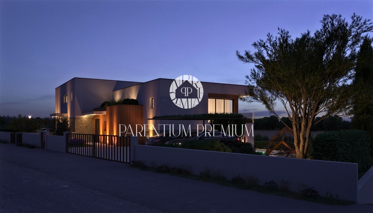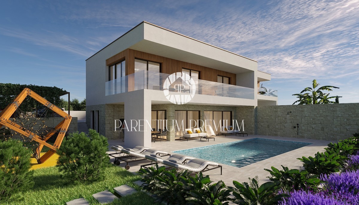 Istra, Poreč - pogled na morje okolica! Ta moderen in izjemno kvaliteten dvojček z ogrevanim bazenom in pogledom na morje, skupne površine 183,21m2, se nahaja na lepi in iskani lokaciji. Hiša je razdeljena na 2 etaži. Pritličje je sestavljeno iz odprte