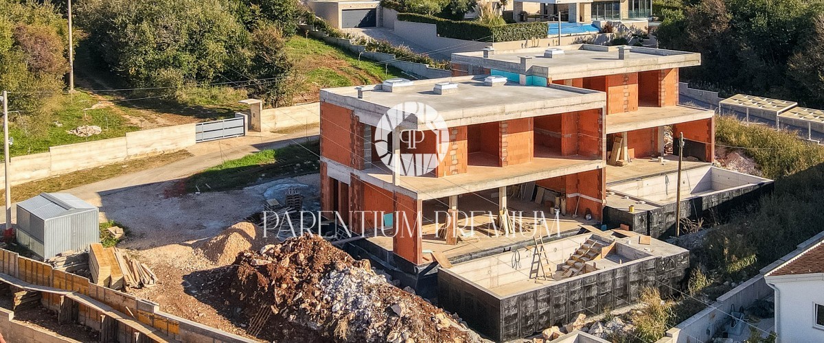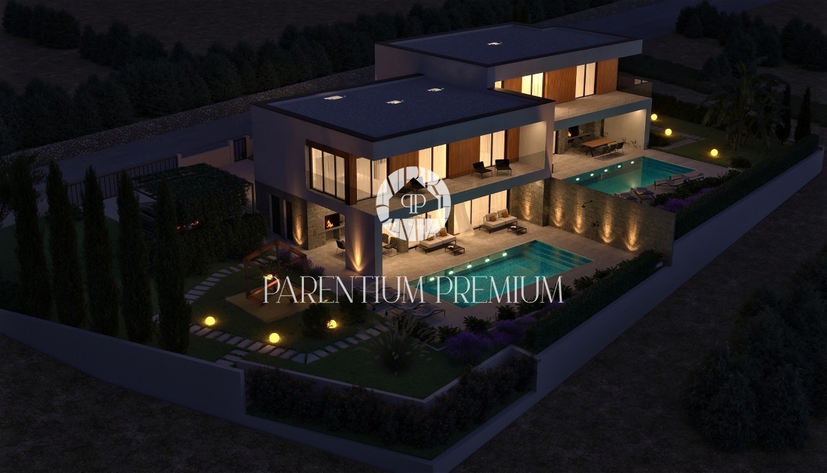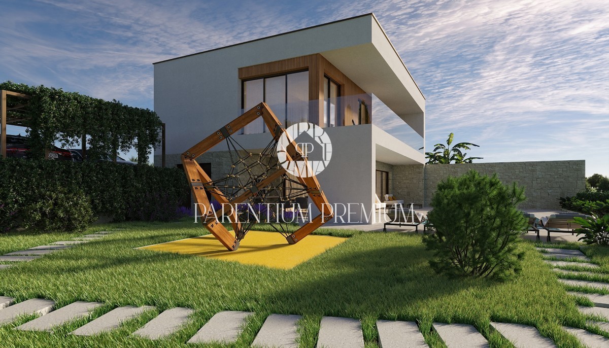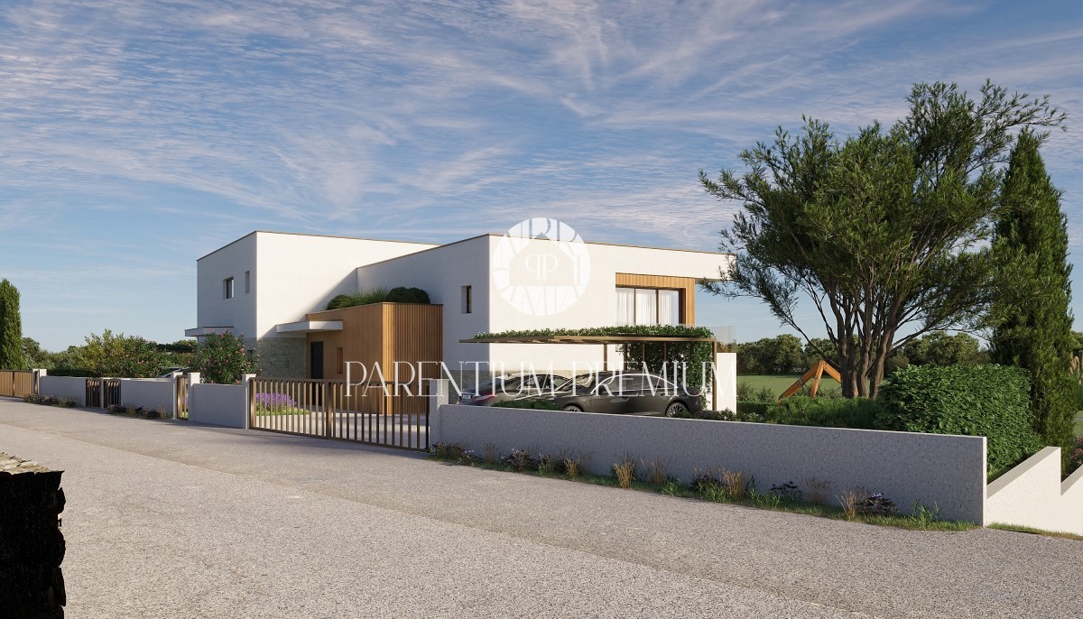 Istra, Poreč - pogled na morje okolica! Ta moderen in izjemno kvaliteten dvojček z ogrevanim bazenom in pogledom na morje, skupne površine 183,21m2, se nahaja na lepi in iskani lokaciji. Hiša je razdeljena na 2 etaži. Pritličje je sestavljeno iz odprte