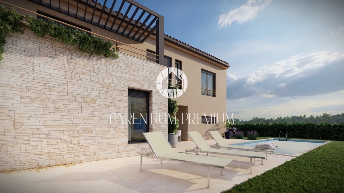 Istra, okolica Poreča Vila z bazenom 3 km od Baderne in 15 km od centra Poreča in morja. Vila ima skupno površino 148,84 m2, nahaja se na zemljišču 698 m2 in se razteza v dveh etažah. Pritličje obsega predsobo, spalnico, kopalnico, shrambo, kuhinjo z jed