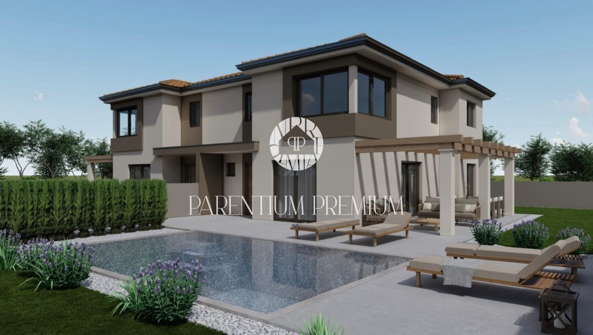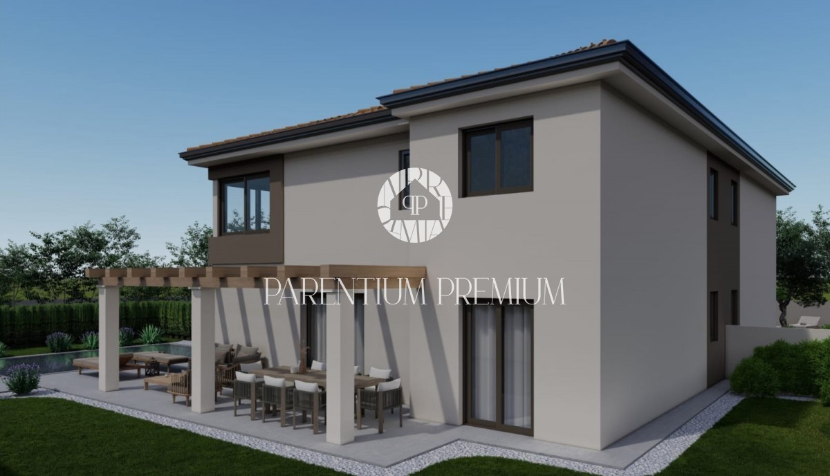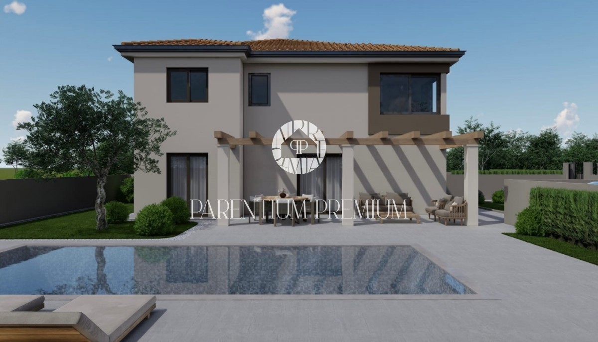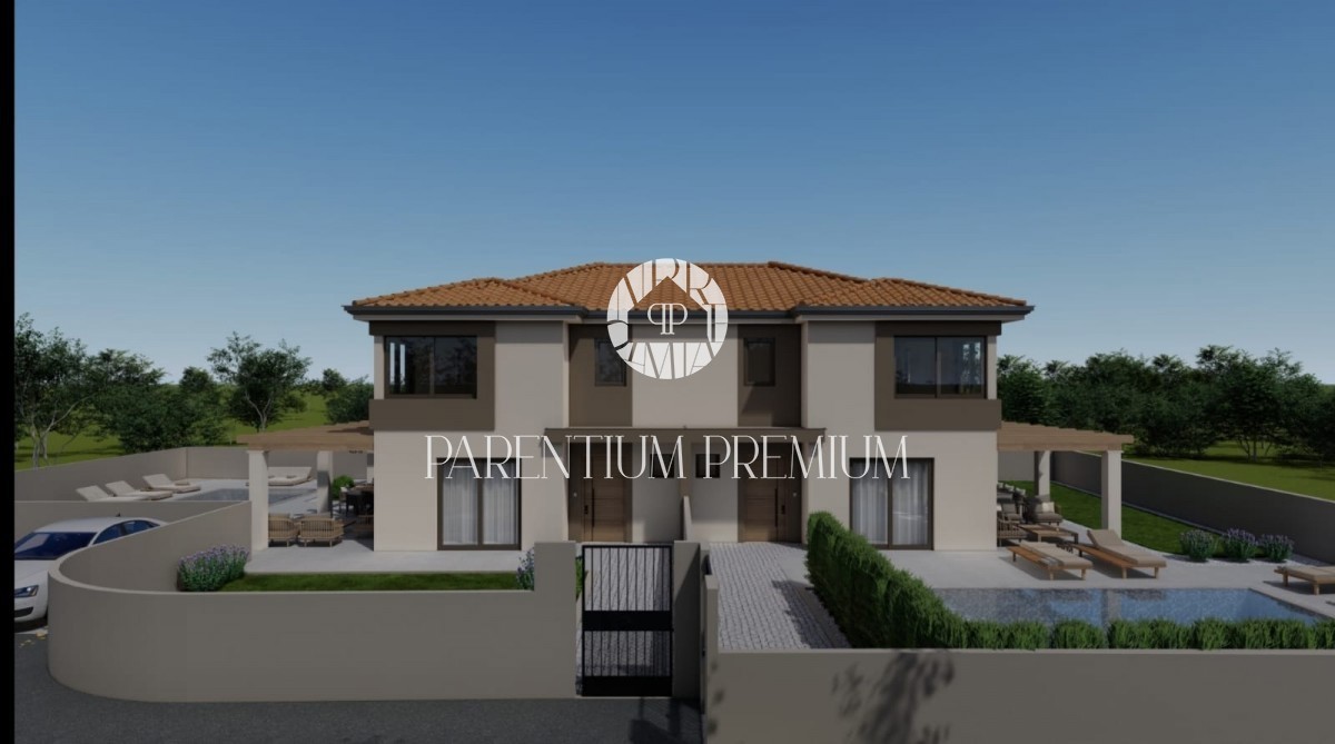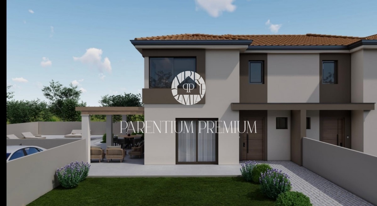 Istra, okolica Poreča Prodamo moderno hišo dvojček na mirni lokaciji v bližini Poreča, 10 km od morja. Hiša ima 137,50m2 neto površine in se razteza v dveh etažah. Pritličje sestoji iz pokritega vhoda, predprostora, stranišča za goste, prostorne spalnice