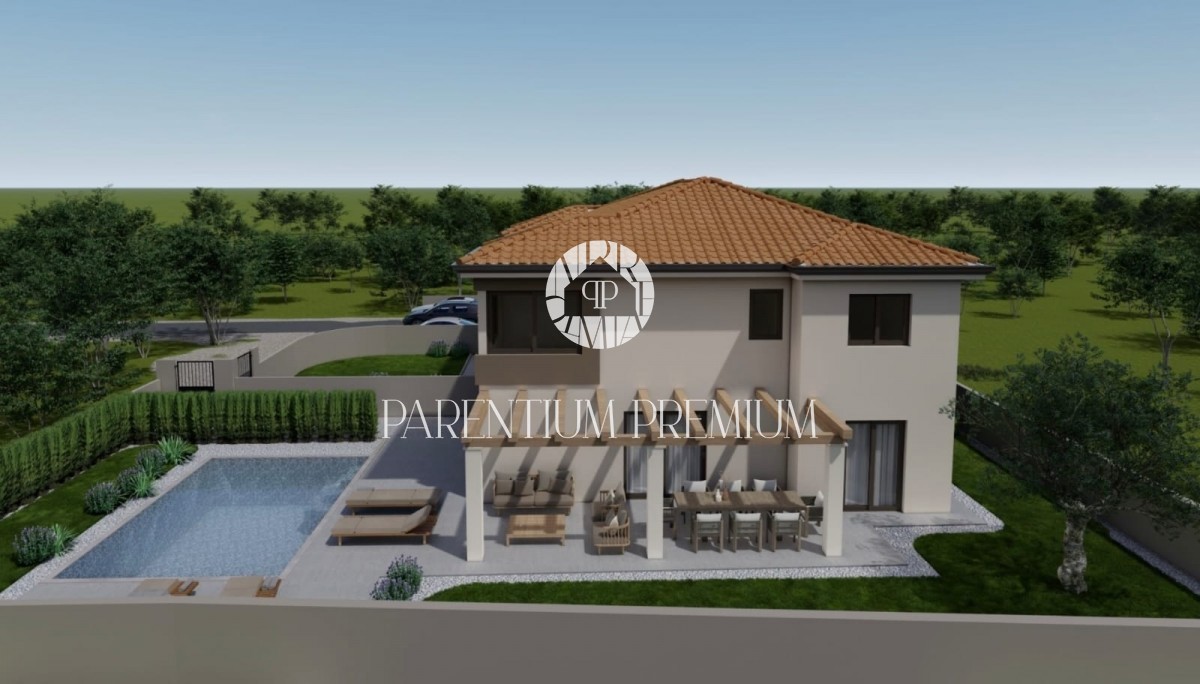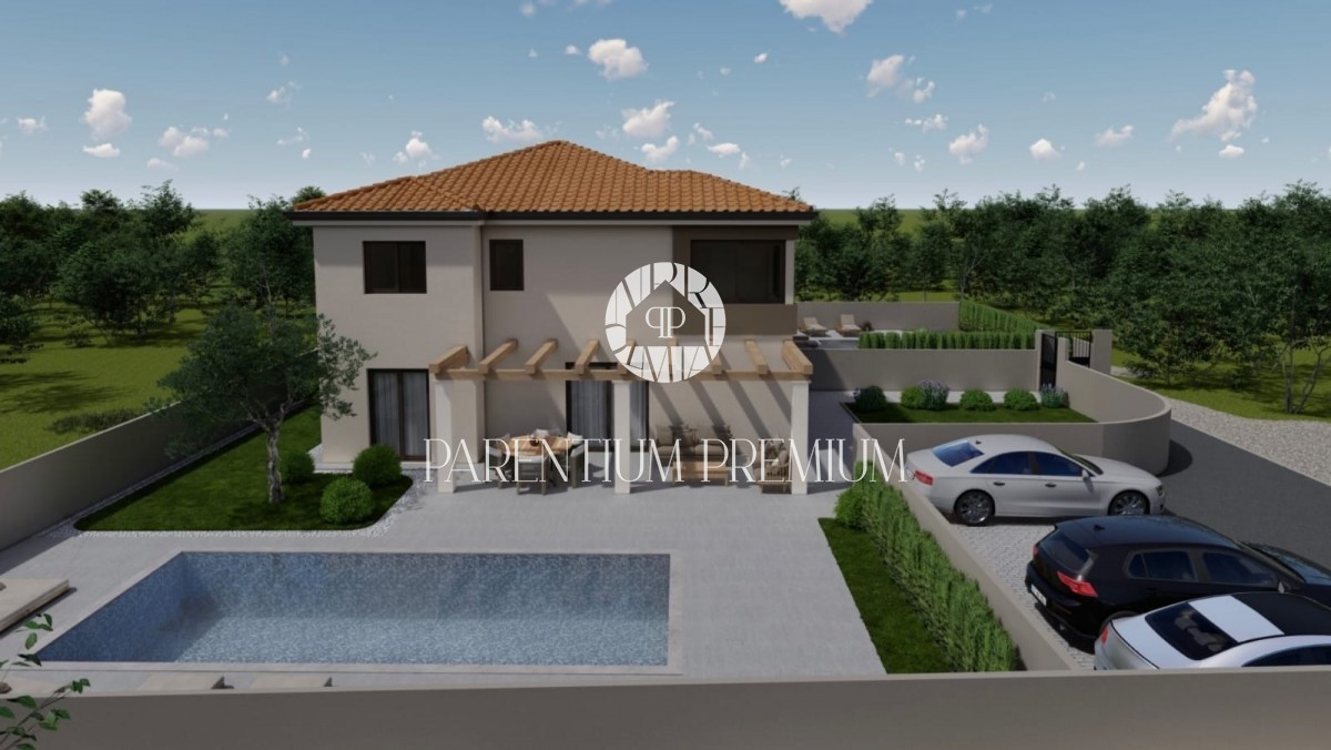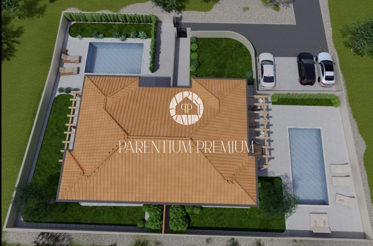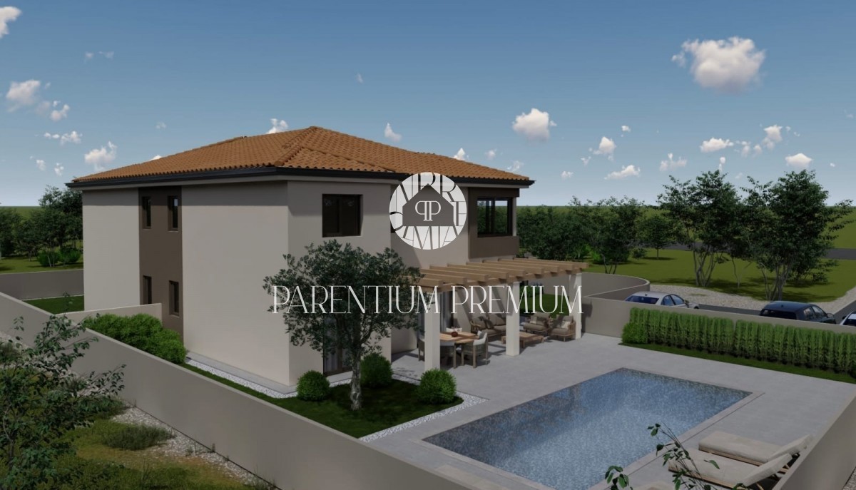Istra, okolica Poreča Prodamo moderno hišo dvojček na mirni lokaciji v bližini Poreča, 10 km od morja. Hiša ima 137,50m2 neto površine in se razteza v dveh etažah. Pritličje sestoji iz pokritega vhoda, predprostora, stranišča za goste, prostorne spalnice