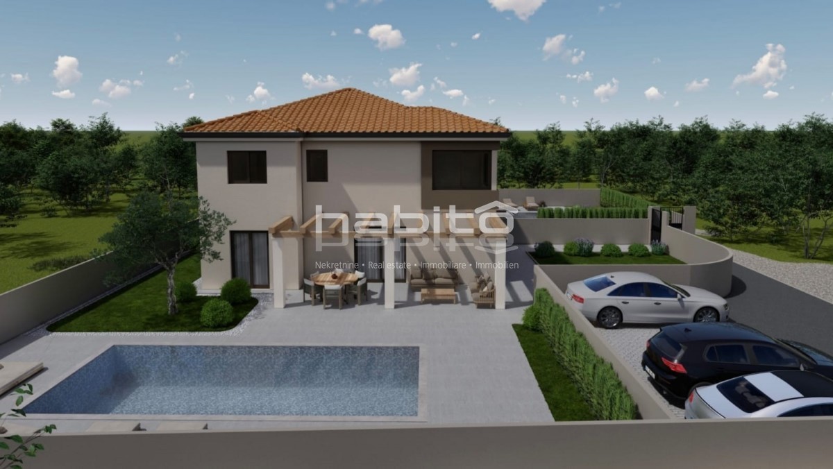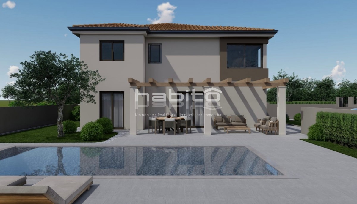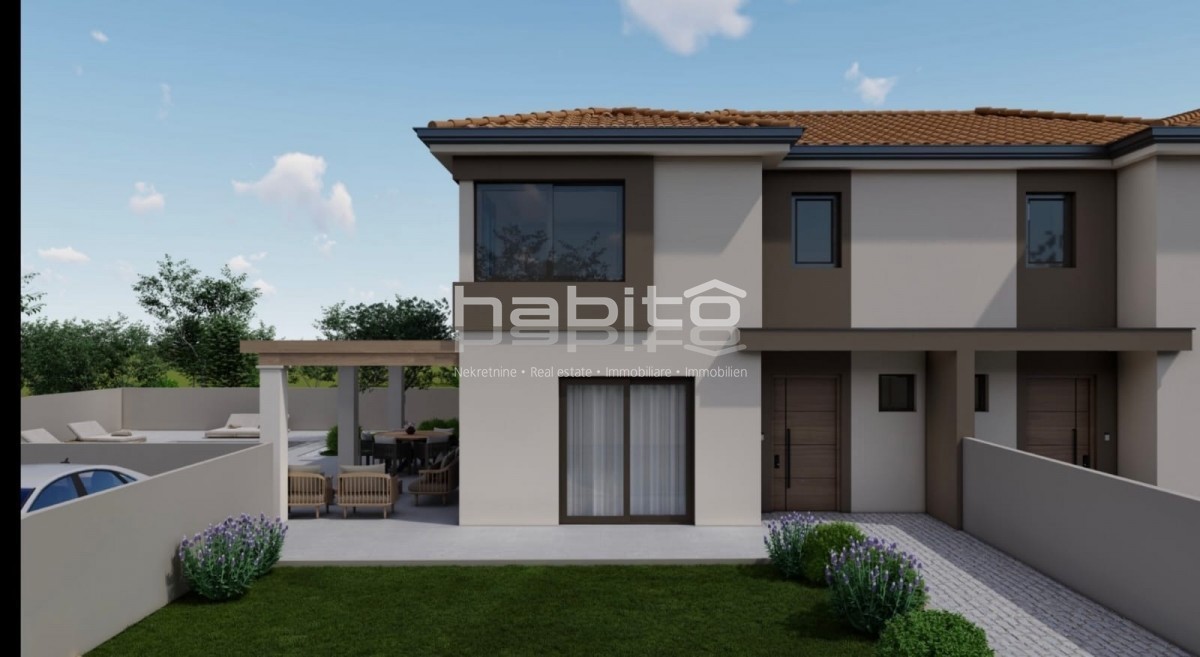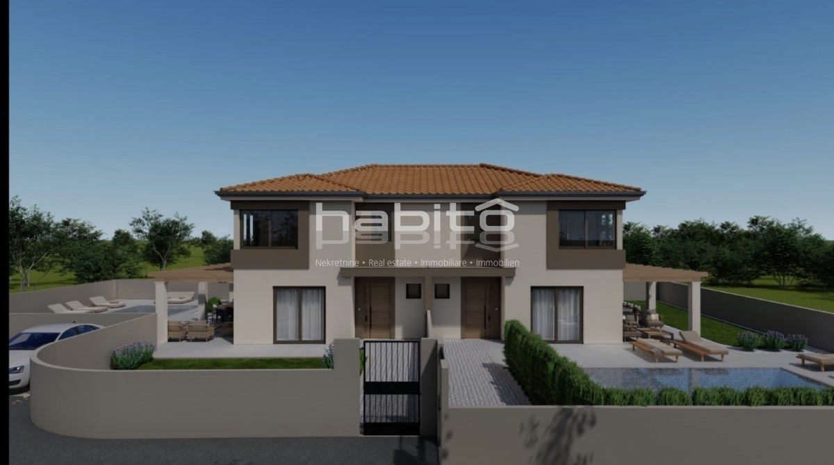 Poreč okolica - Prodaja dvojčka na izjemno mirni lokaciji Hiša s površino 137,50 m2 se razprostira čez dve etaži, pritličje in prvo nadstropje. Obsega tri spalnice, 3 kopalnice, gostinski wc, odprt prostor kuhinja, jedilnica in dnevna soba. Hiša ima tudi