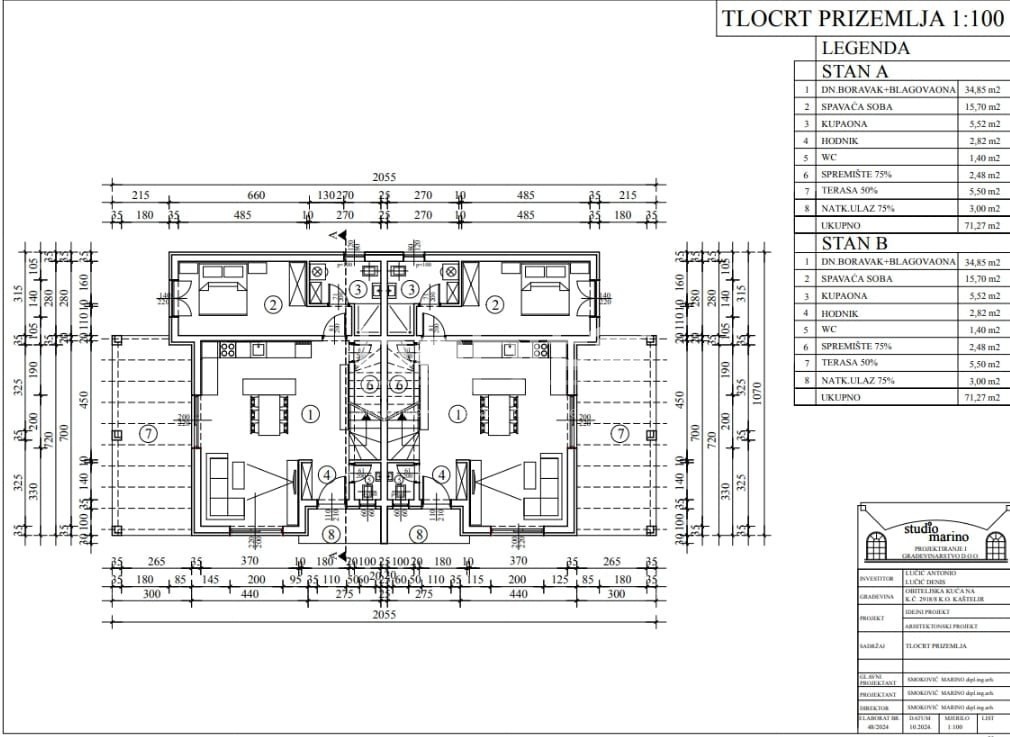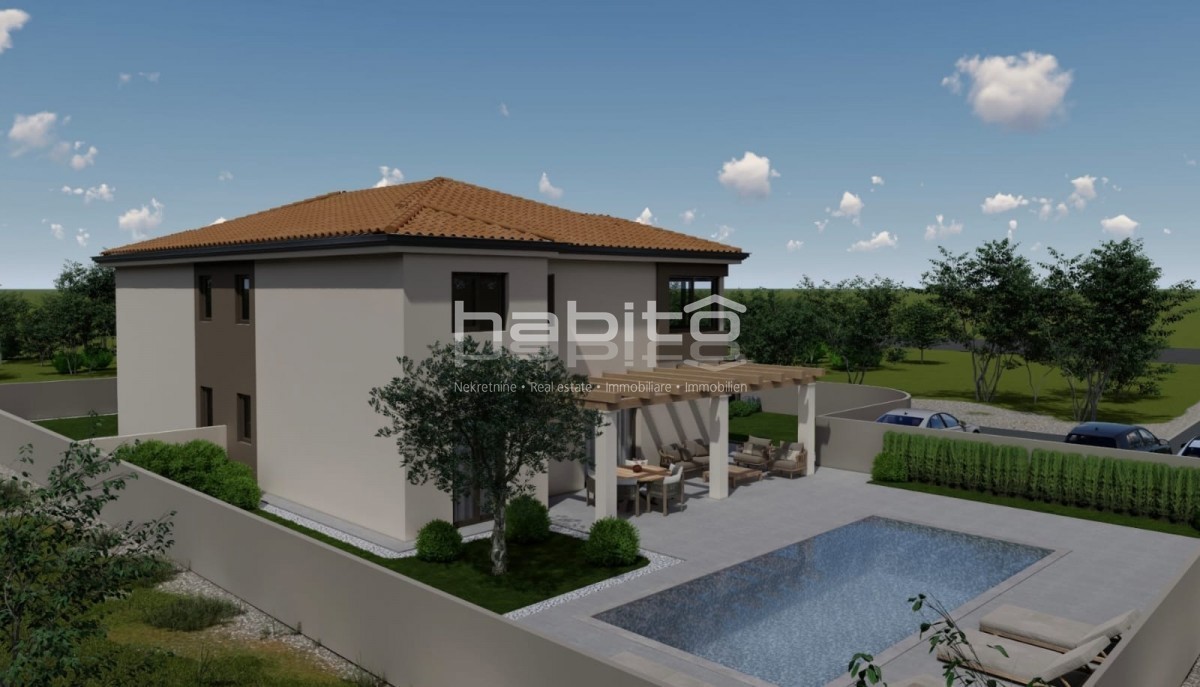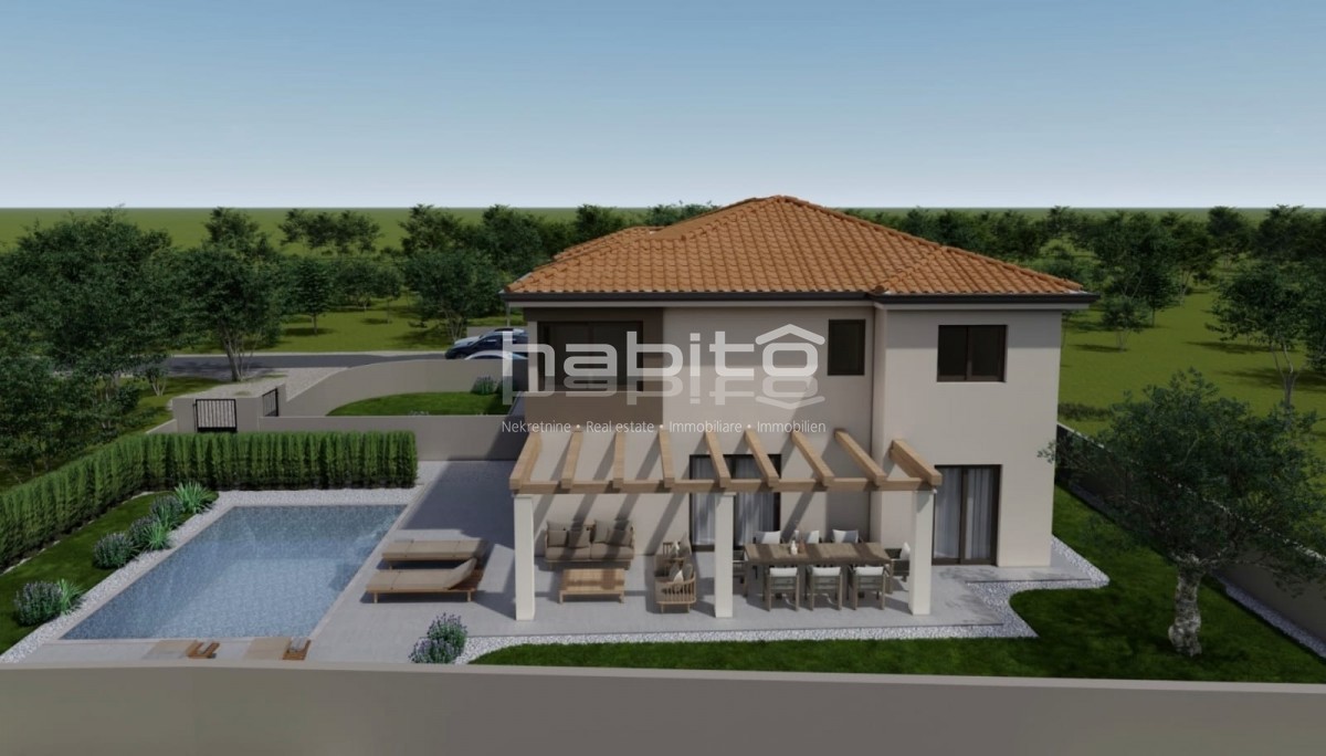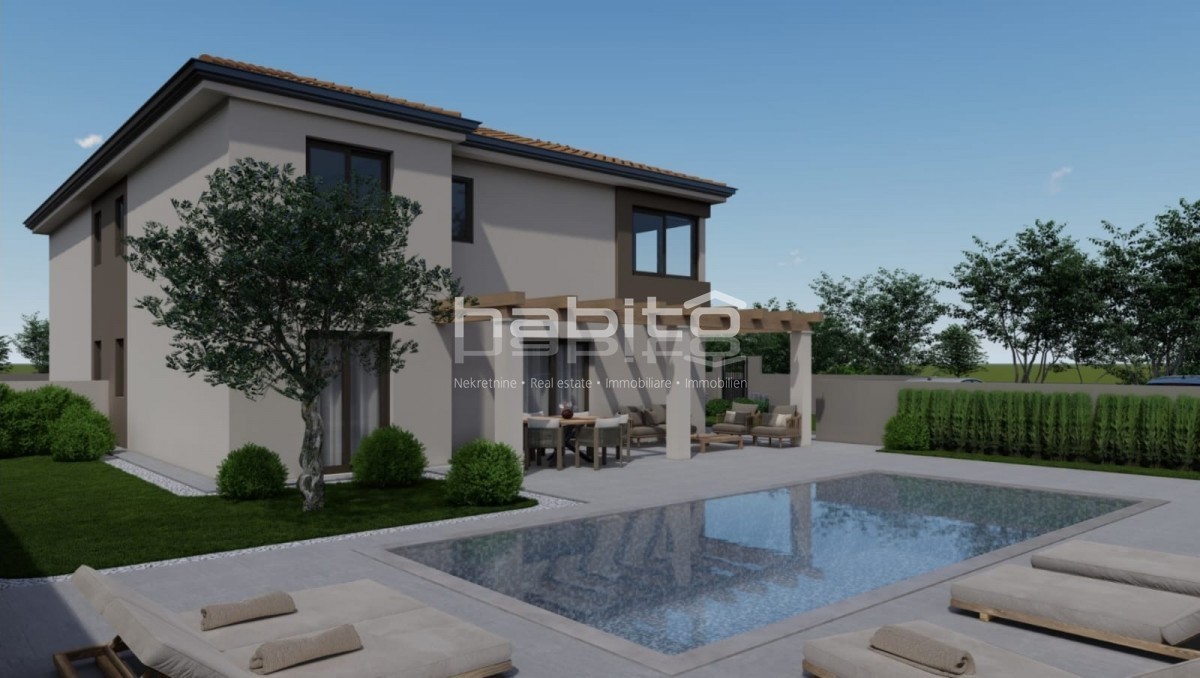 Poreč okolica - Prodaja dvojčka na izjemno mirni lokaciji Hiša s površino 137,50 m2 se razprostira čez dve etaži, pritličje in prvo nadstropje. Obsega tri spalnice, 3 kopalnice, gostinski wc, odprt prostor kuhinja, jedilnica in dnevna soba. Hiša ima tudi