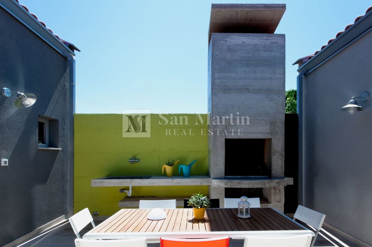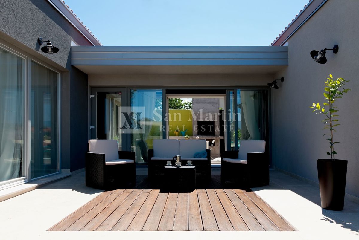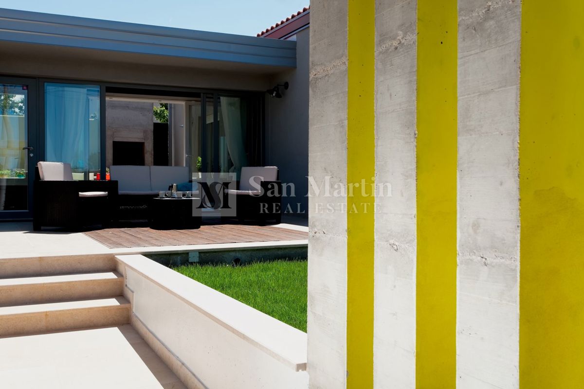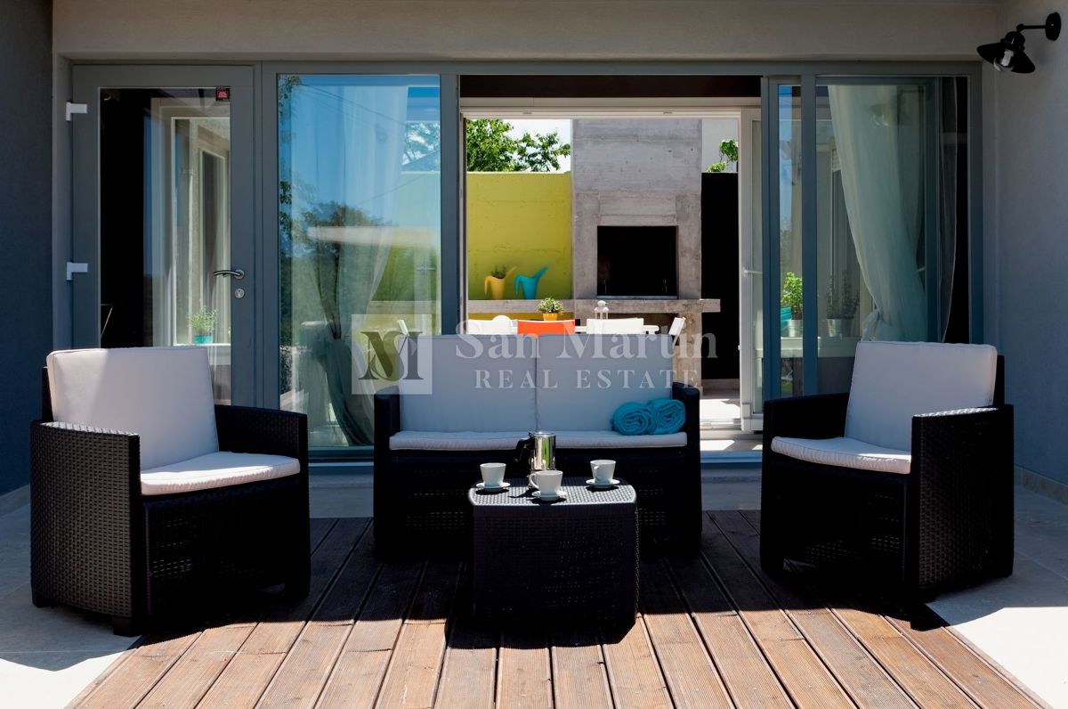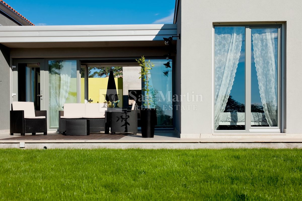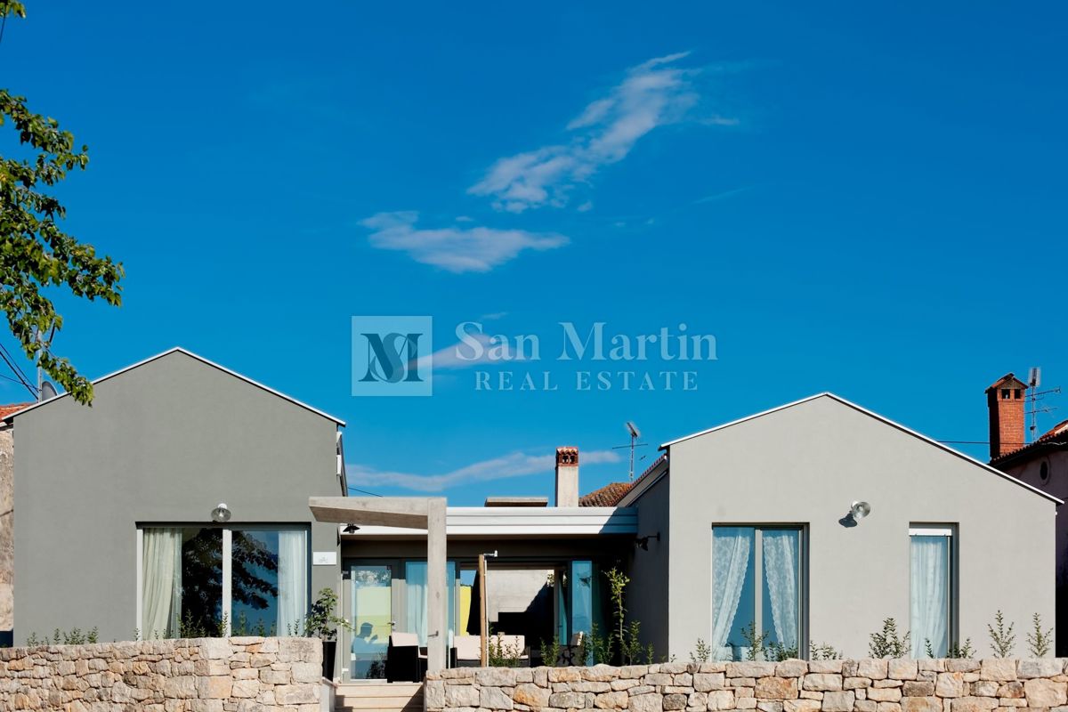 Istra, Poreč, okolica - čudovita moderna pritlična hiša z bazenom. V bližini plaž in mesta Poreč se nahaja ta čudovita moderna počitniška vila z edinstvenim dizajnom. Tloris, ki spominja na črko H, ločuje bivalni in spalni del hiše. Hiša obsega dnevno so