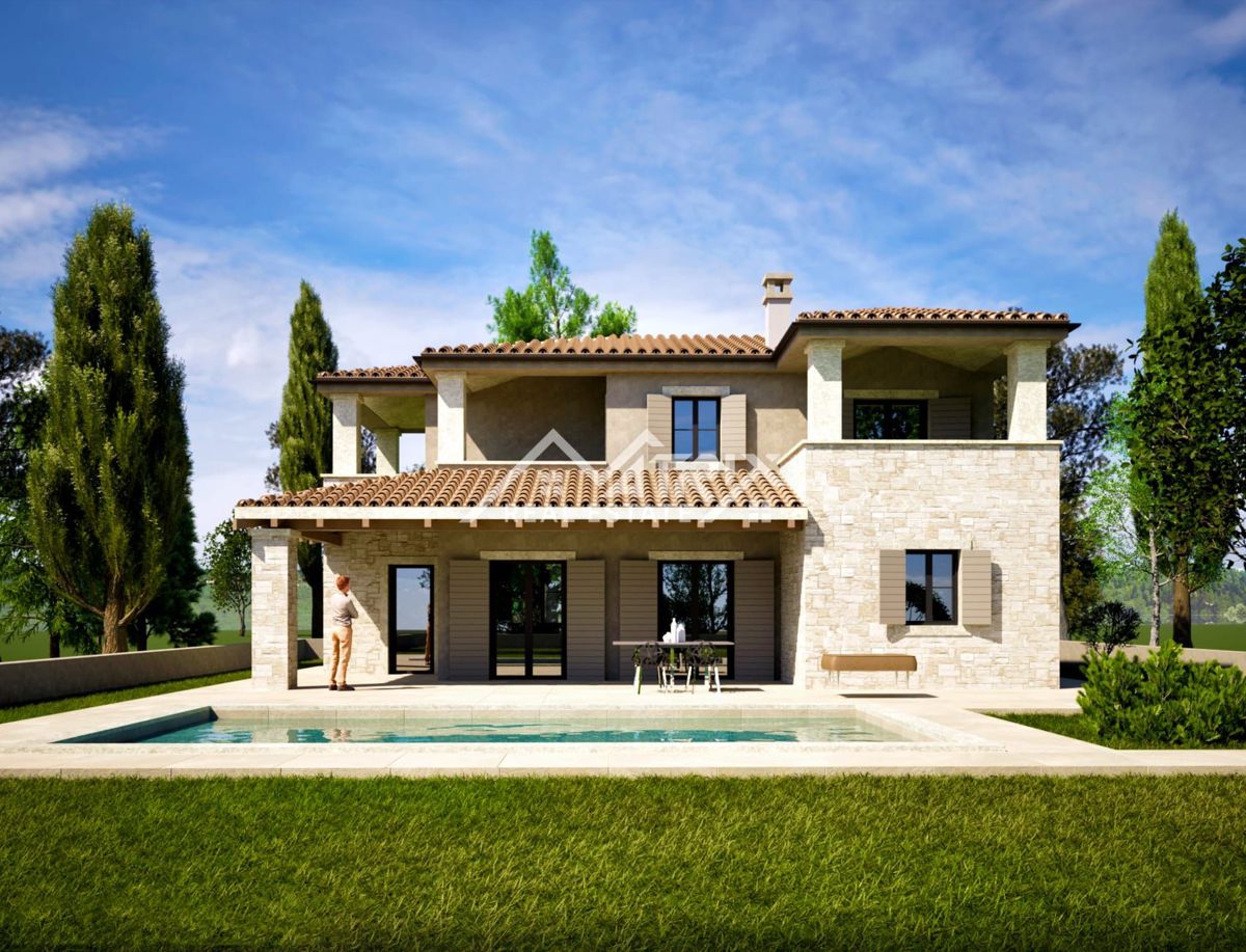 Poreč okolica nova rustikalna vila z pogledom Ta moderna rustikalna vila se nahaja na mirni lokaciji na prostorni parceli velikosti 979 m², le 10 km od Poreča in njegovih čudovitih plaž. S skupno bivalno površino 161,81 m² ponuja popolno ravnovesje med