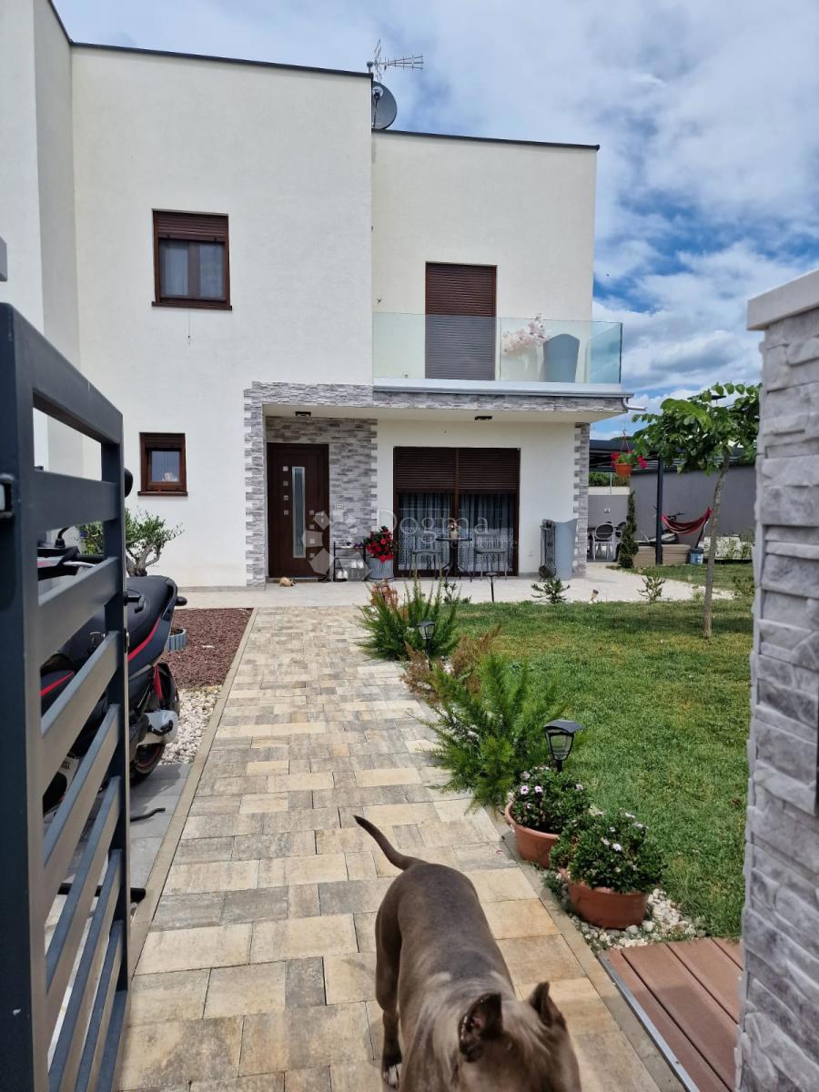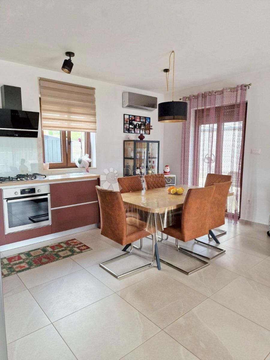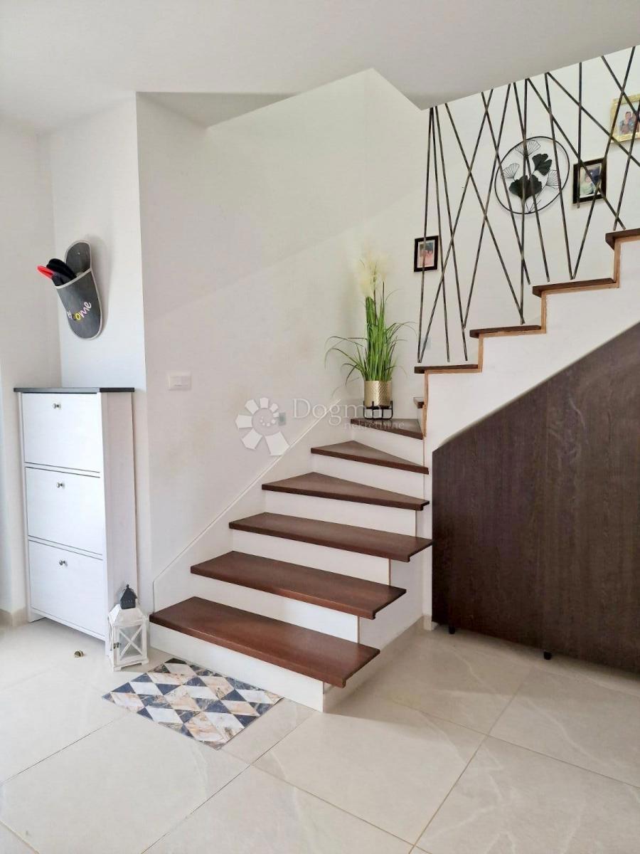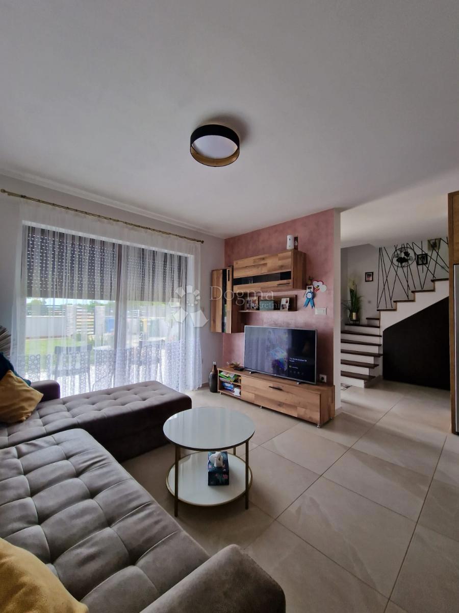 POREČ (okolica) - Nova moderna hiša zadnja v vrsti Samo 15 minut vožnje od Poreča se nahaja moderna hiša zadnja v vrsti. Površina hiše je 92 m2 razdeljena na dve etaži. V pritličju je predsoba, kuhinja z jedilnico, prostorna dnevna soba z izhodom na delno