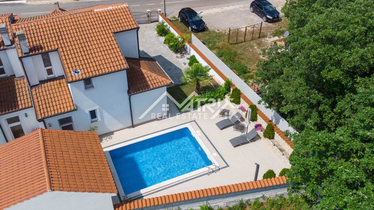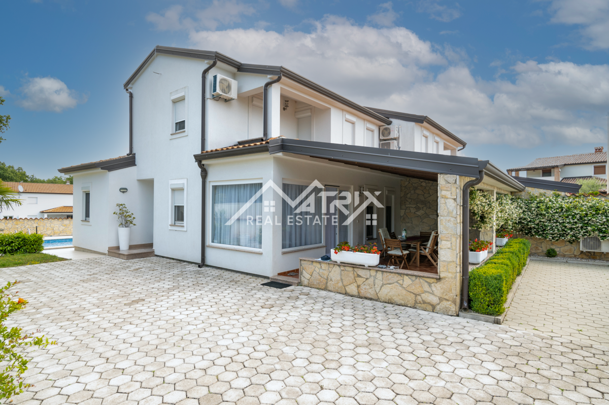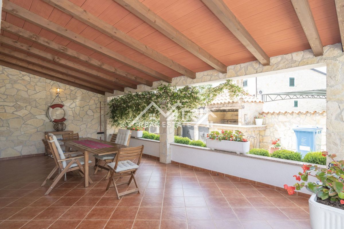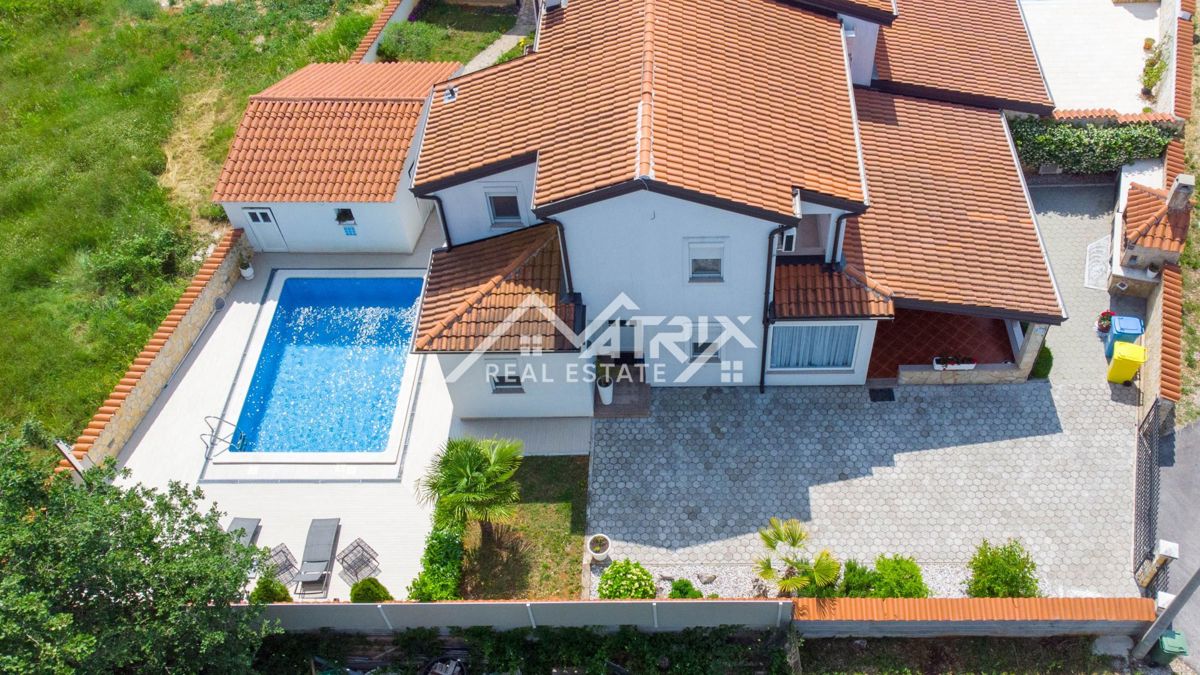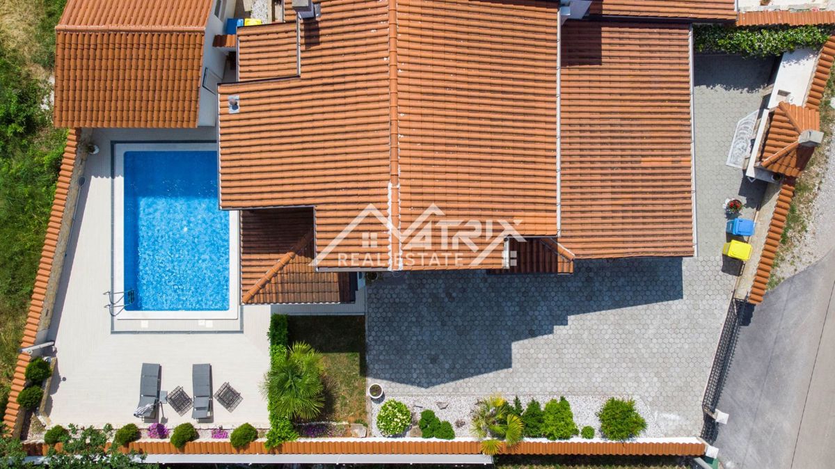 Dobrodošli v tej moderni hiši z bazenom, ki se nahaja v idilični vasici nedaleč od mesta Poreč. Hiša je obdana z naravo in je od morja oddaljena le 6 km. Razteza se v pritličju in prvem nadstropju, s skupno bivalno površino 120 m². Pritličje hiše je zasn