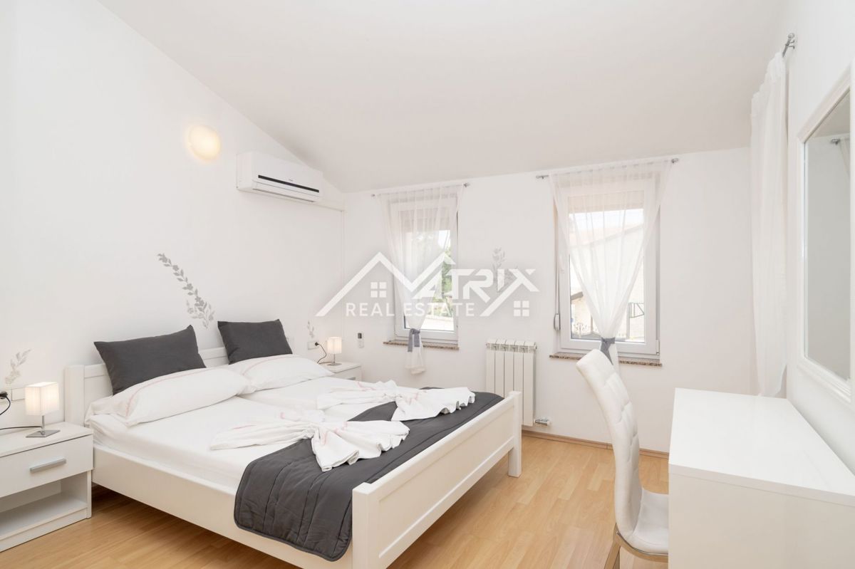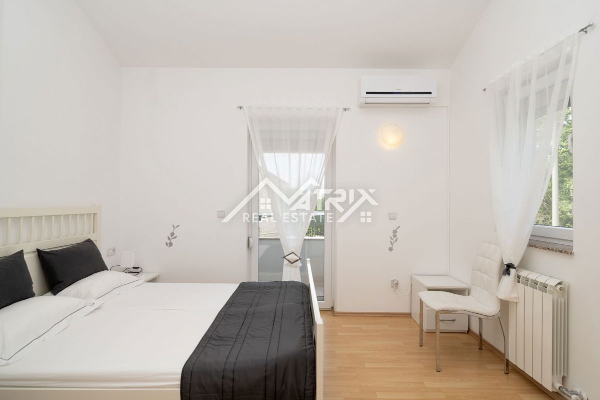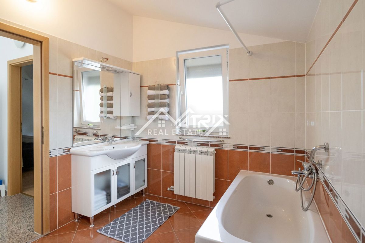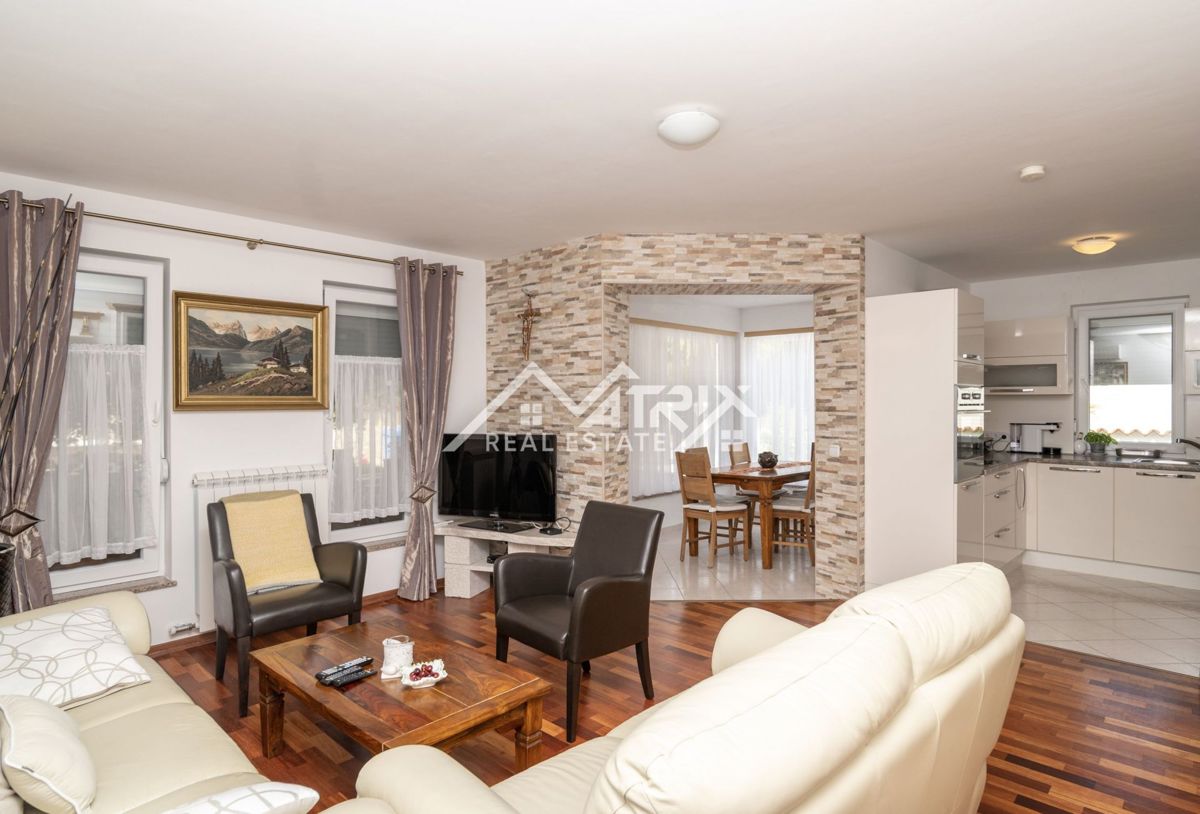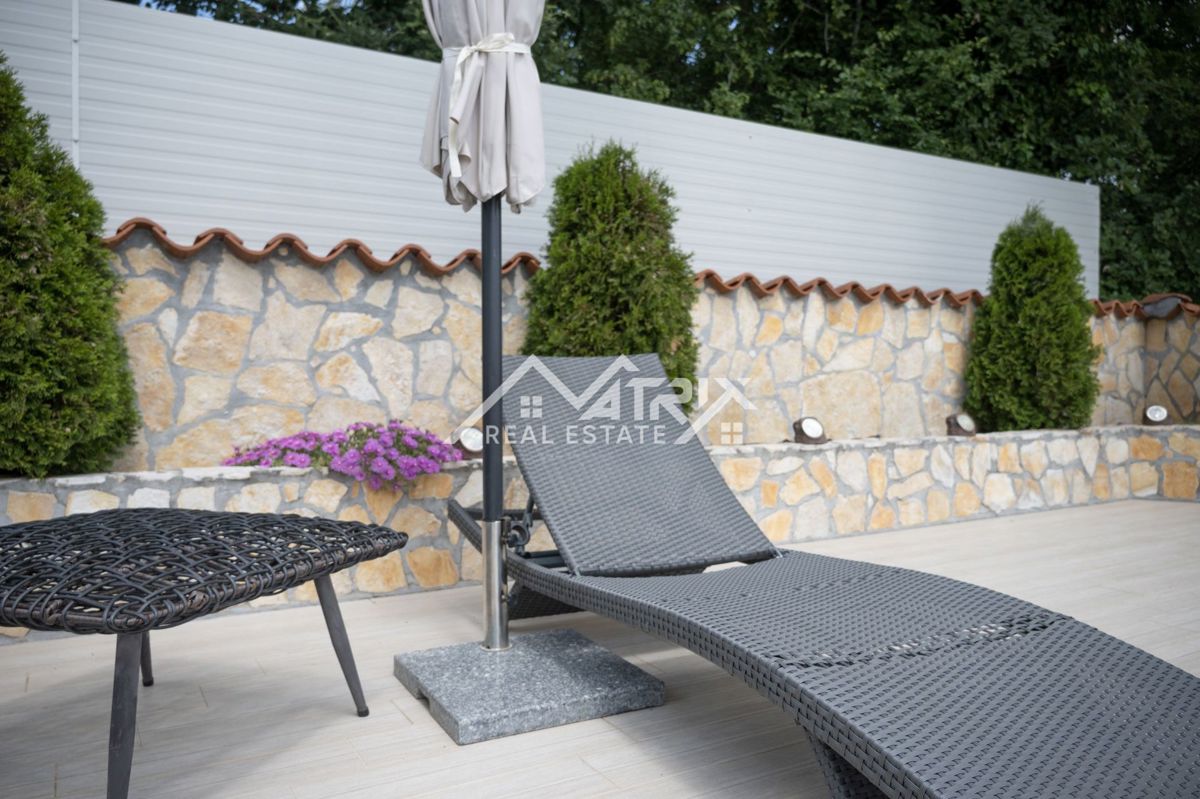 Dobrodošli v tej moderni hiši z bazenom, ki se nahaja v idilični vasici nedaleč od mesta Poreč. Hiša je obdana z naravo in je od morja oddaljena le 6 km. Razteza se v pritličju in prvem nadstropju, s skupno bivalno površino 120 m². Pritličje hiše je zasn