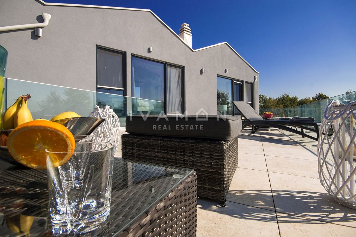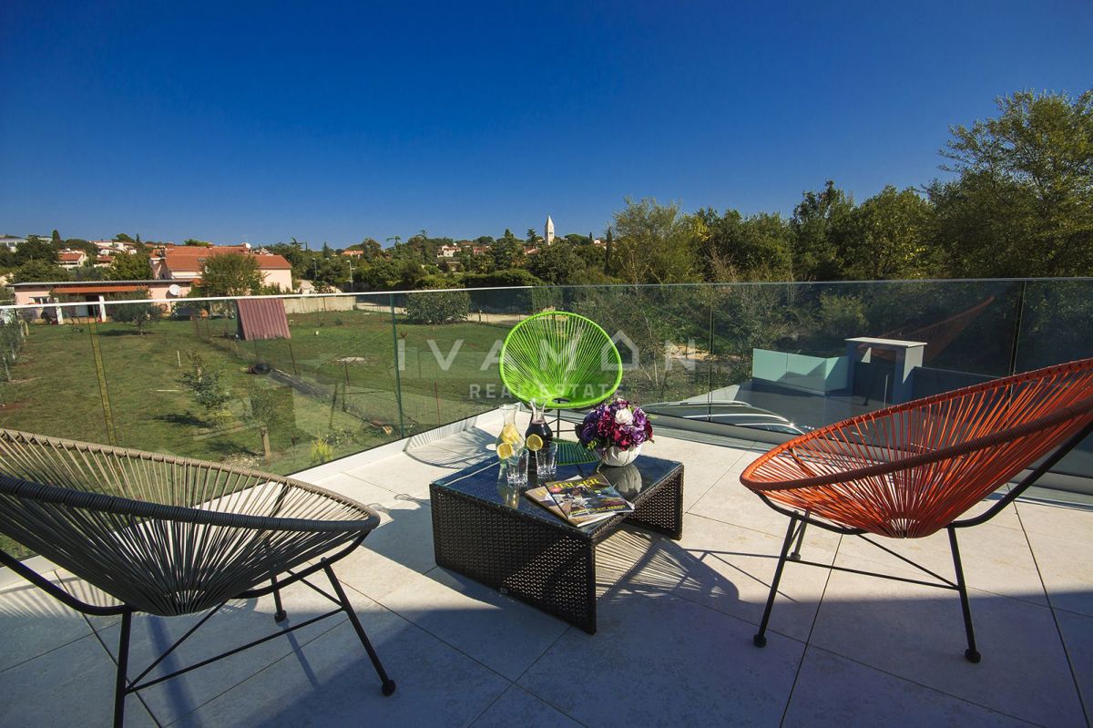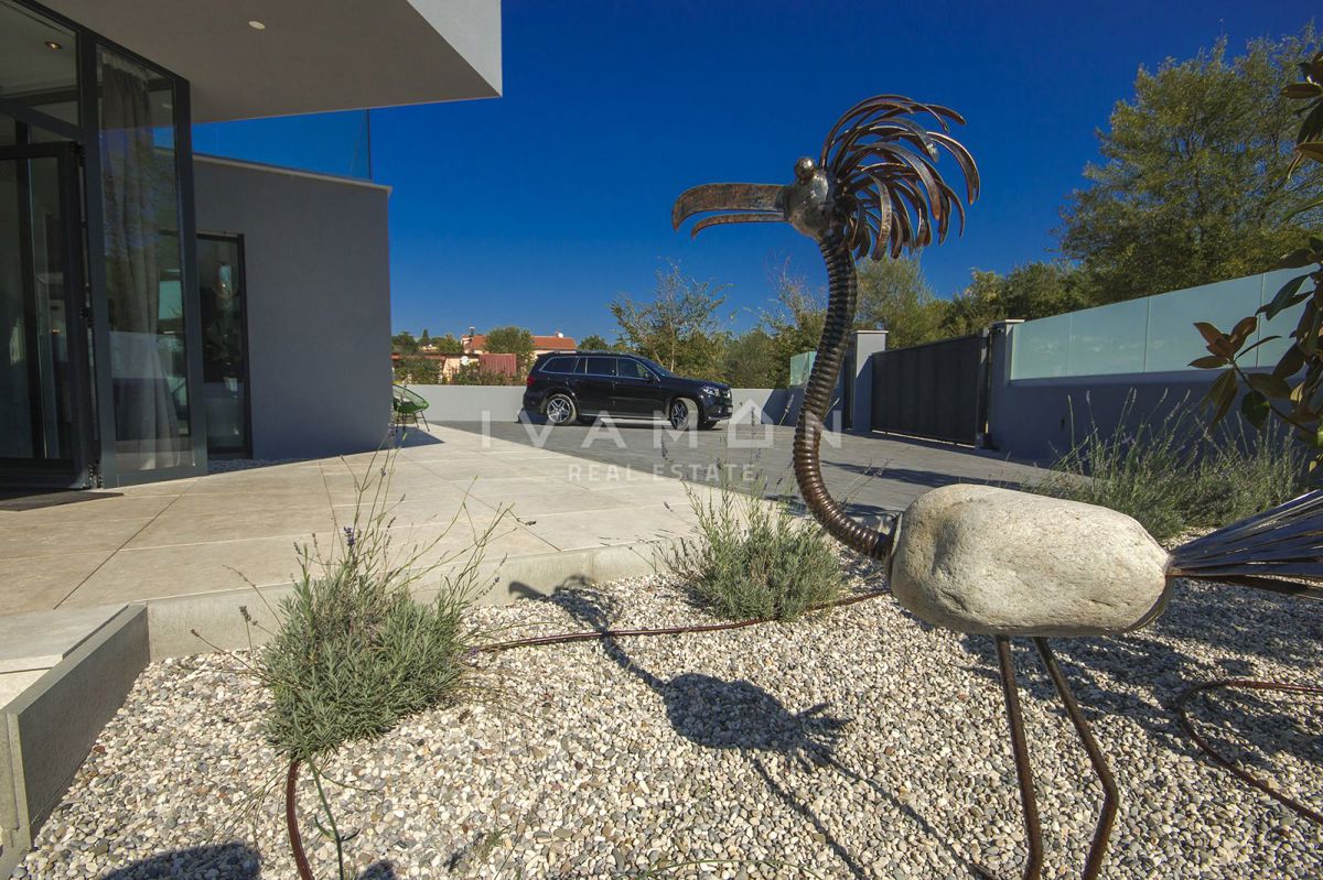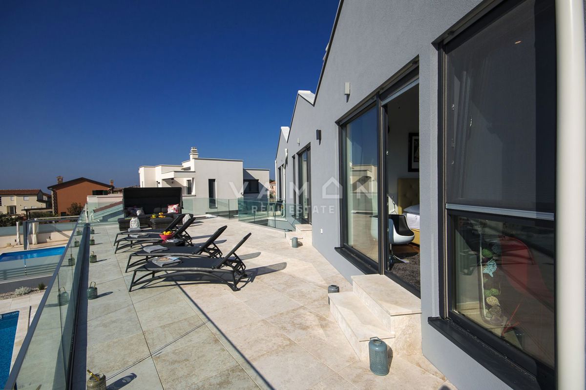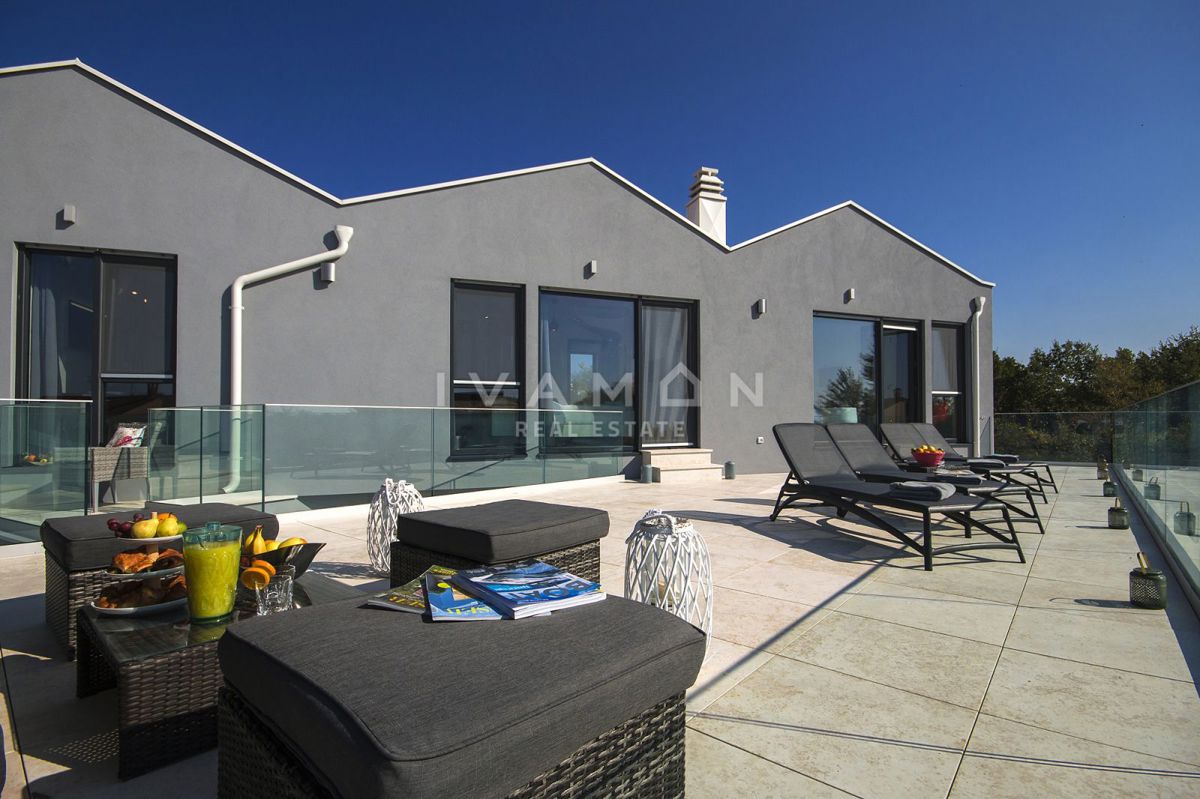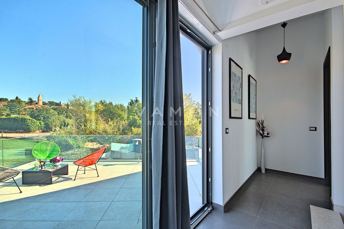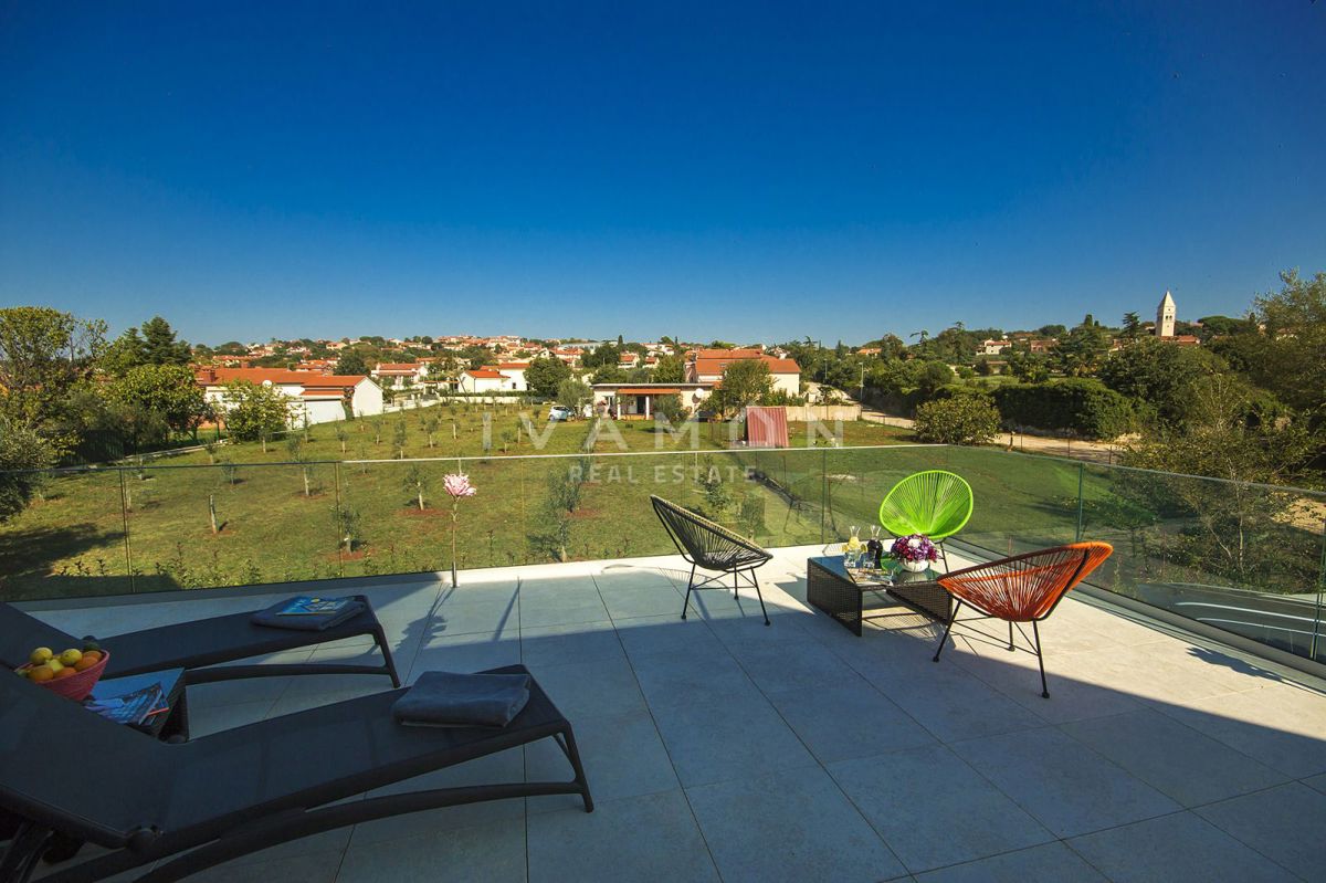 V bližini Poreča, osem kilometrov od morja, na zelo lepi mikrolokaciji, je naprodaj nova vila s bazenom in petimi spalnicami. Vila obsega 385,5 m² površine, razporejene v pritličju in nadstropju. Ponaša se z zelo zanimivo arhitekturo in zunanjostjo. Je r