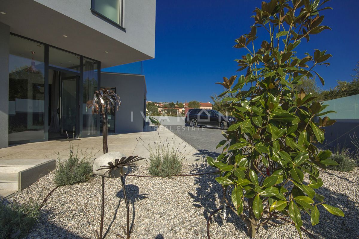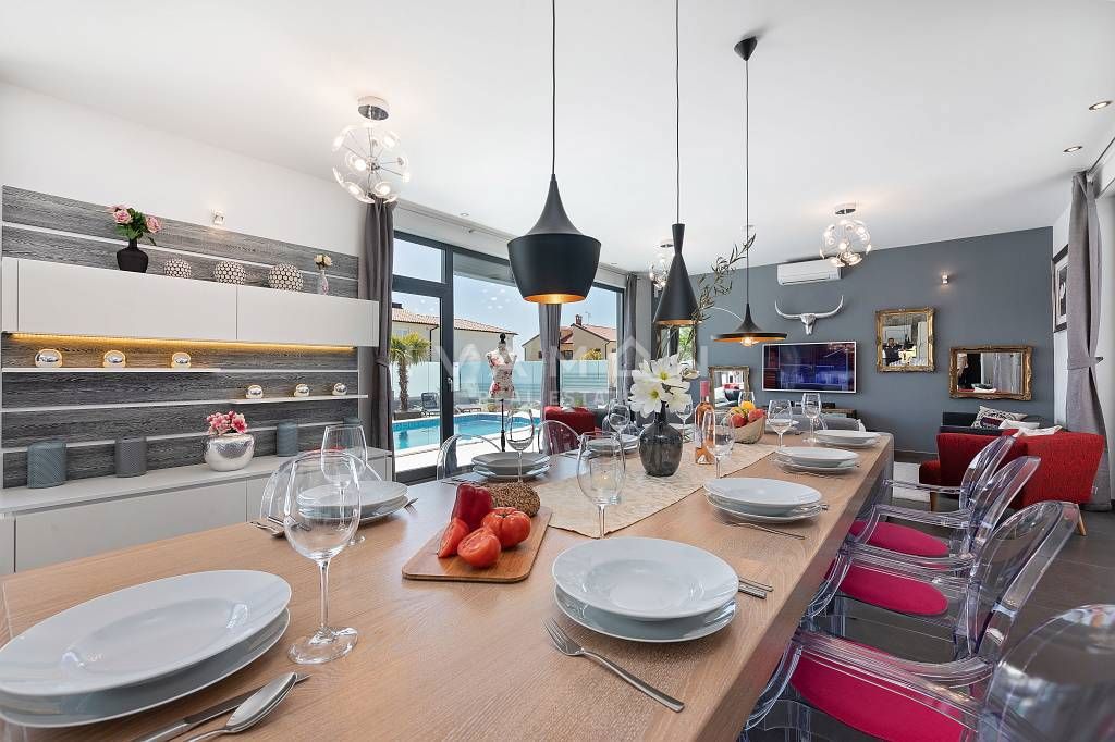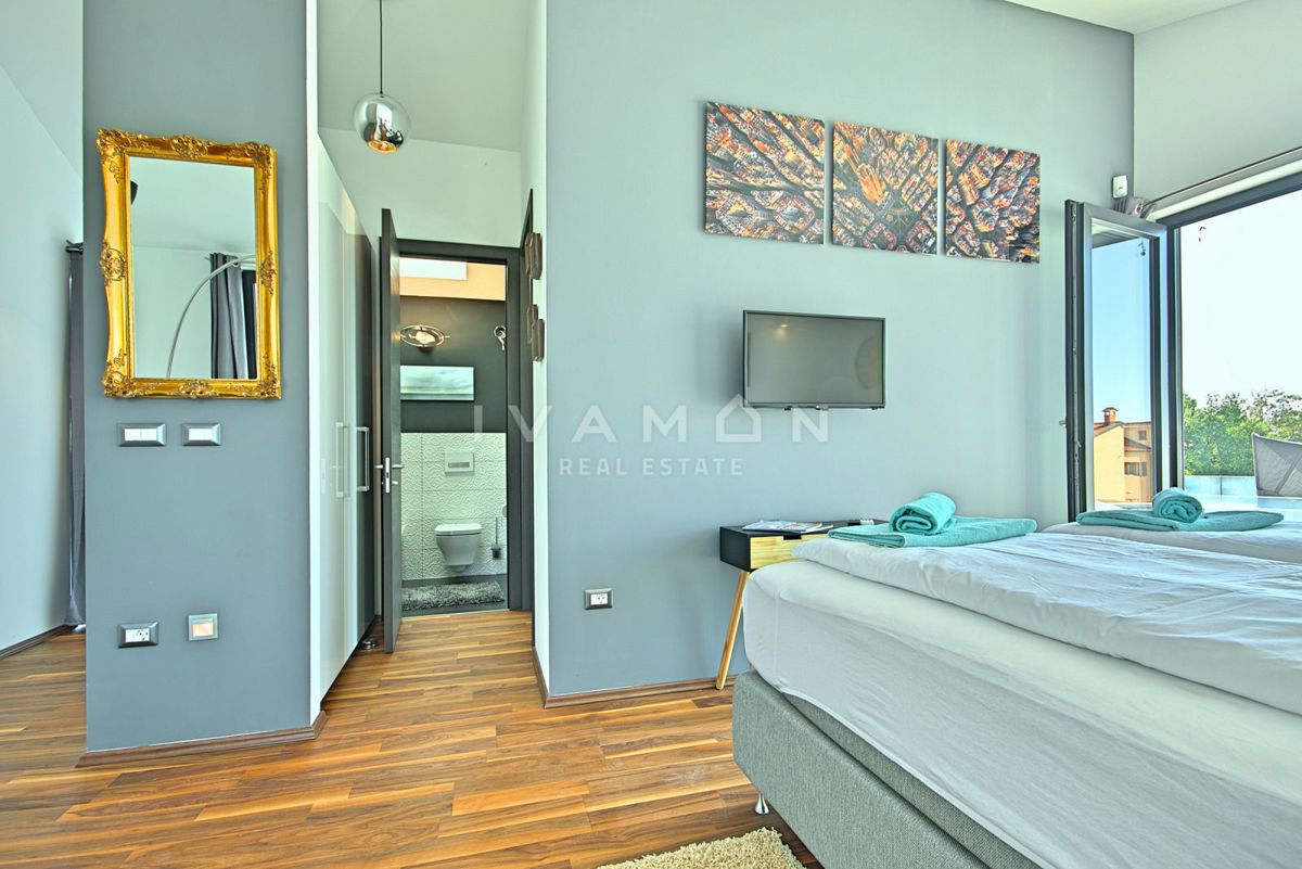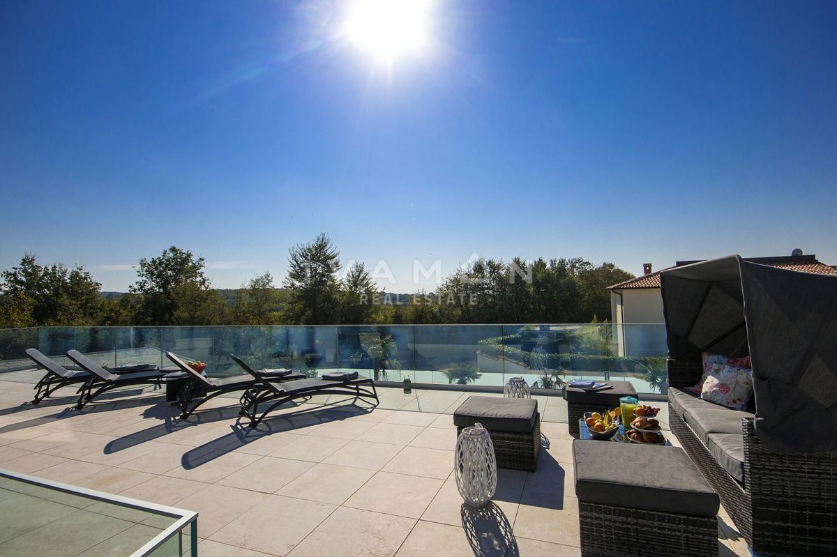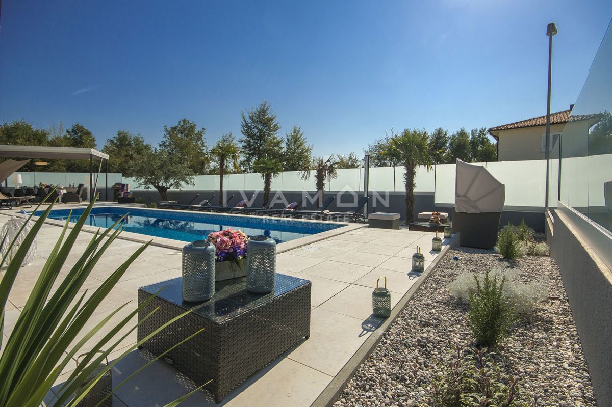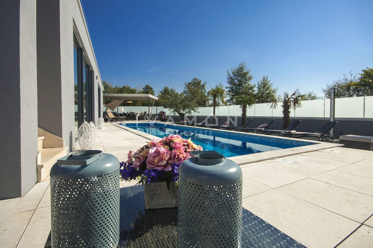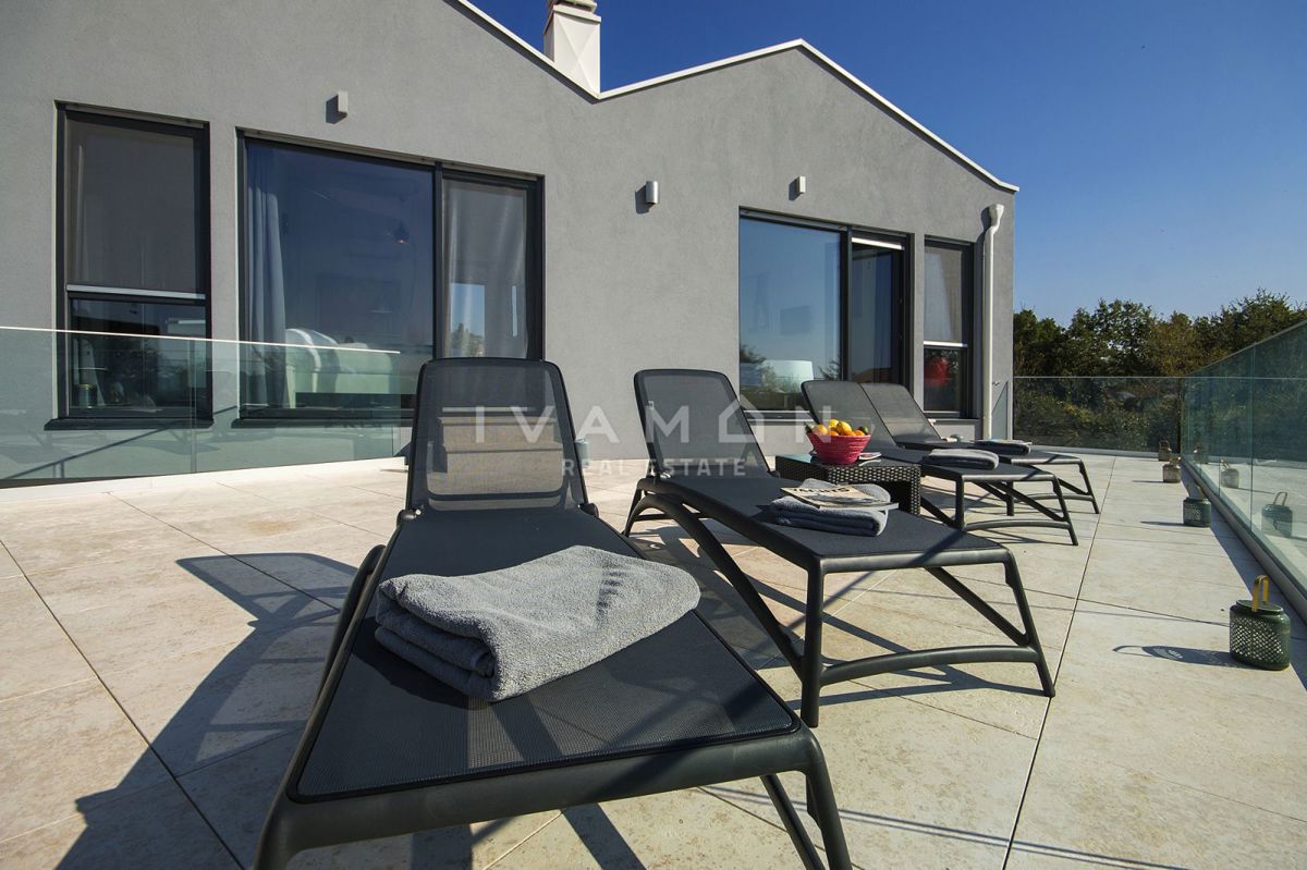 V bližini Poreča, osem kilometrov od morja, na zelo lepi mikrolokaciji, je naprodaj nova vila s bazenom in petimi spalnicami. Vila obsega 385,5 m² površine, razporejene v pritličju in nadstropju. Ponaša se z zelo zanimivo arhitekturo in zunanjostjo. Je r
