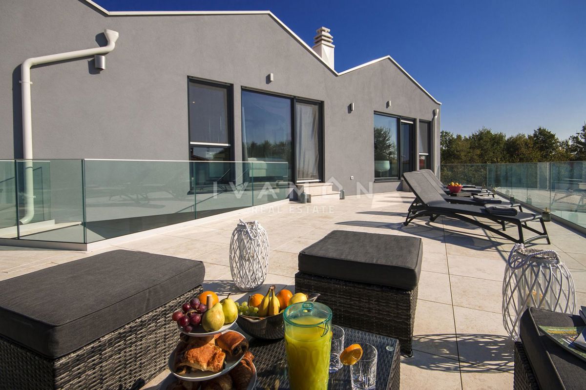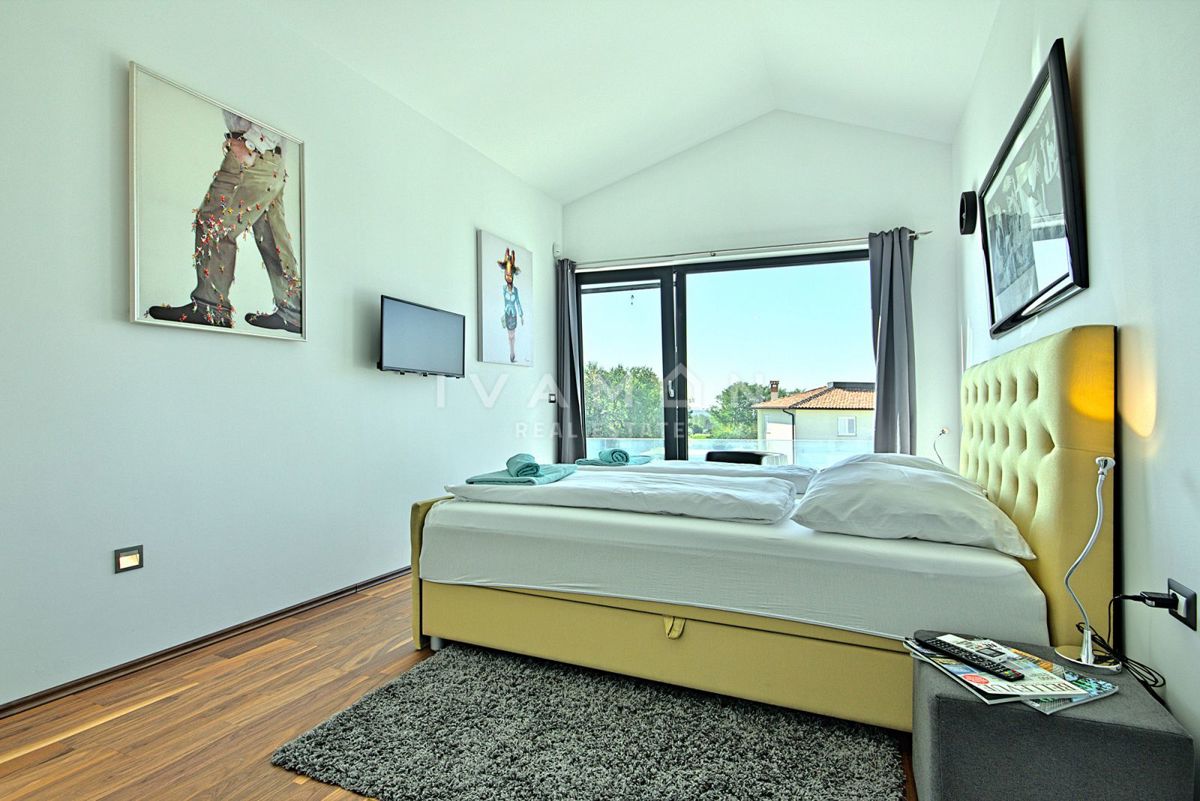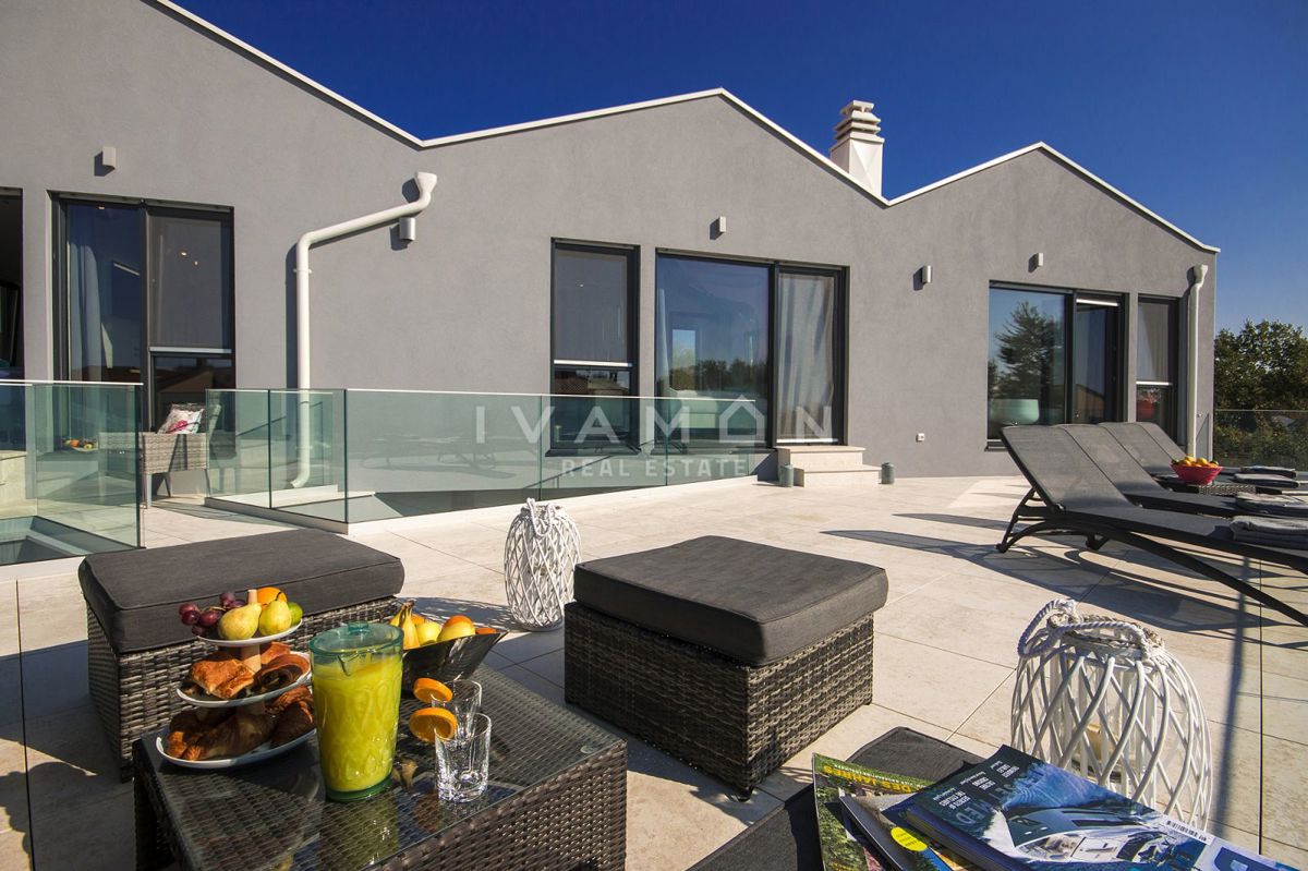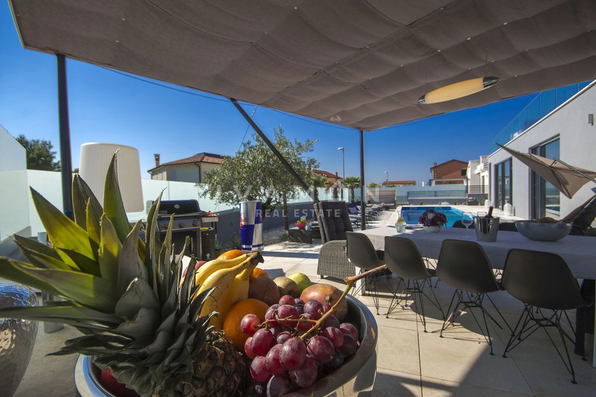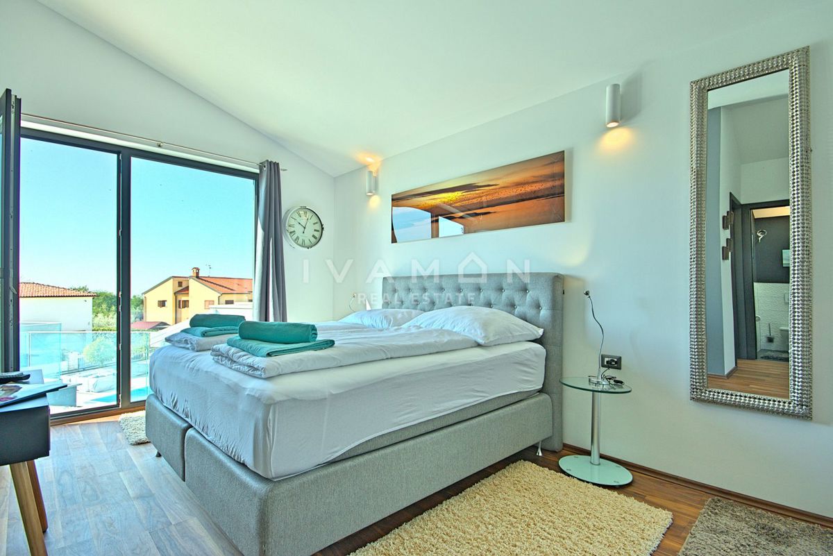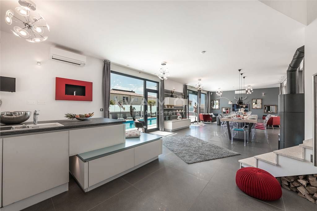 V bližini Poreča, osem kilometrov od morja, na zelo lepi mikrolokaciji, je naprodaj nova vila s bazenom in petimi spalnicami. Vila obsega 385,5 m² površine, razporejene v pritličju in nadstropju. Ponaša se z zelo zanimivo arhitekturo in zunanjostjo. Je r