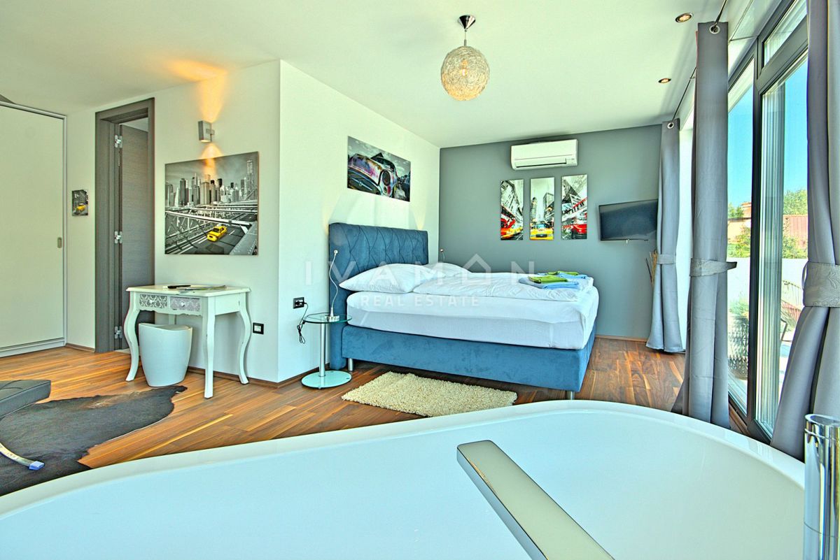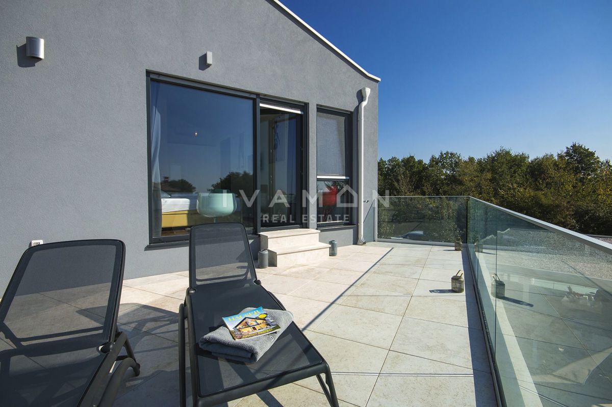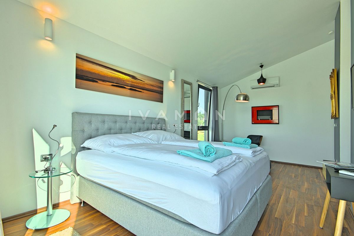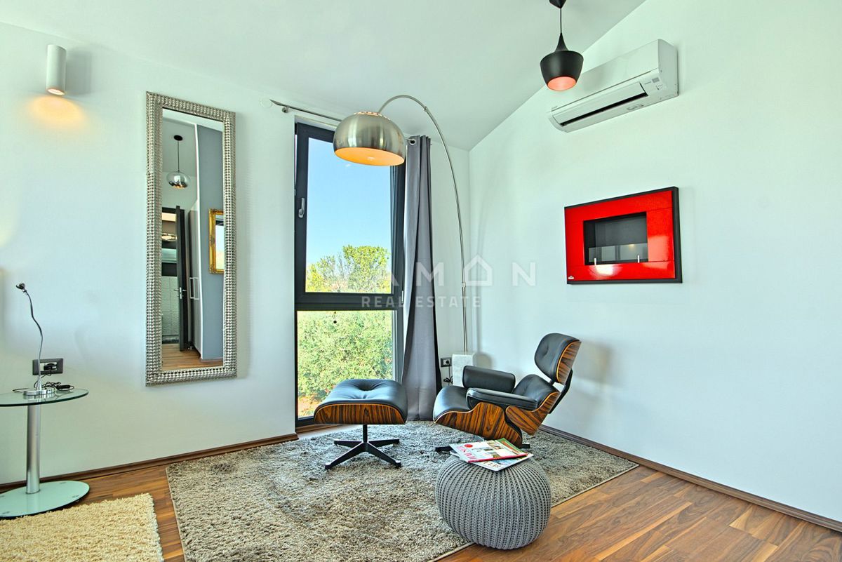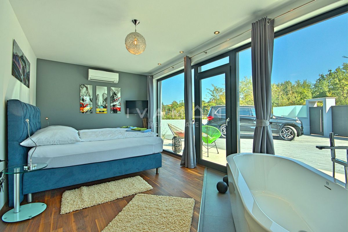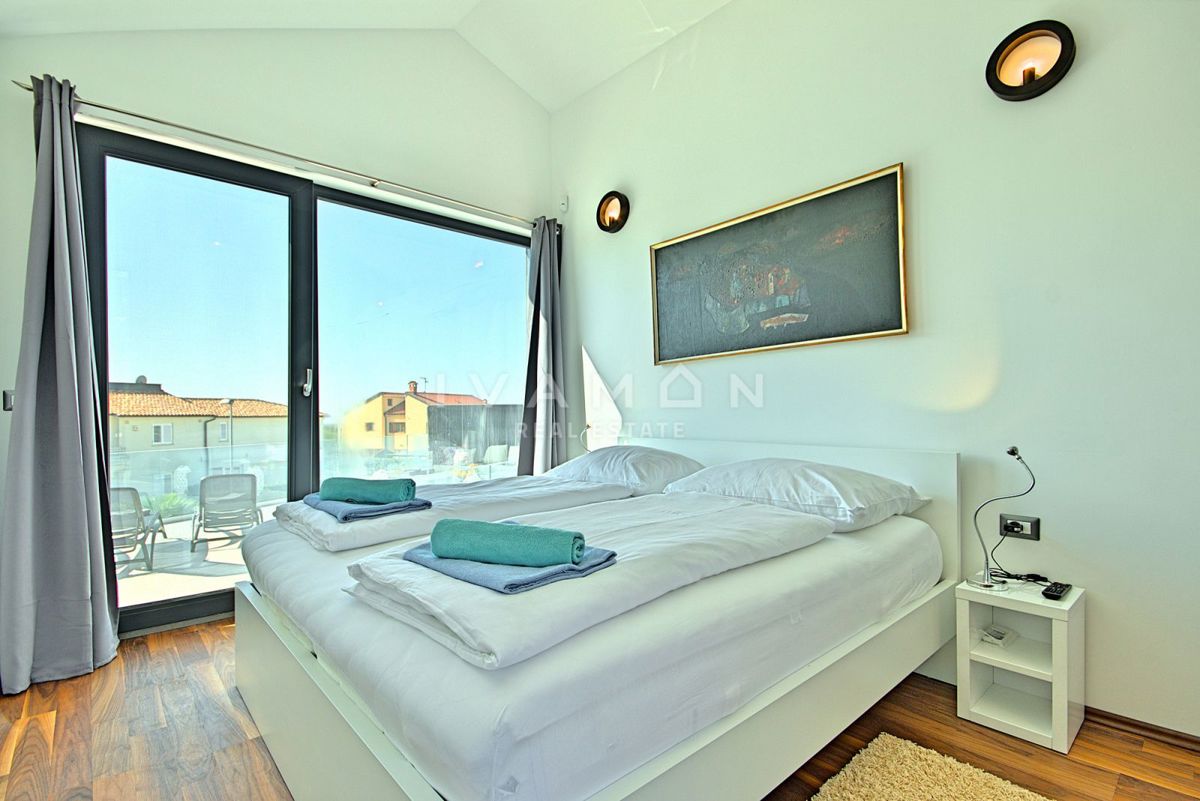 V bližini Poreča, osem kilometrov od morja, na zelo lepi mikrolokaciji, je naprodaj nova vila s bazenom in petimi spalnicami. Vila obsega 385,5 m² površine, razporejene v pritličju in nadstropju. Ponaša se z zelo zanimivo arhitekturo in zunanjostjo. Je r