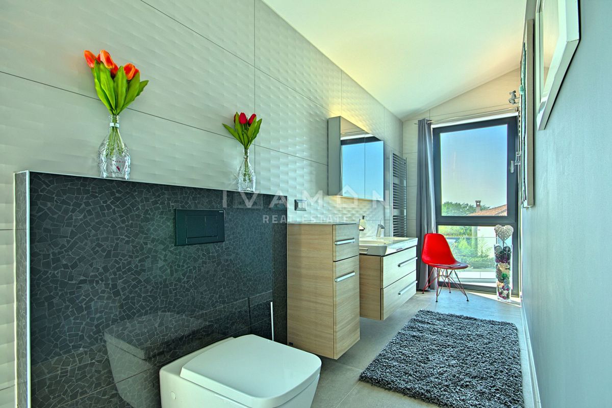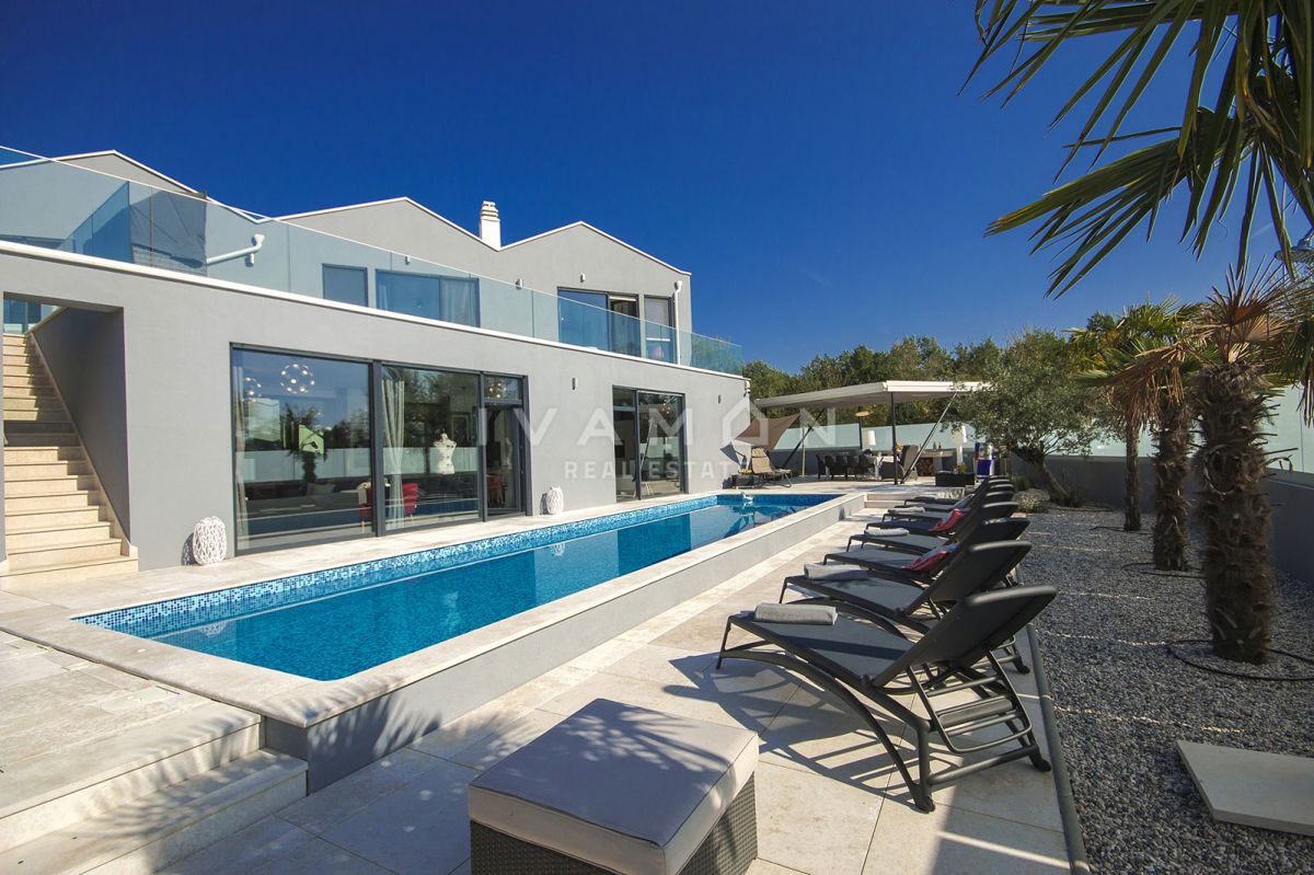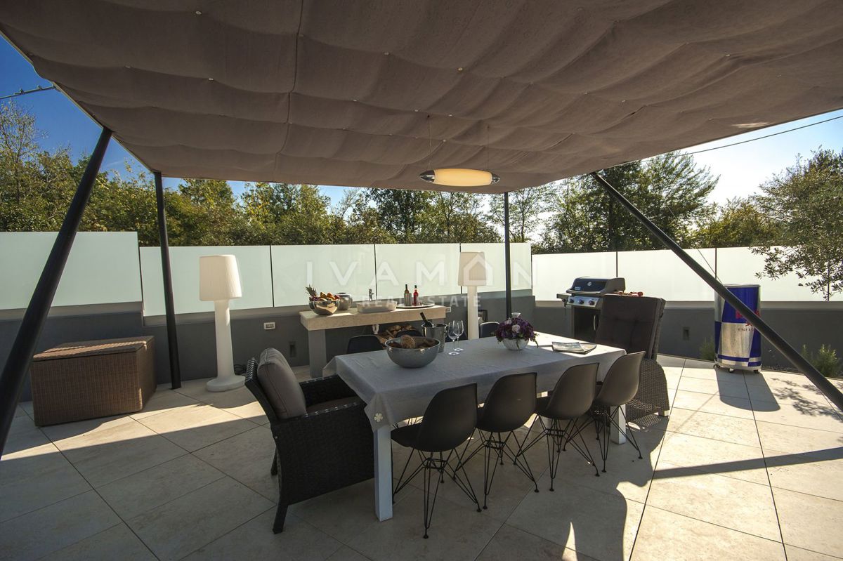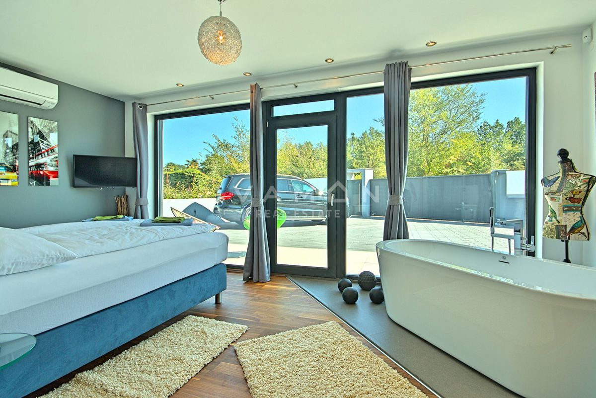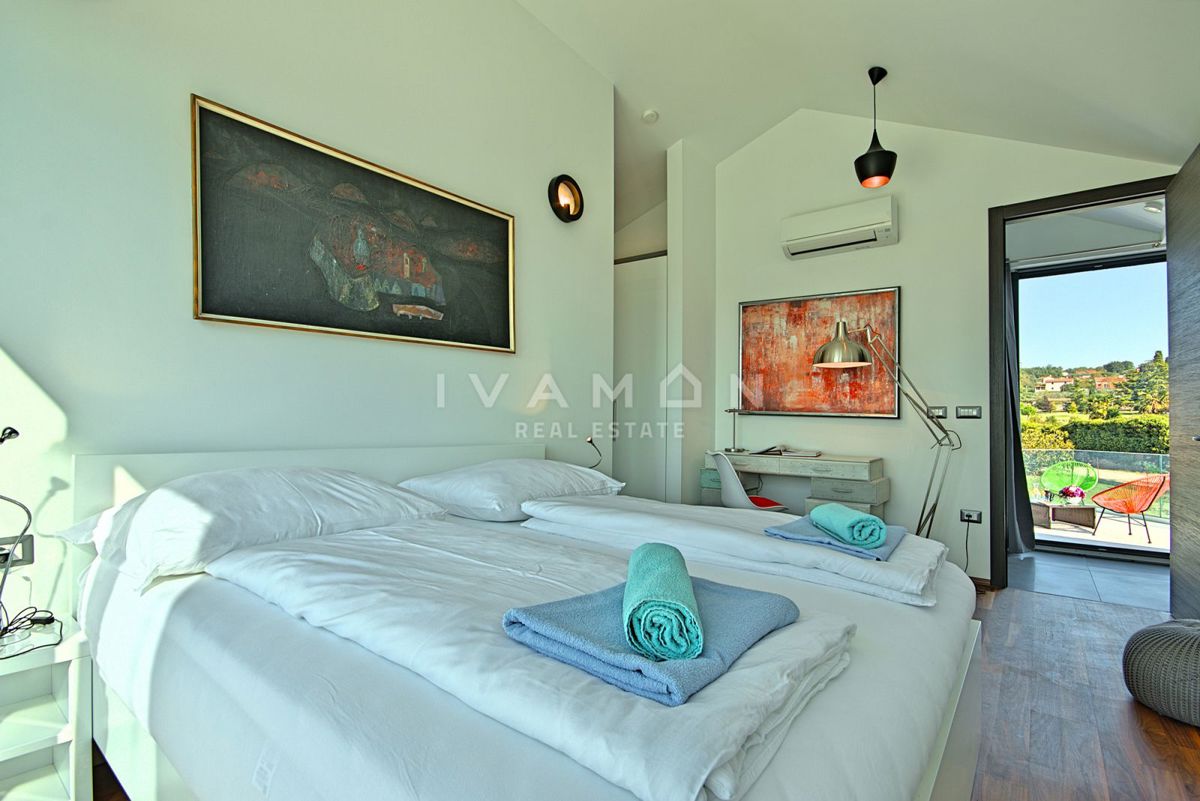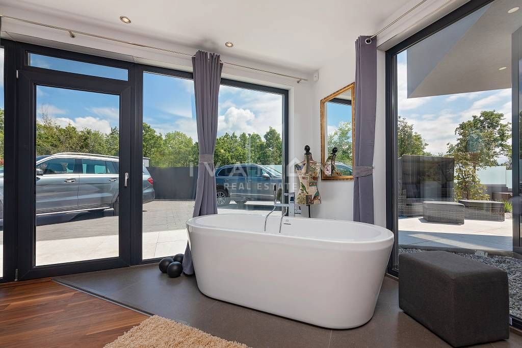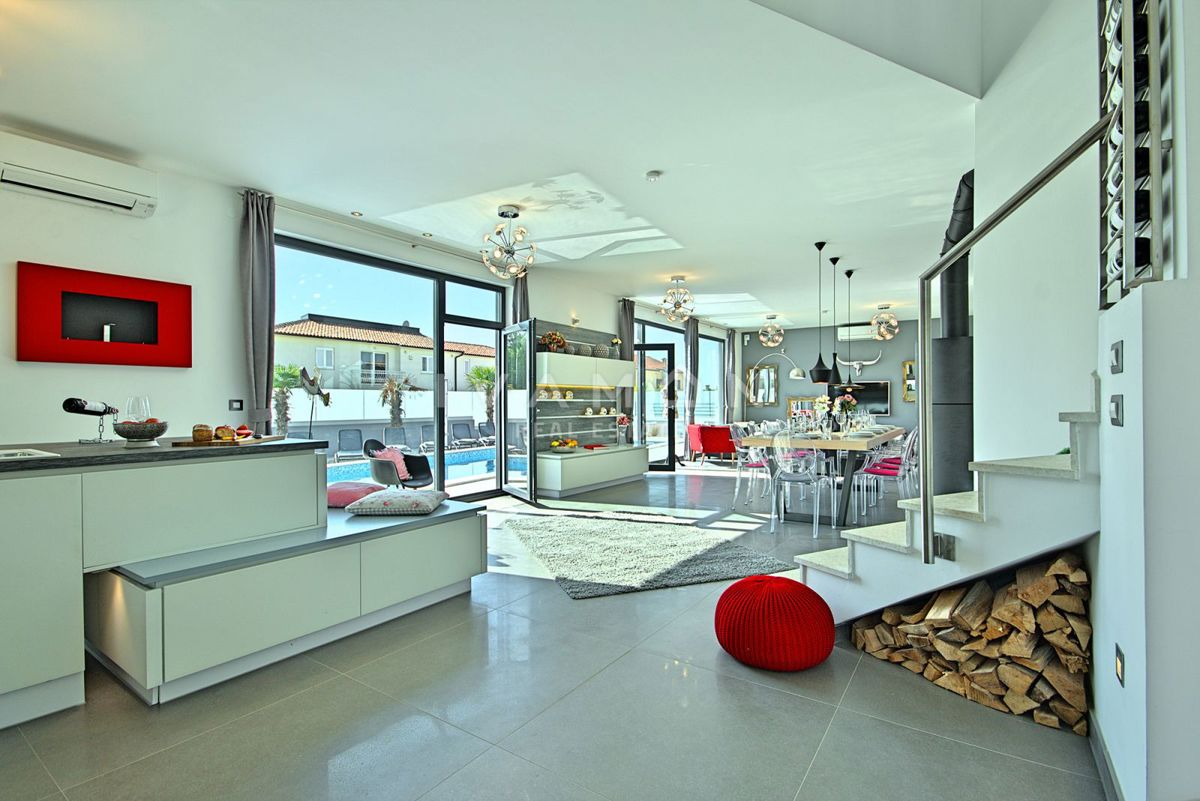 V bližini Poreča, osem kilometrov od morja, na zelo lepi mikrolokaciji, je naprodaj nova vila s bazenom in petimi spalnicami. Vila obsega 385,5 m² površine, razporejene v pritličju in nadstropju. Ponaša se z zelo zanimivo arhitekturo in zunanjostjo. Je r