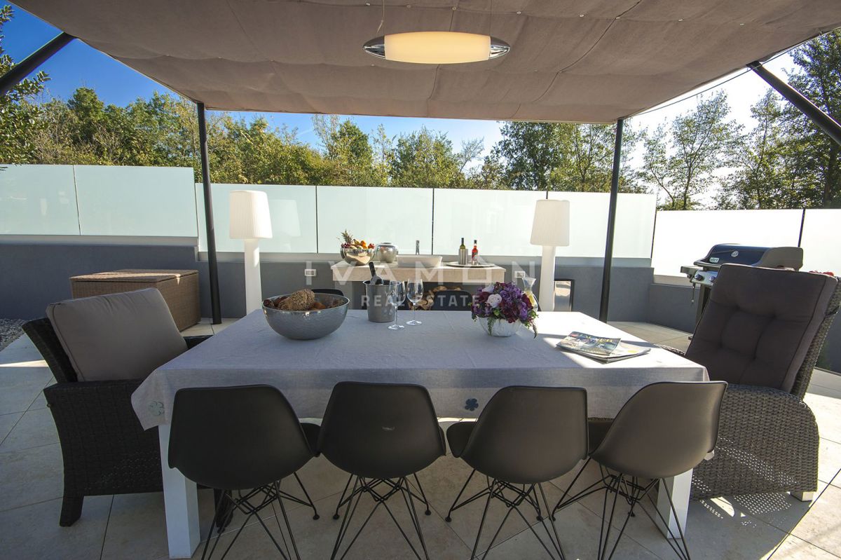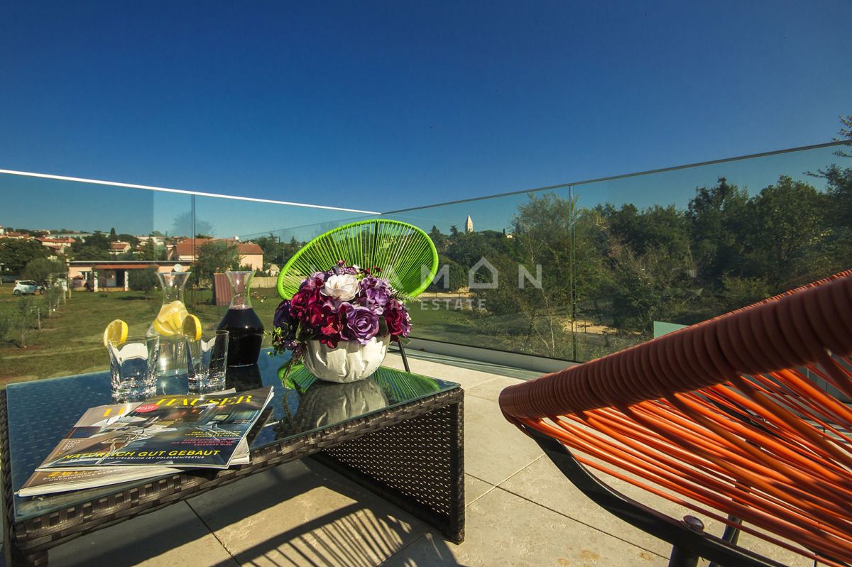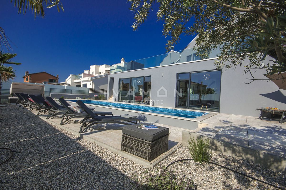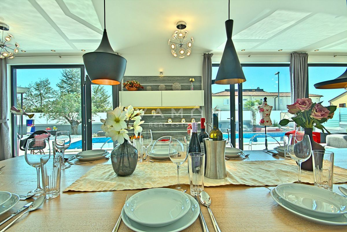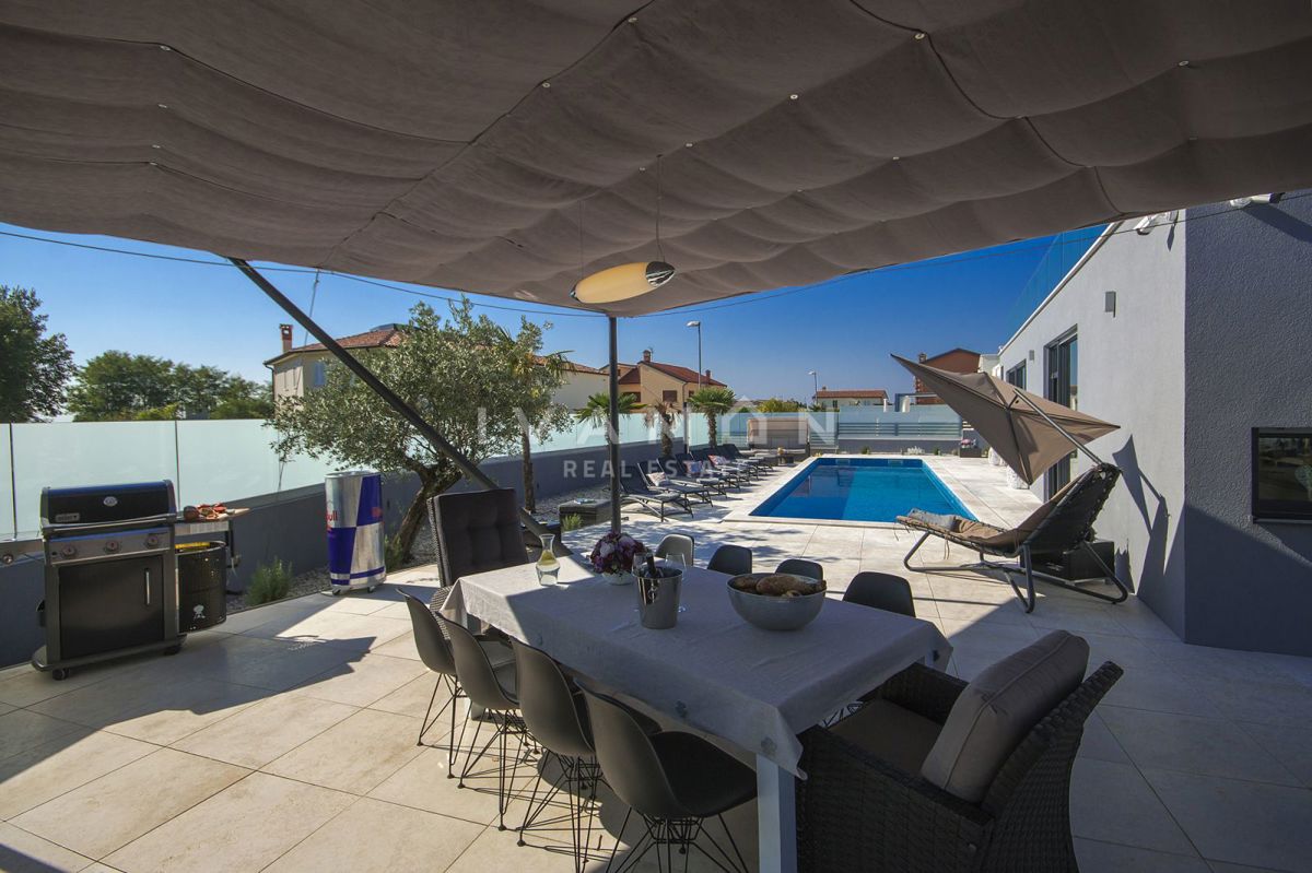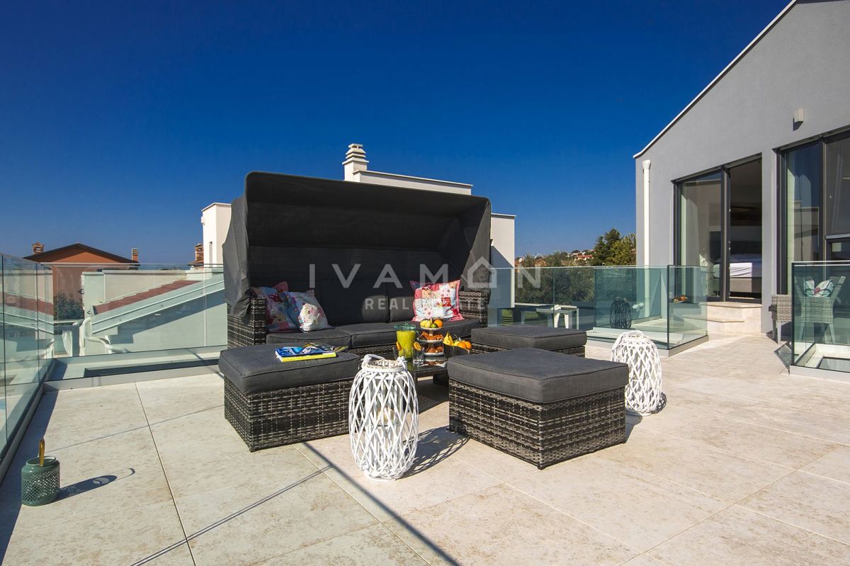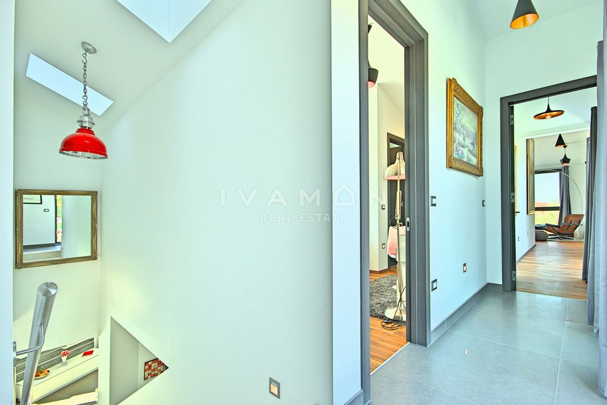 V bližini Poreča, osem kilometrov od morja, na zelo lepi mikrolokaciji, je naprodaj nova vila s bazenom in petimi spalnicami. Vila obsega 385,5 m² površine, razporejene v pritličju in nadstropju. Ponaša se z zelo zanimivo arhitekturo in zunanjostjo. Je r