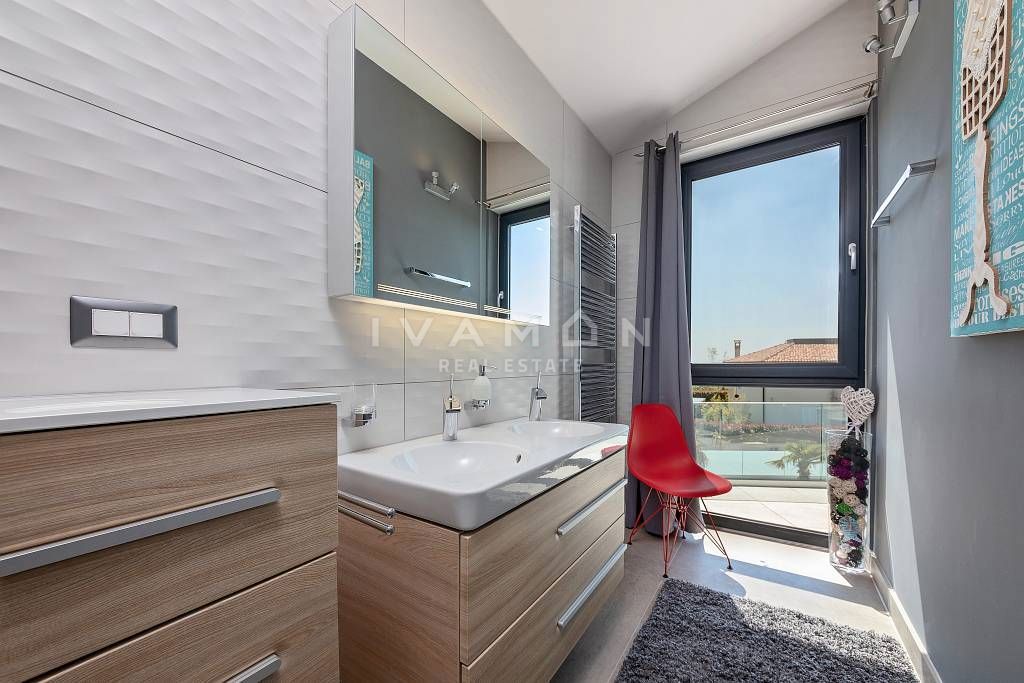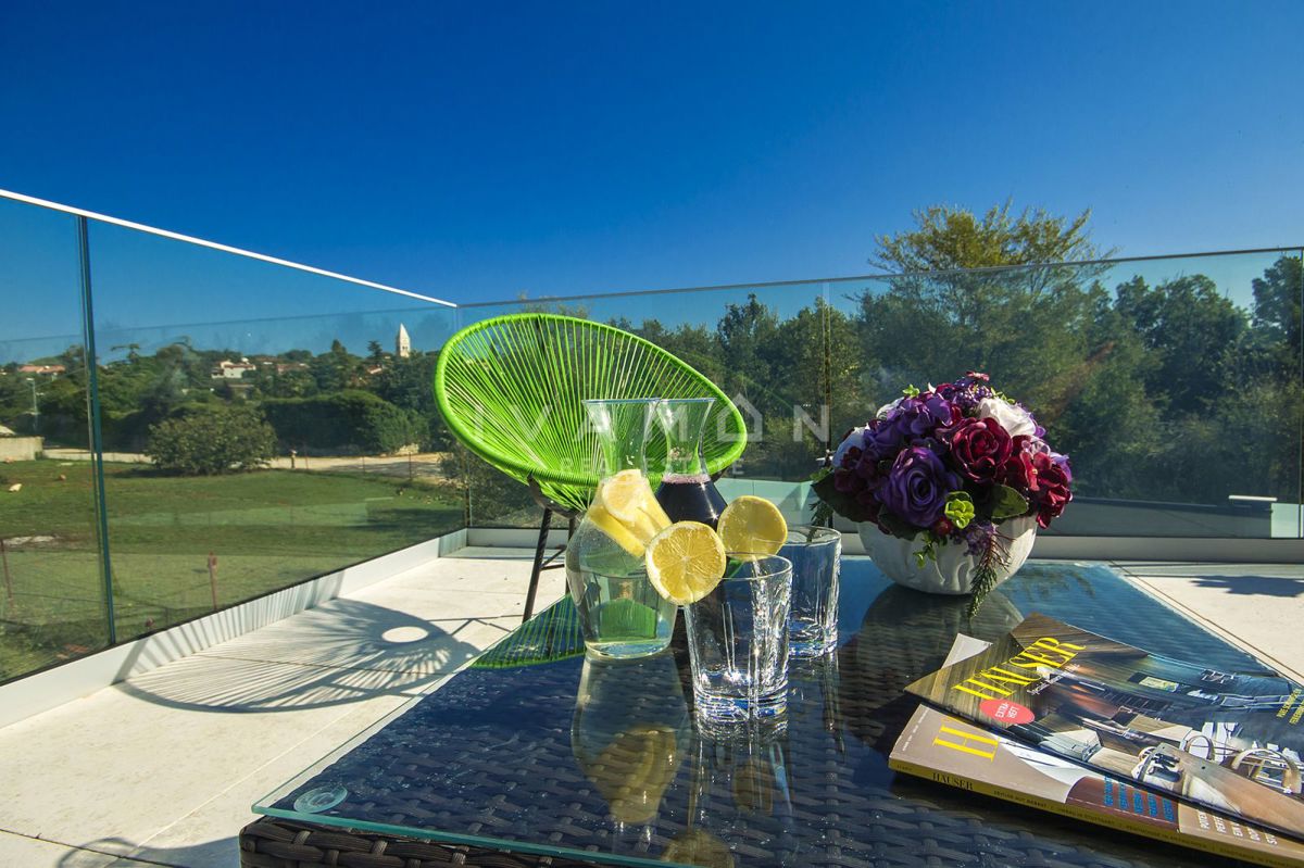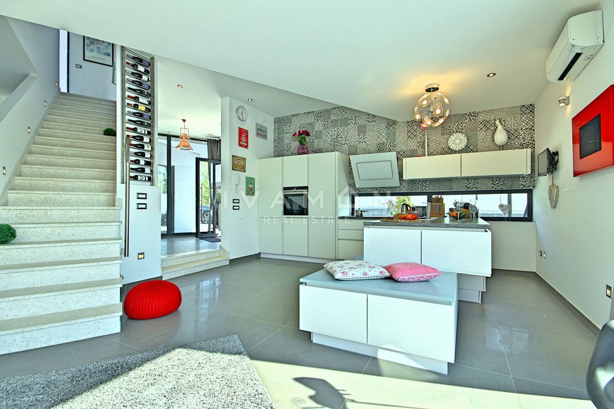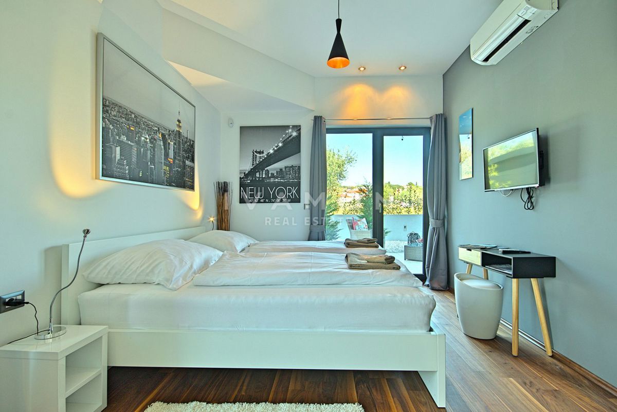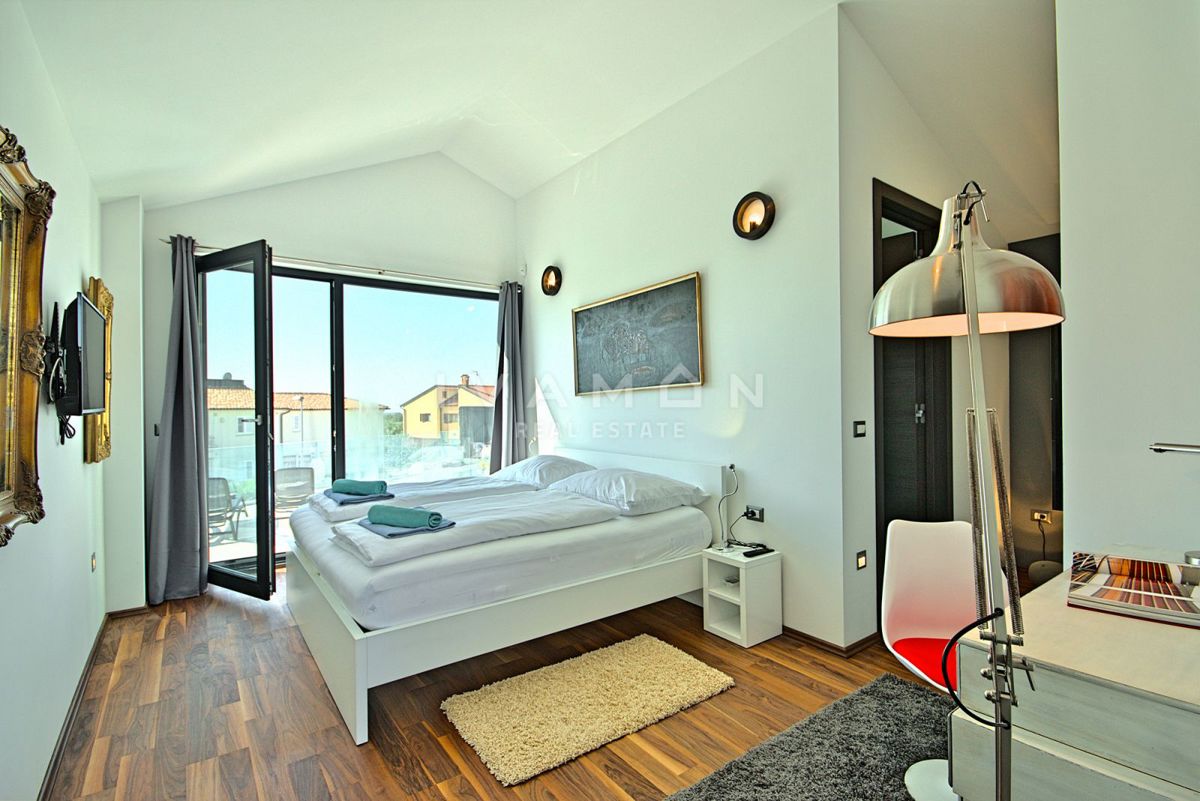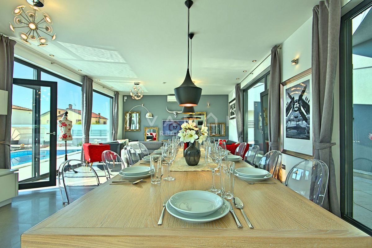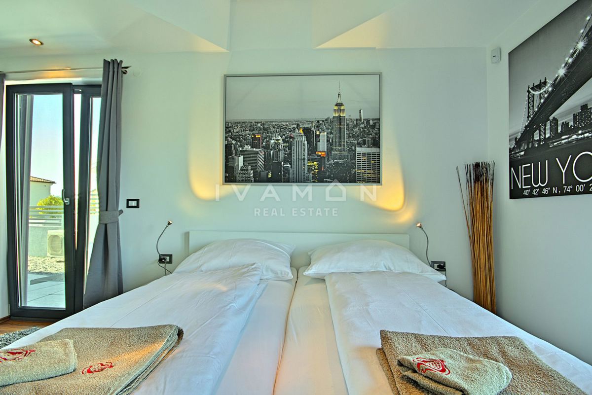 V bližini Poreča, osem kilometrov od morja, na zelo lepi mikrolokaciji, je naprodaj nova vila s bazenom in petimi spalnicami. Vila obsega 385,5 m² površine, razporejene v pritličju in nadstropju. Ponaša se z zelo zanimivo arhitekturo in zunanjostjo. Je r