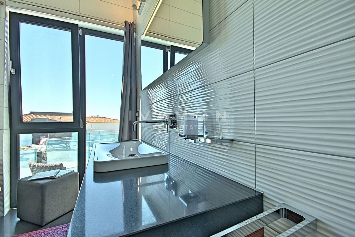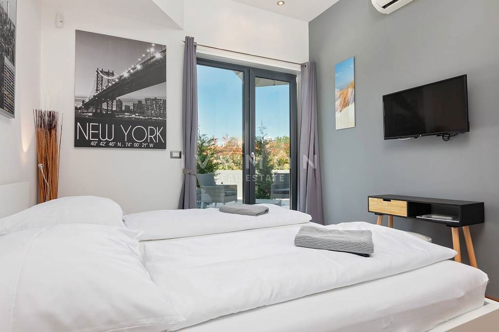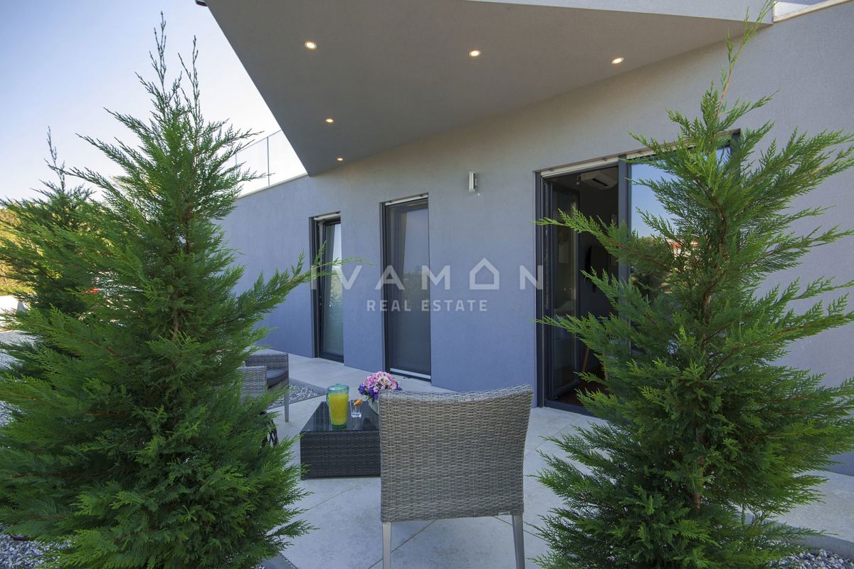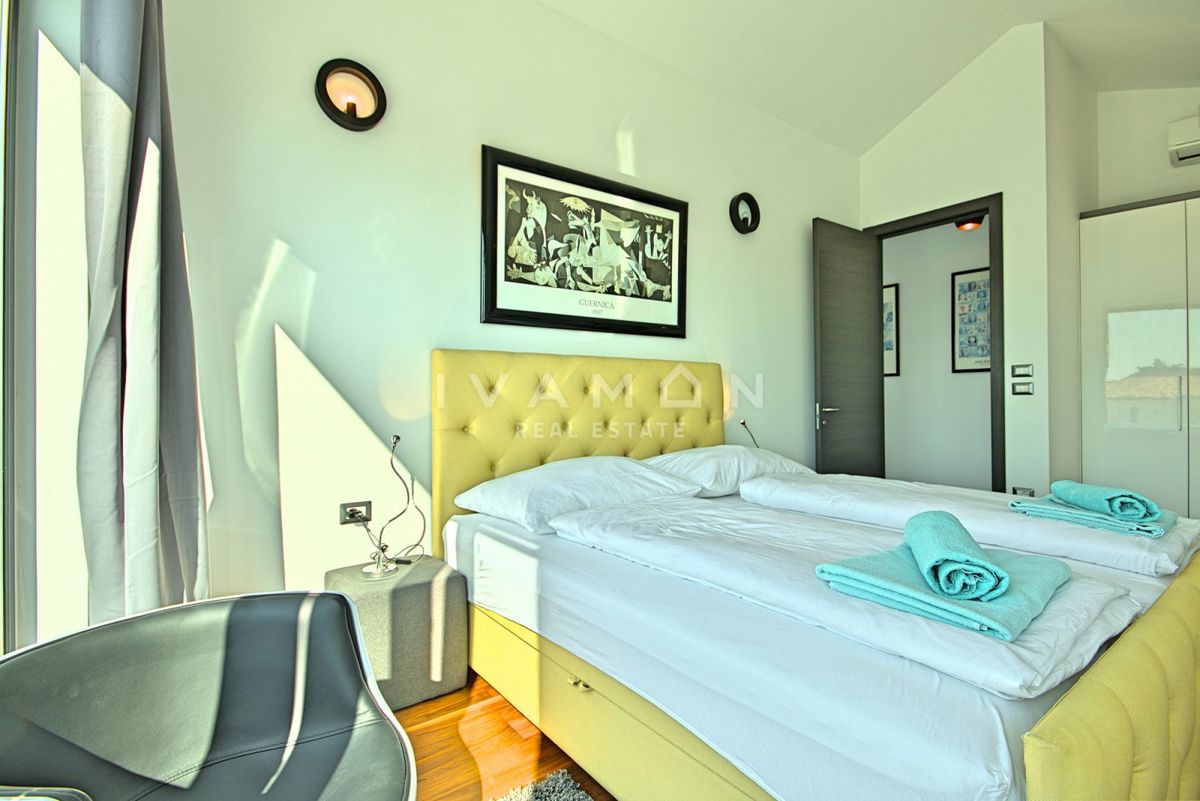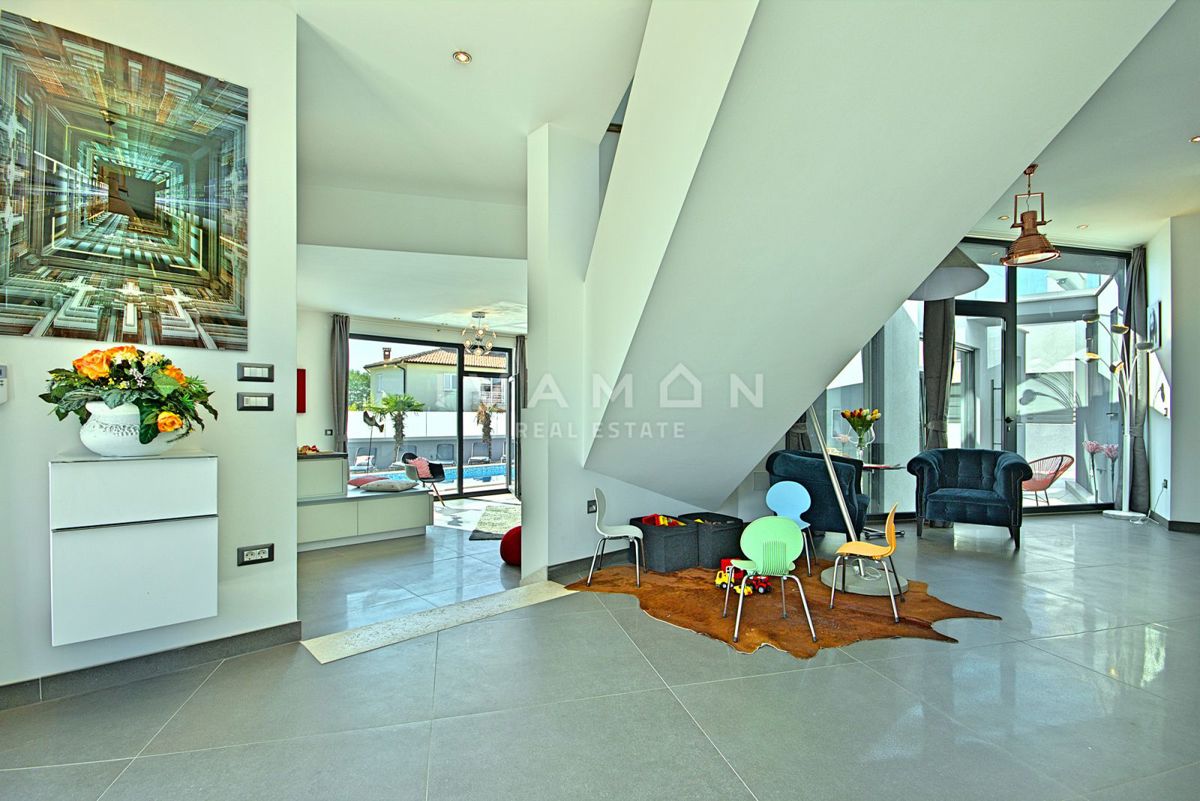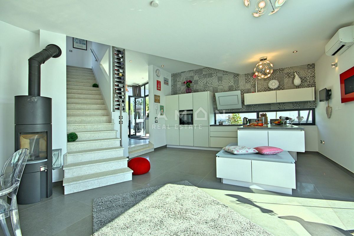 V bližini Poreča, osem kilometrov od morja, na zelo lepi mikrolokaciji, je naprodaj nova vila s bazenom in petimi spalnicami. Vila obsega 385,5 m² površine, razporejene v pritličju in nadstropju. Ponaša se z zelo zanimivo arhitekturo in zunanjostjo. Je r