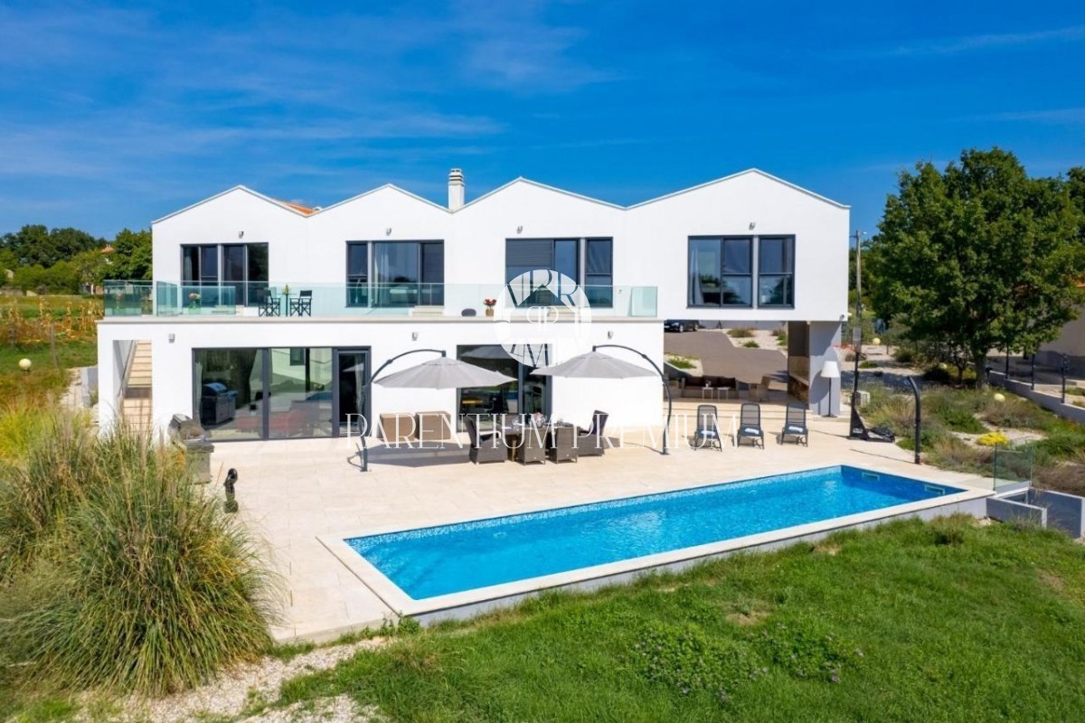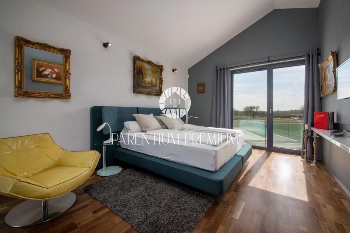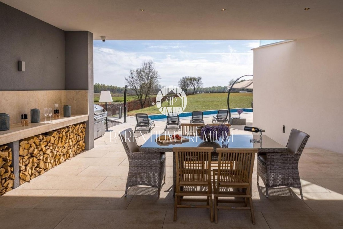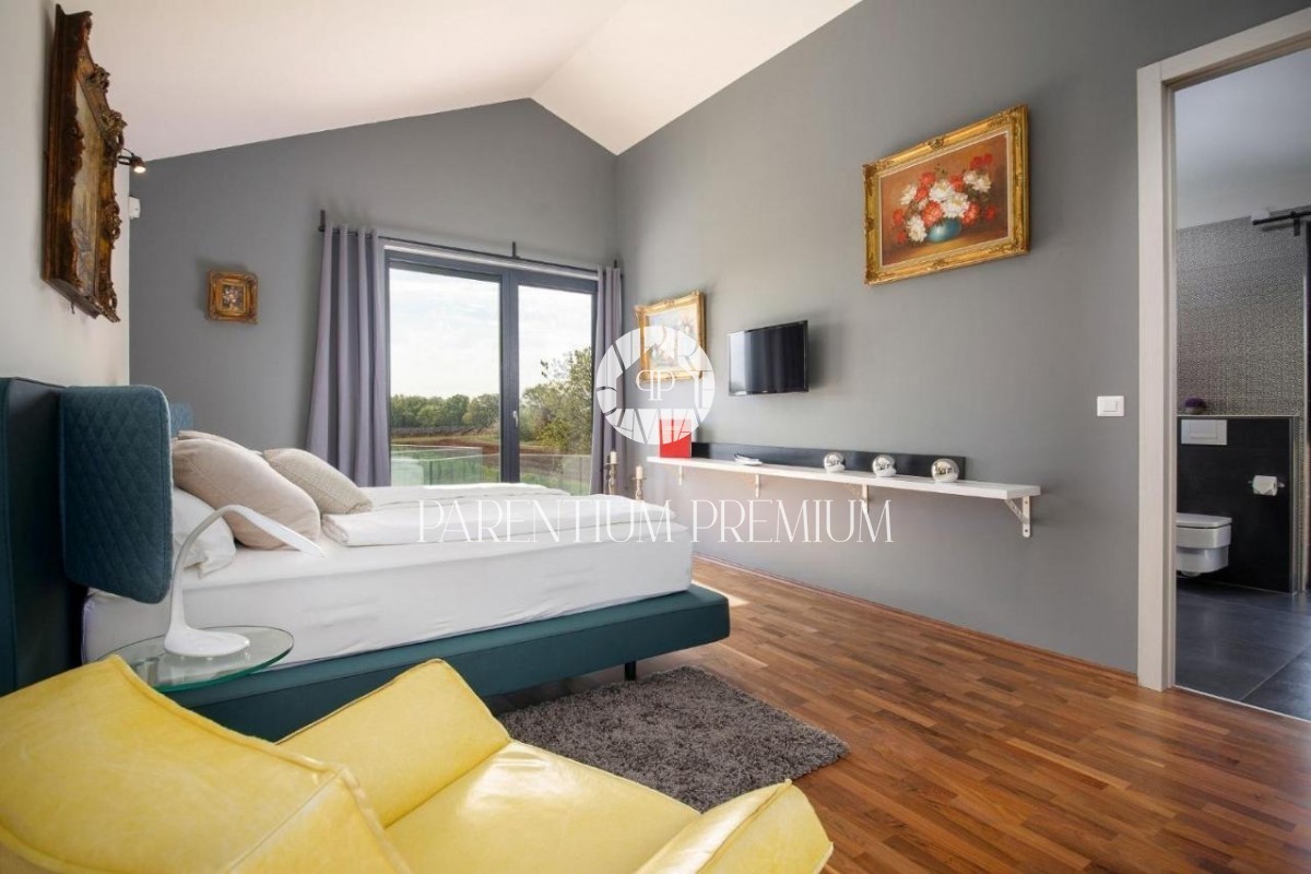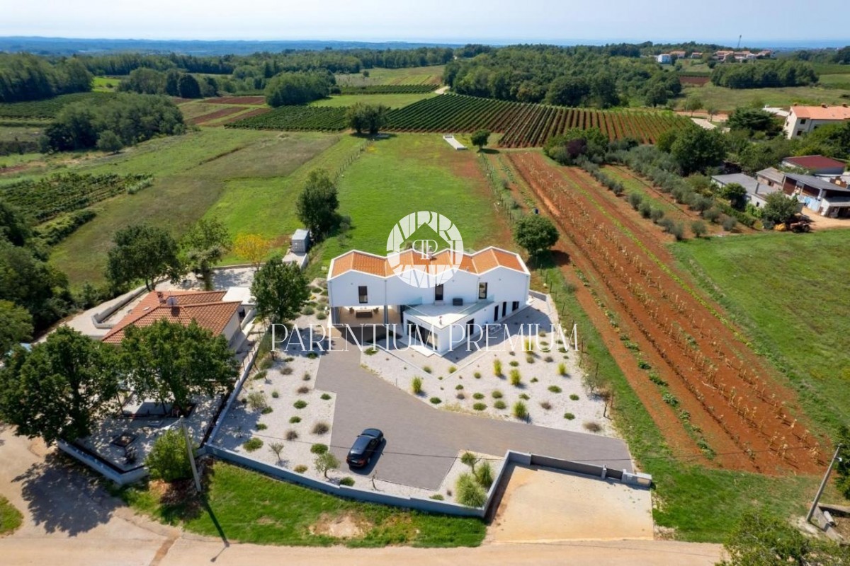 Istra, okolica Poreča Na robu majhnega istrskega mesteca se prodaja luksuzna vila z bazenom. Nahaja se na velikem zemljišču 6270 m2, obdanem z naravo in vinogradi. Skupna površina vile je 454 m2, ki se razteza v dveh etažah. V pritličju je kuhinja z jedi