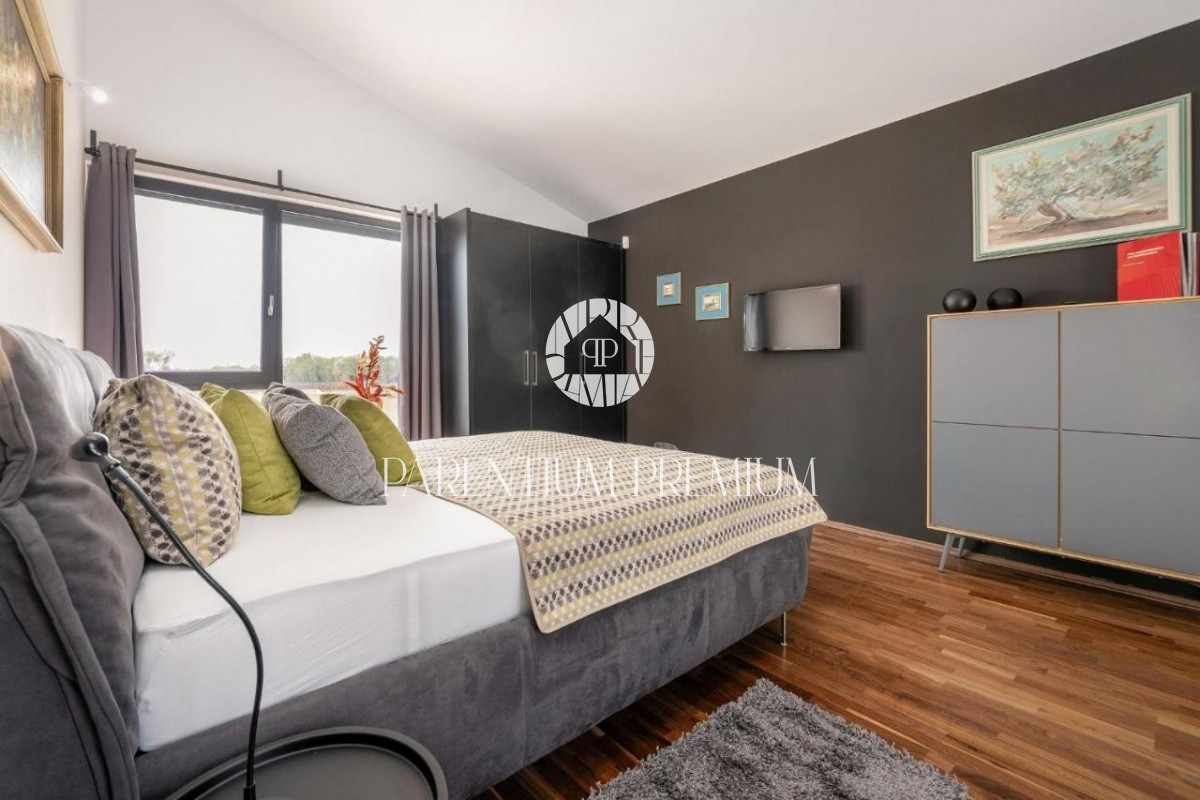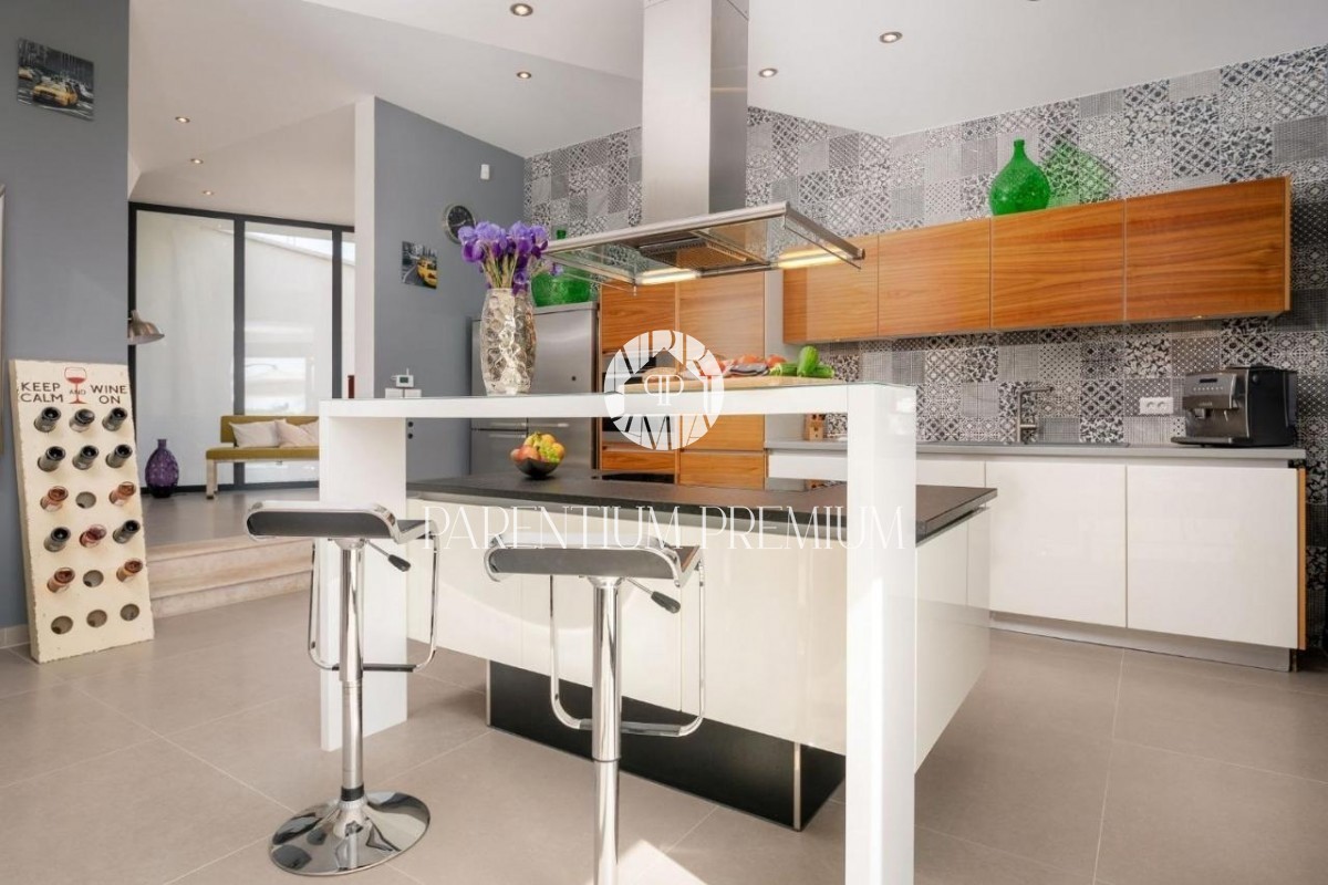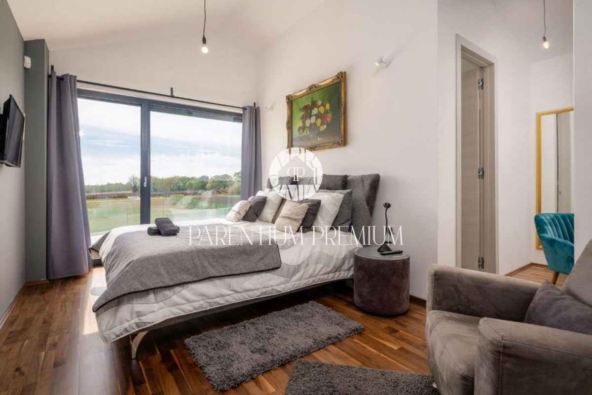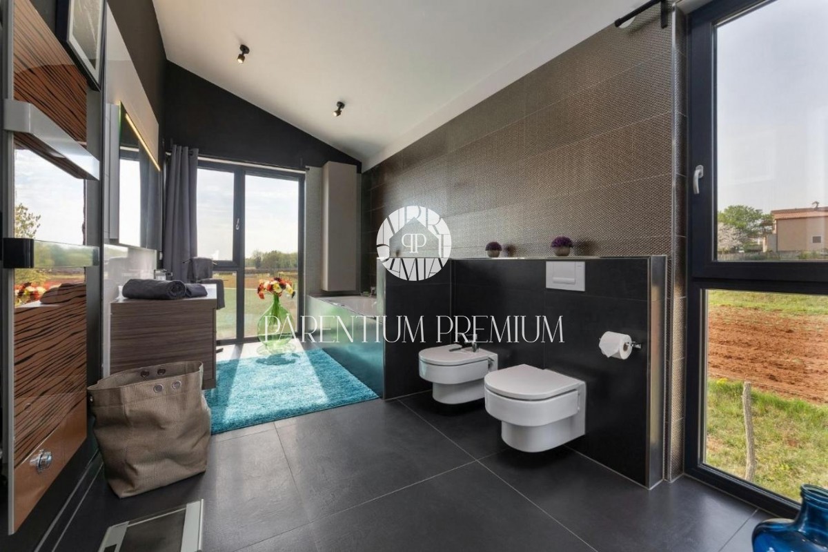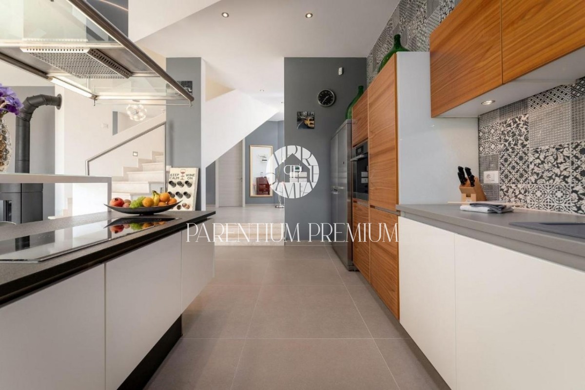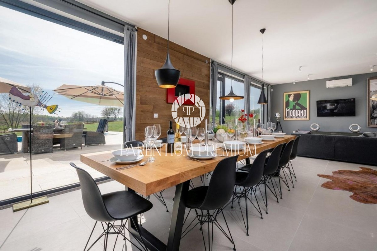 Istra, okolica Poreča Na robu majhnega istrskega mesteca se prodaja luksuzna vila z bazenom. Nahaja se na velikem zemljišču 6270 m2, obdanem z naravo in vinogradi. Skupna površina vile je 454 m2, ki se razteza v dveh etažah. V pritličju je kuhinja z jedi