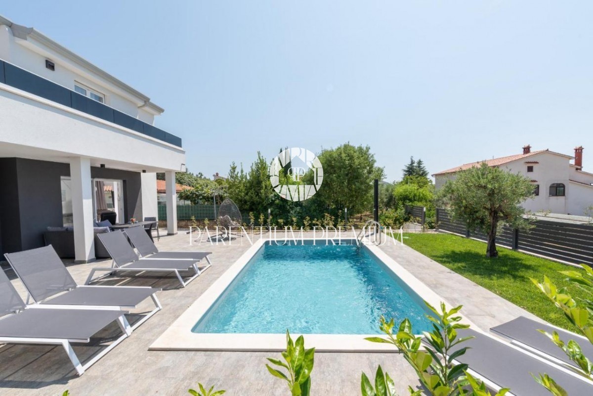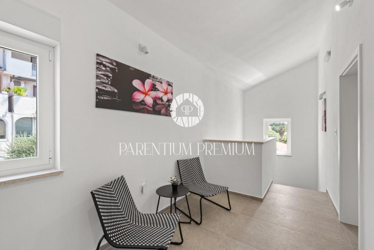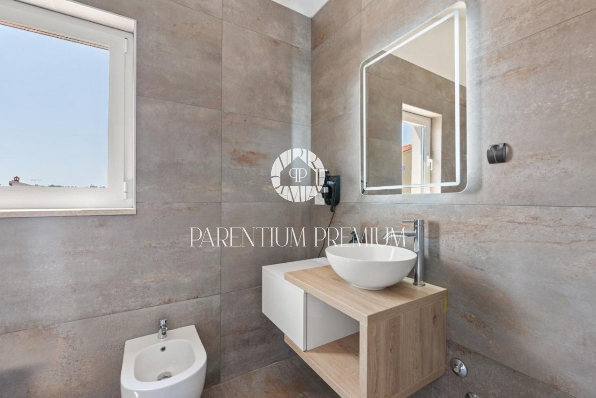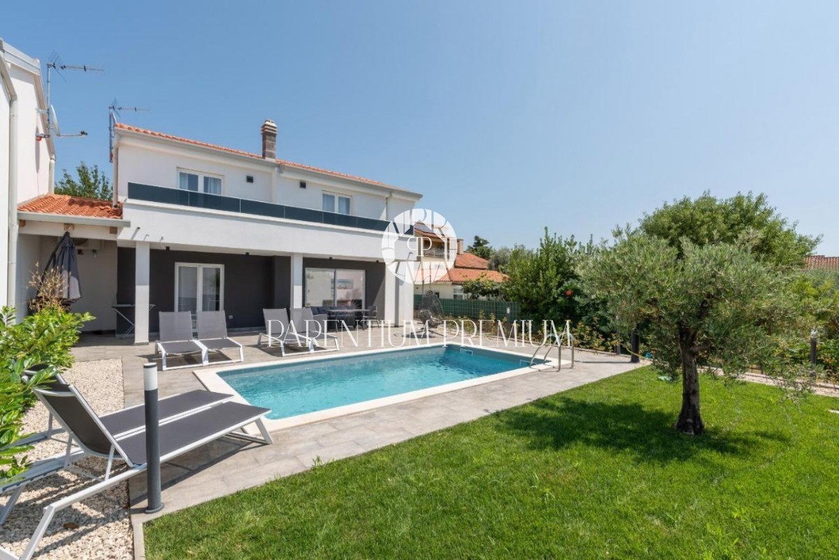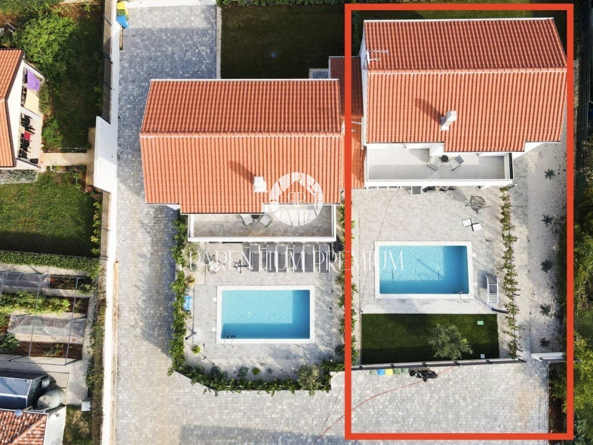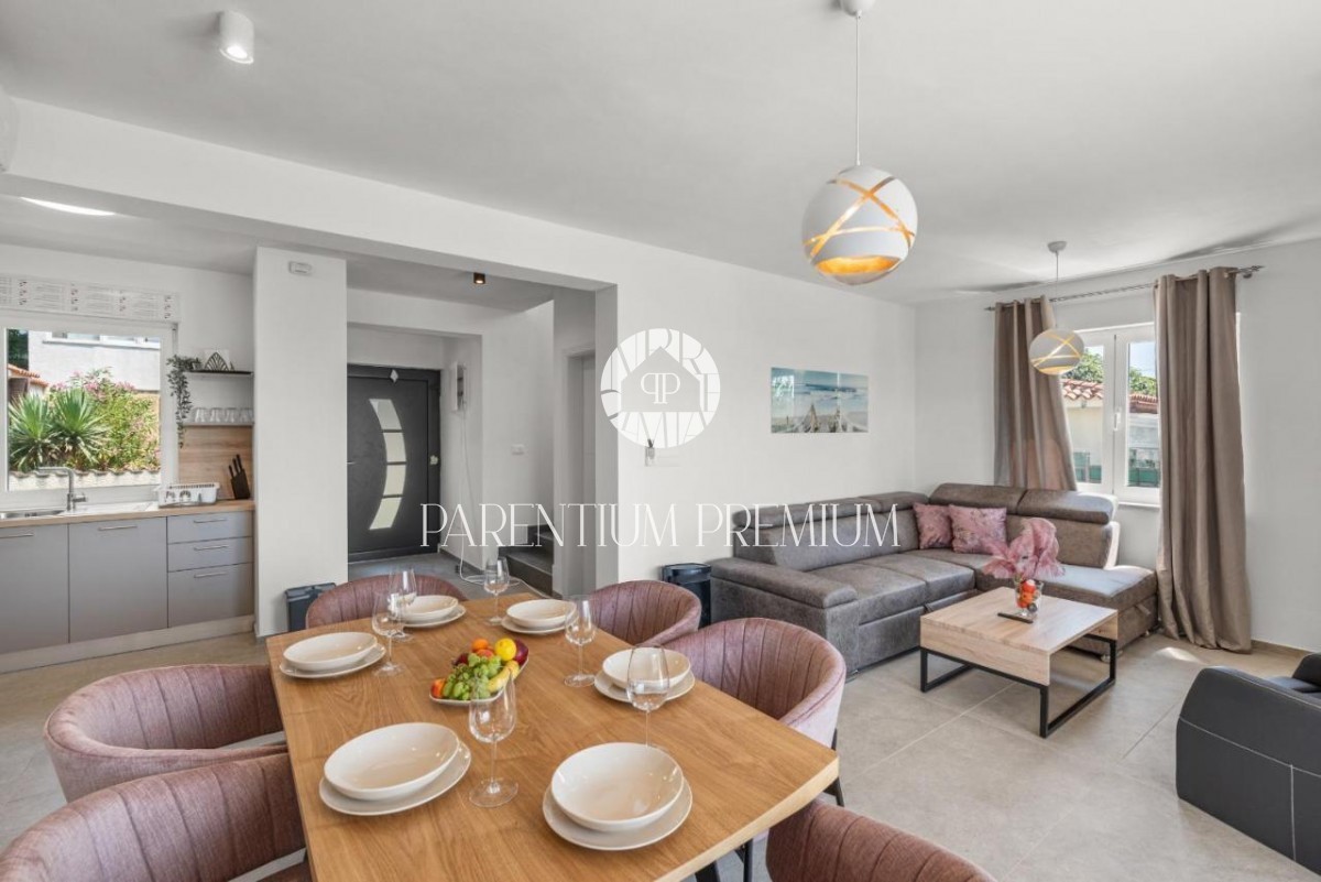 Istra, Poreč V neposredni bližini mesta Poreč in morja se prodaja ta odlična hiša dvojček z bazenom 160m2. Hiša je razdeljena na 2 etaži. Pritličje je sestavljeno iz predsobe, spalnice z lastno kopalnico, ki vodi na sončno teraso in bazen, kuhinje z jed