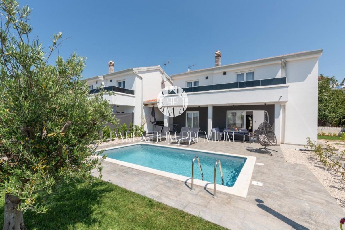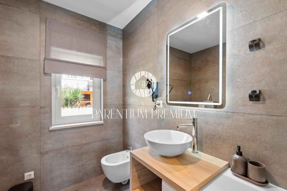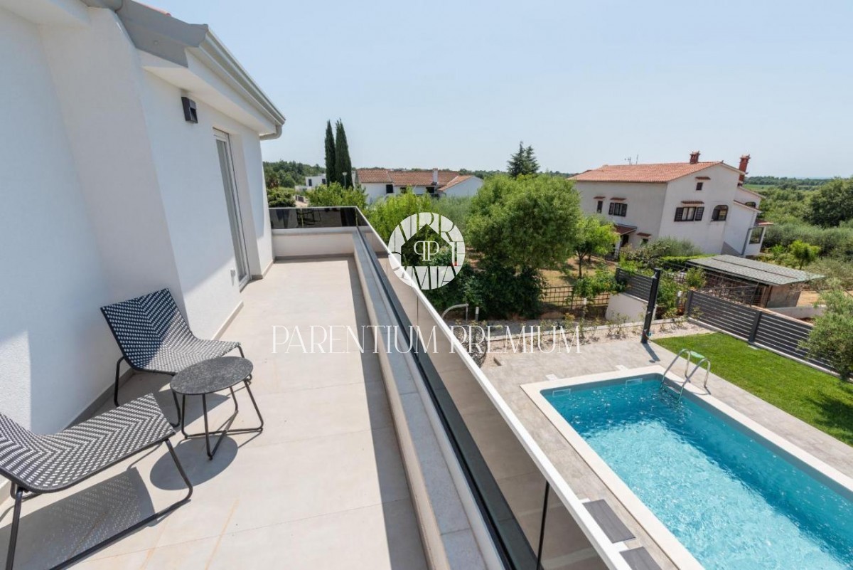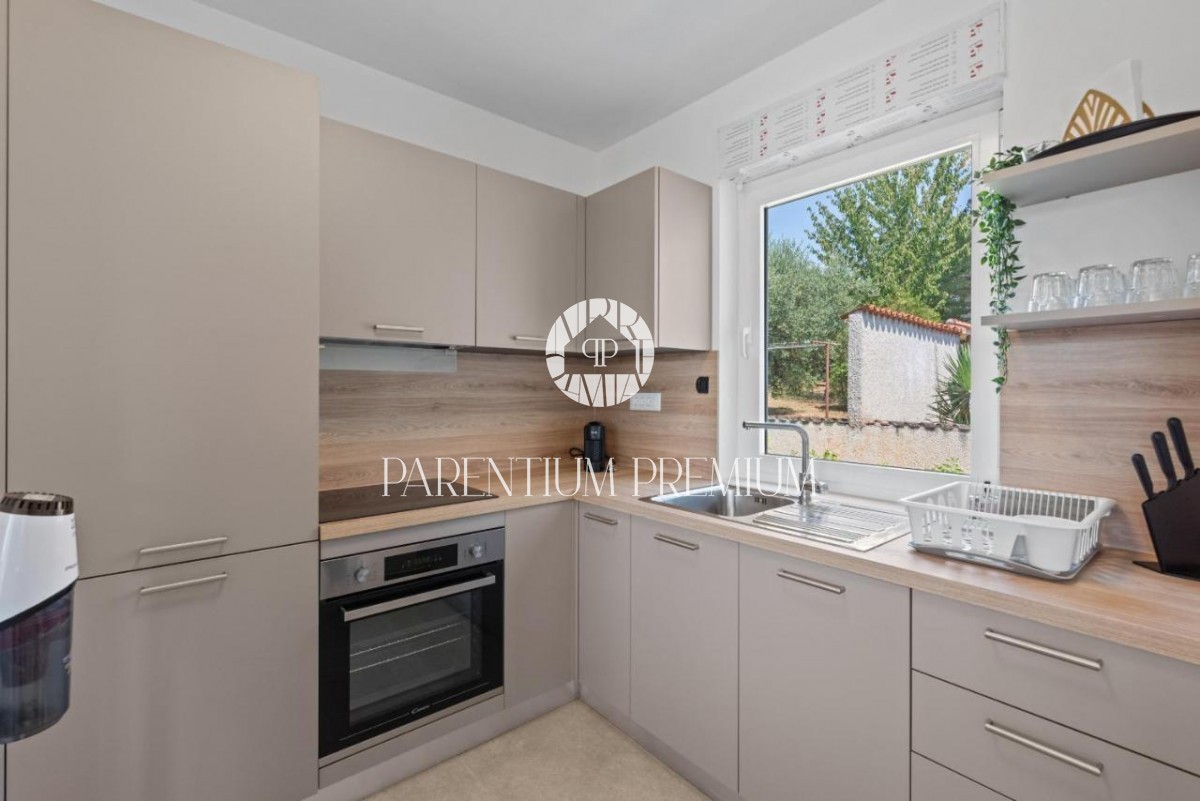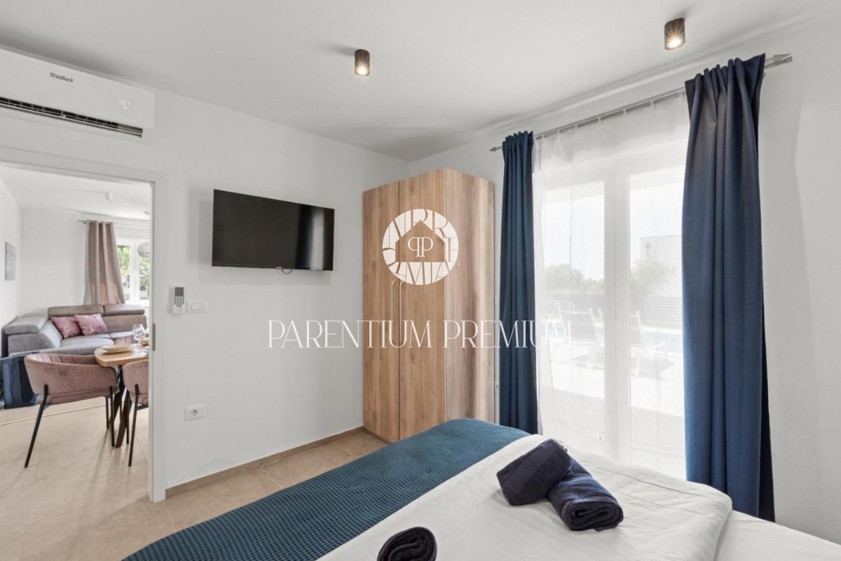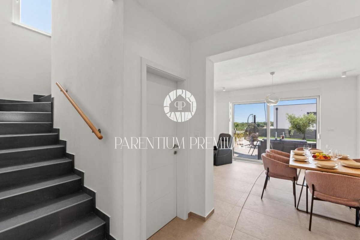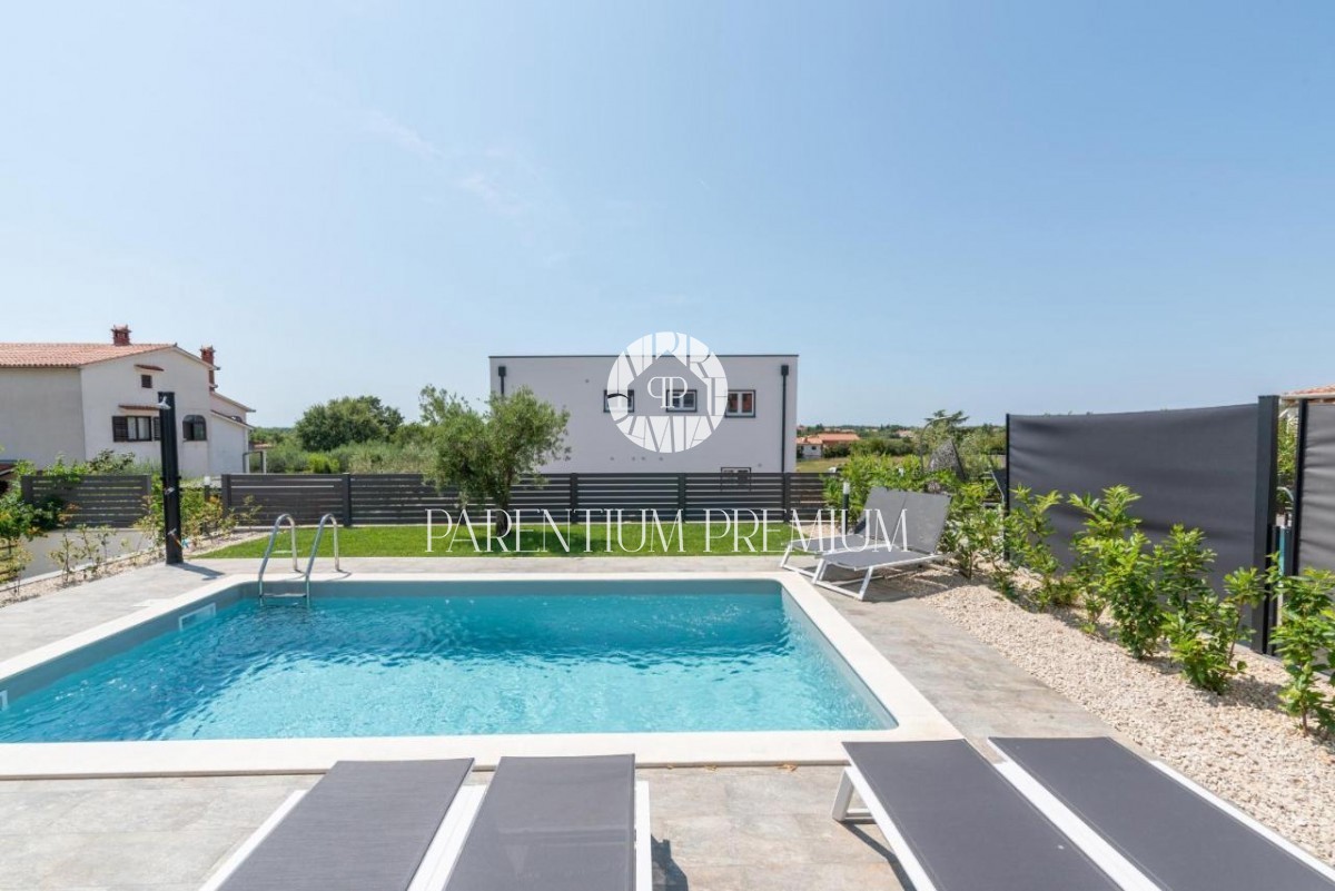 Istra, Poreč V neposredni bližini mesta Poreč in morja se prodaja ta odlična hiša dvojček z bazenom 160m2. Hiša je razdeljena na 2 etaži. Pritličje je sestavljeno iz predsobe, spalnice z lastno kopalnico, ki vodi na sončno teraso in bazen, kuhinje z jed