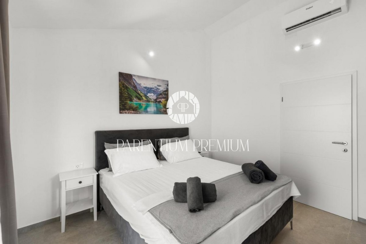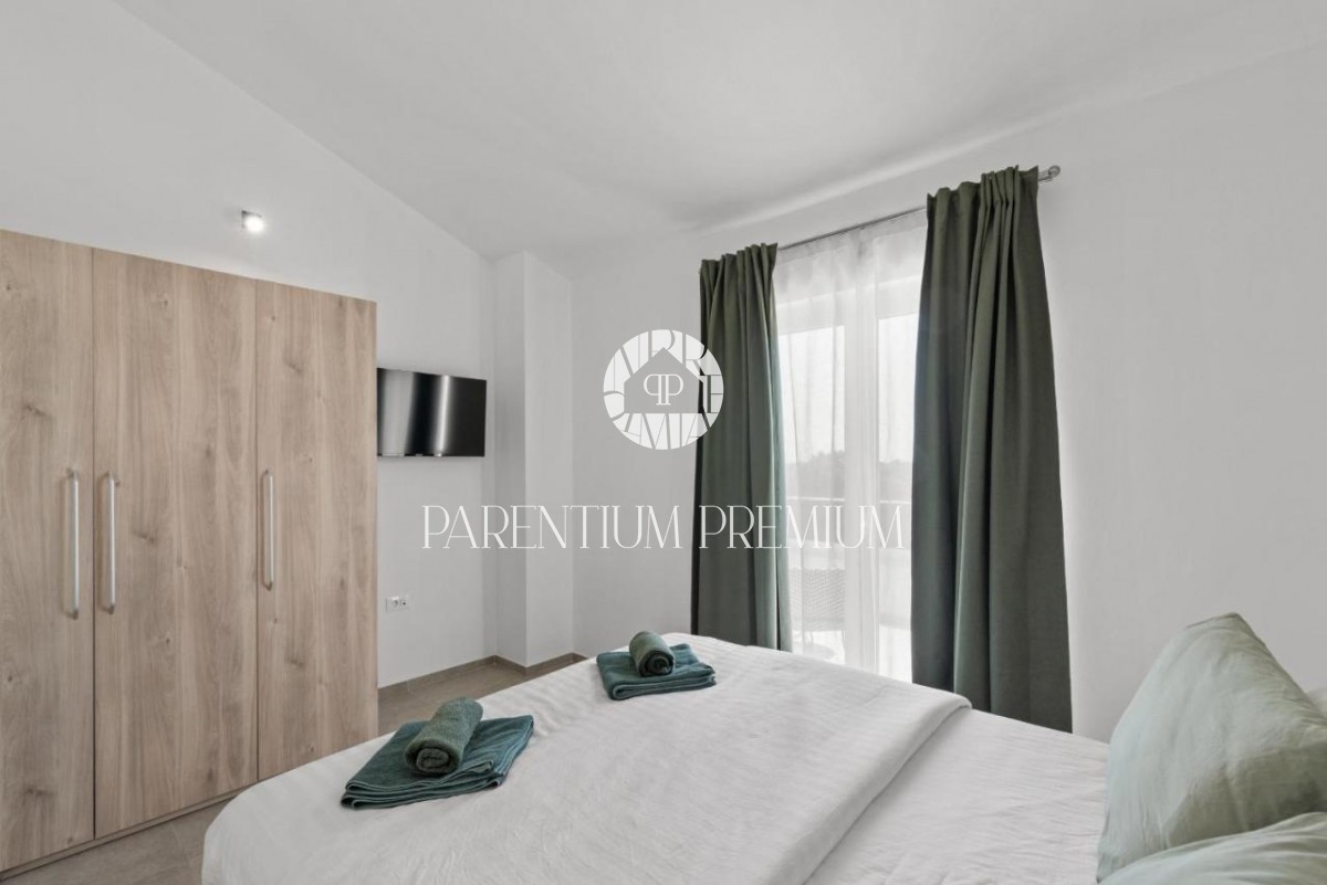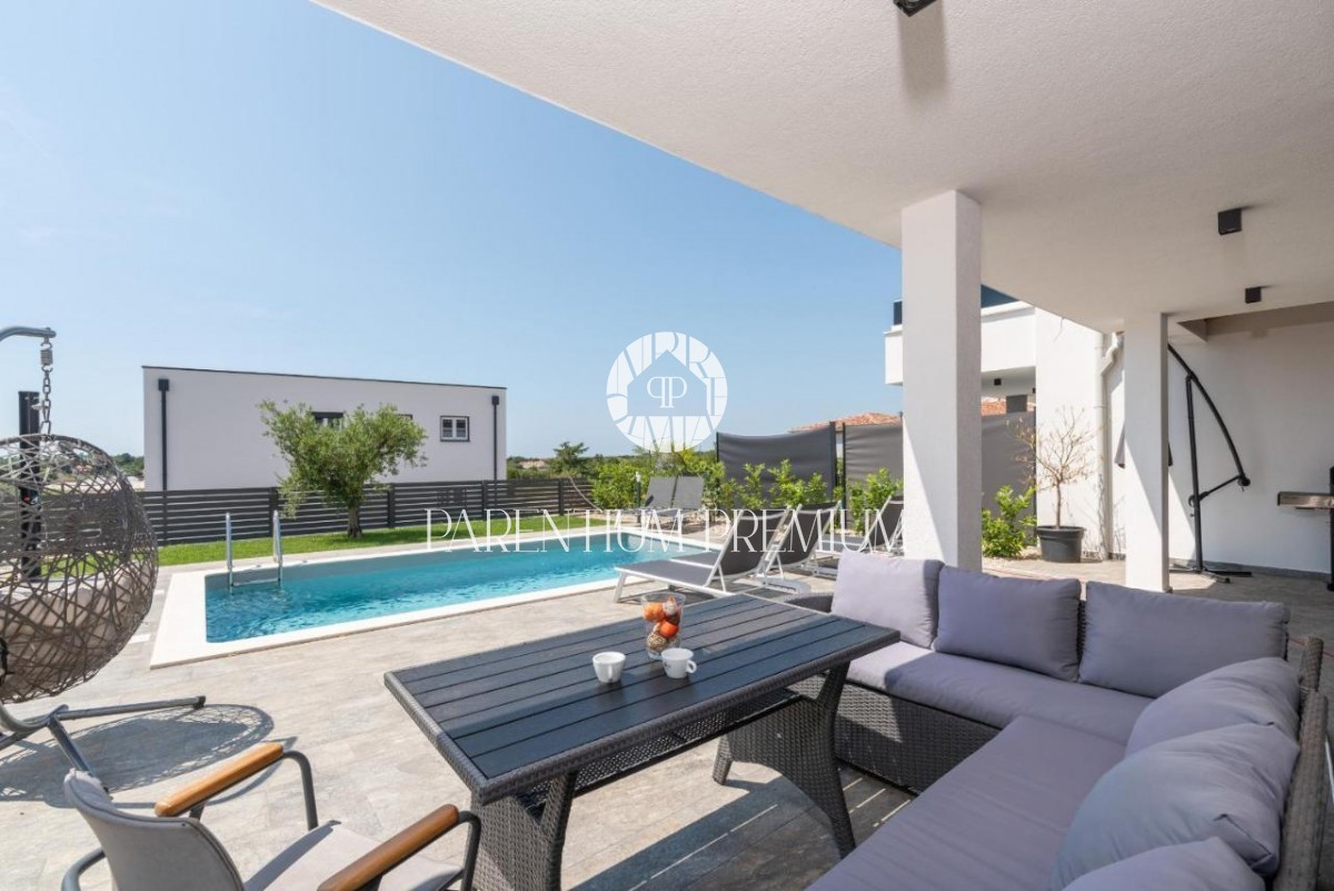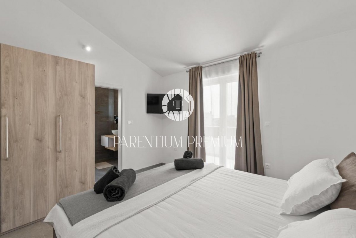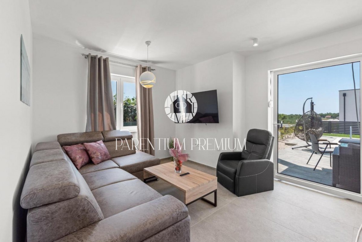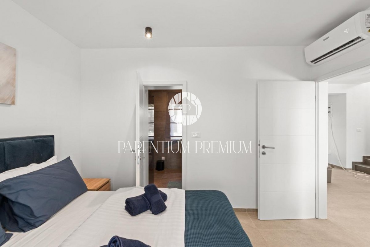 Istra, Poreč V neposredni bližini mesta Poreč in morja se prodaja ta odlična hiša dvojček z bazenom 160m2. Hiša je razdeljena na 2 etaži. Pritličje je sestavljeno iz predsobe, spalnice z lastno kopalnico, ki vodi na sončno teraso in bazen, kuhinje z jed