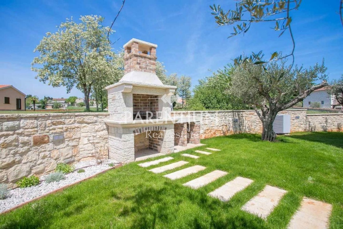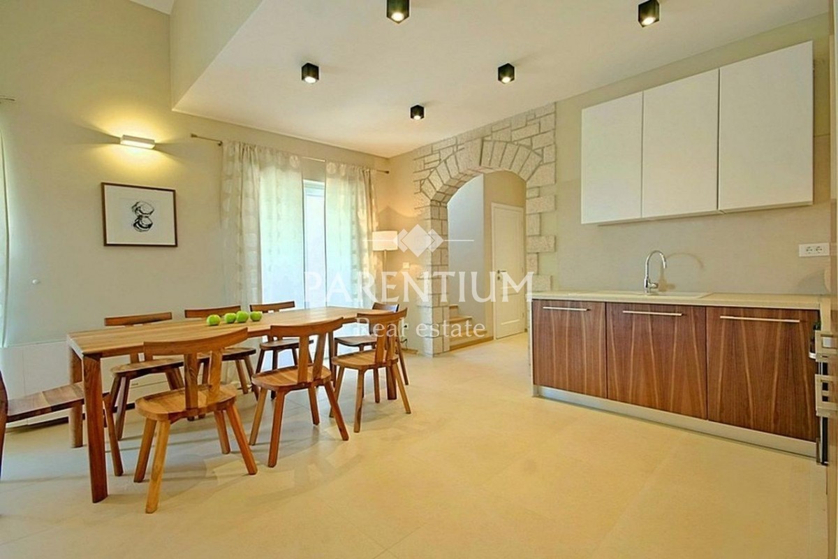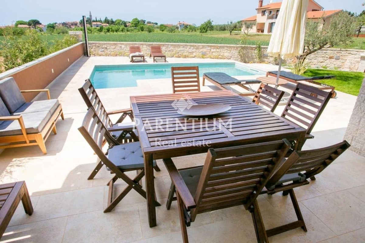 Istra, okolica Poreča Na prodaj je ta čudovita vila z bazenom v urejenem vrtu. Hiša je sestavljena iz dveh etaž. V pritličju je velika dnevna soba, kuhinja in jedilnica z izhodom na teraso in vrt, dve spalnici in kopalnica. Medtem ko sta v prvem nadstro