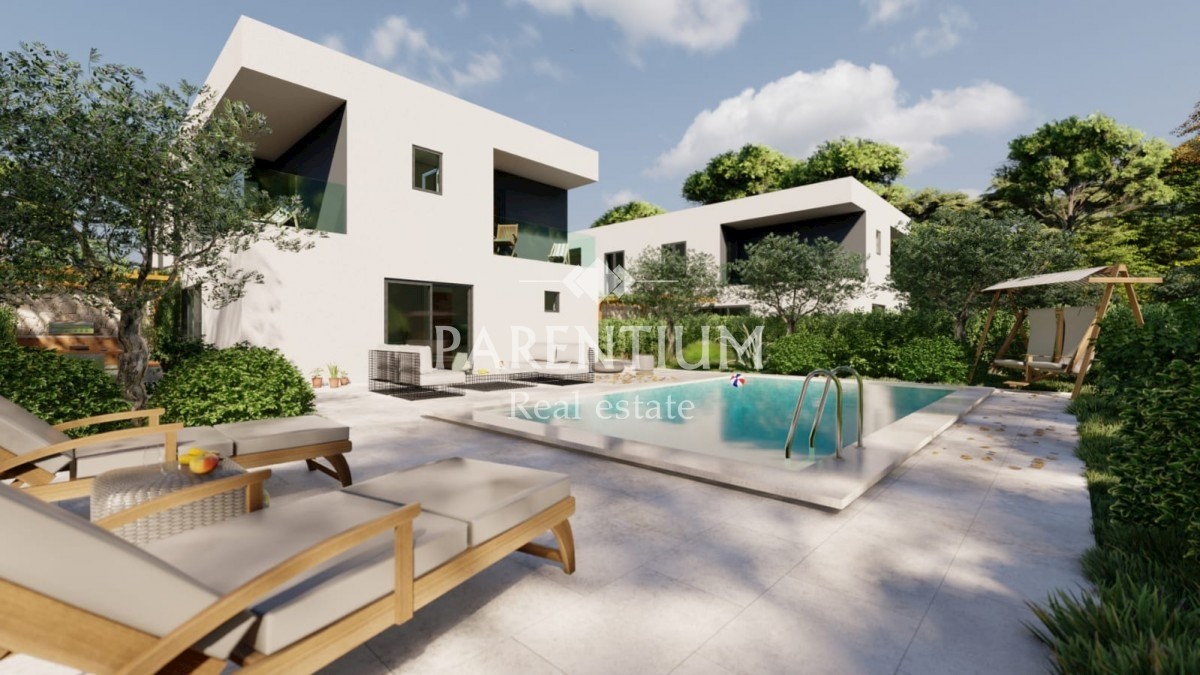Poreč, prodamo dvojček, 129 m2 in približno 410 m2 vrta. Ta čudovita in prostorna dvojček družinske hiše se nahaja na mirni lokaciji, le 2 km od starega mestnega jedra Poreča. Hiša je sestavljena iz predsobe, kopalnice, pomožne sobe, prostorne dnevne sobe