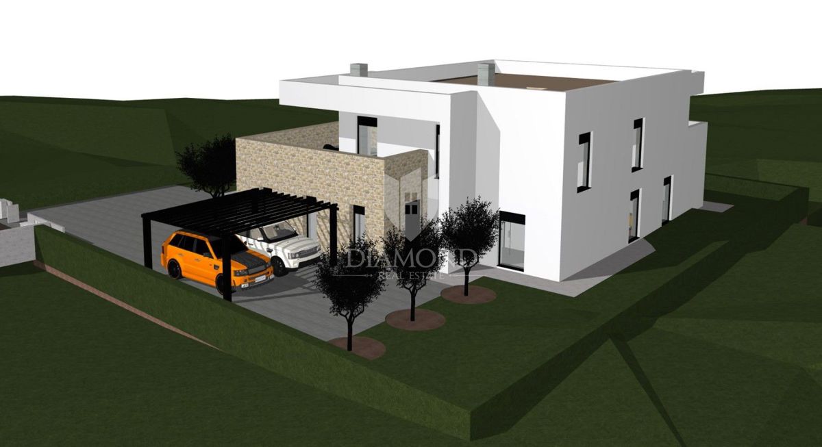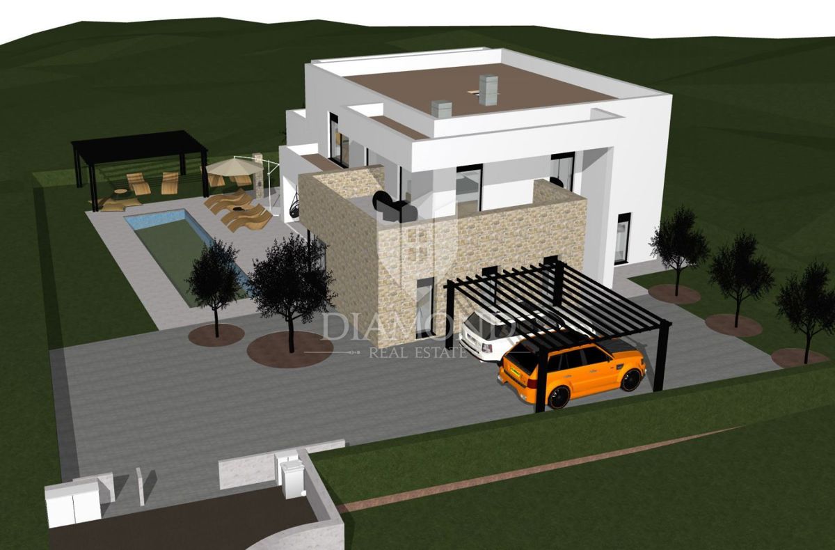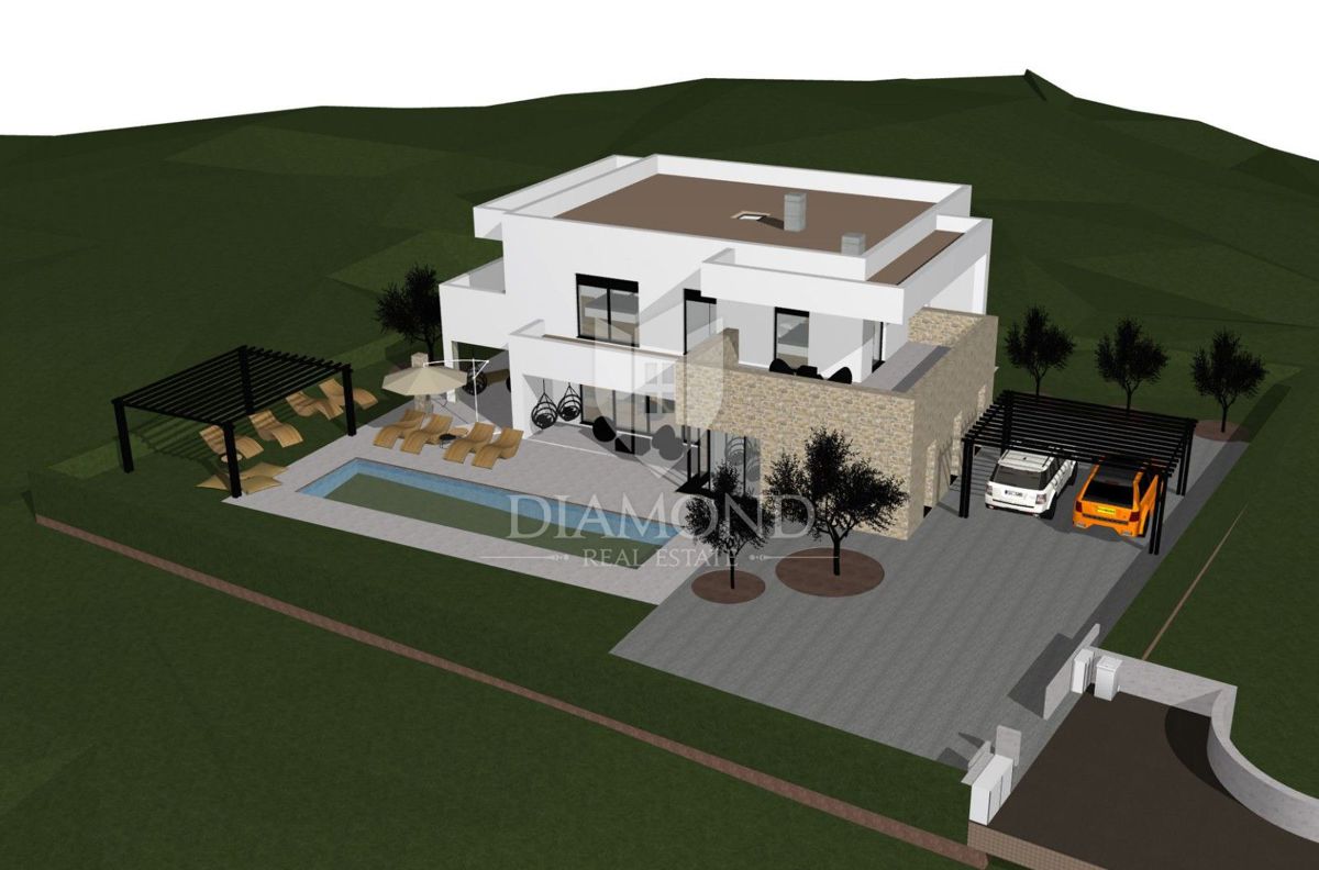 Poreč, okolica Luksuzna moderna vila z bazenom in pogledom na morje. Le nekaj kilometrov od mesta Poreč in le nekaj minut hoje od morja se prodaja ta luksuzna moderna vila z bazenom v gradnji. Vila se nahaja na parceli velikosti 906m2, njena površina