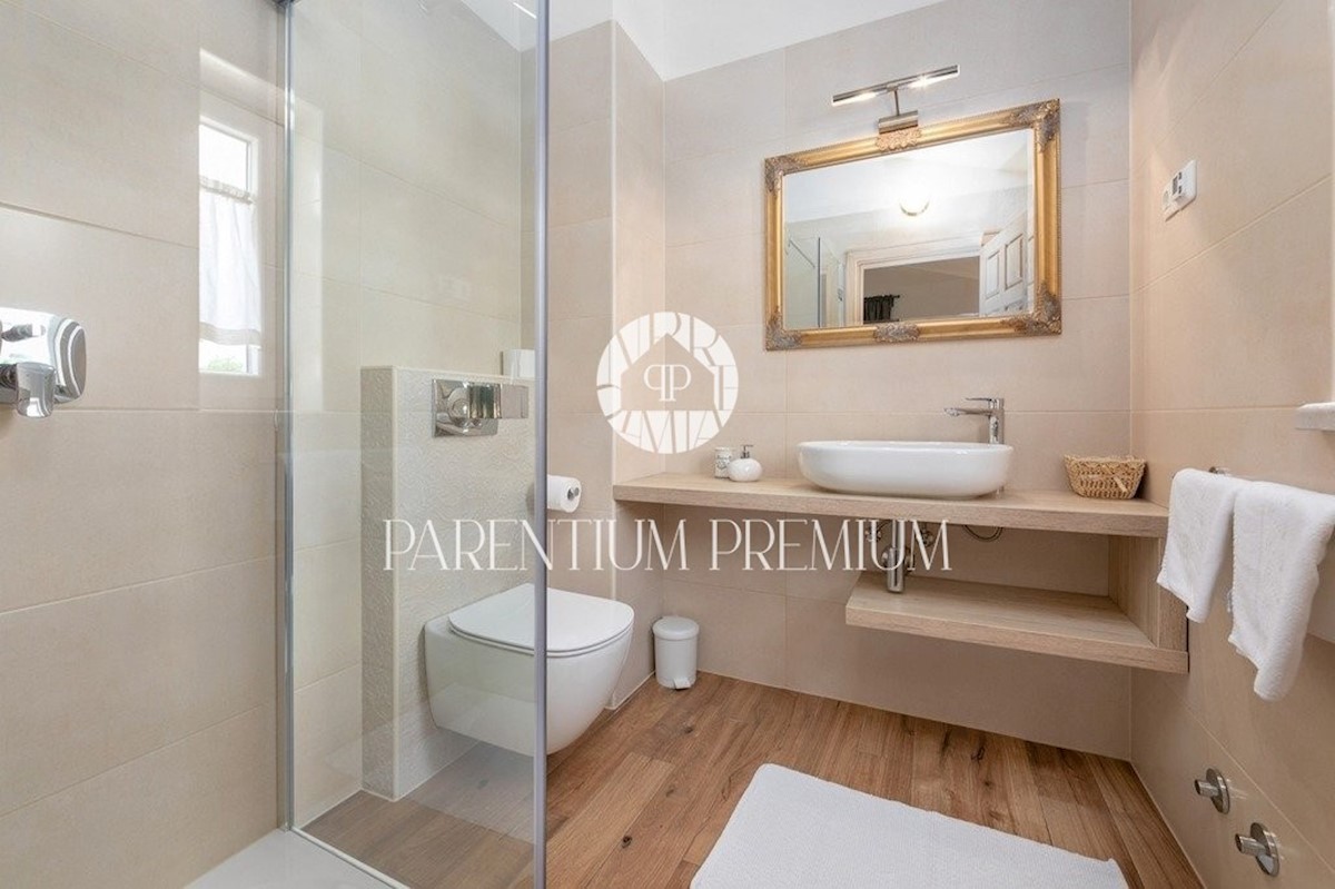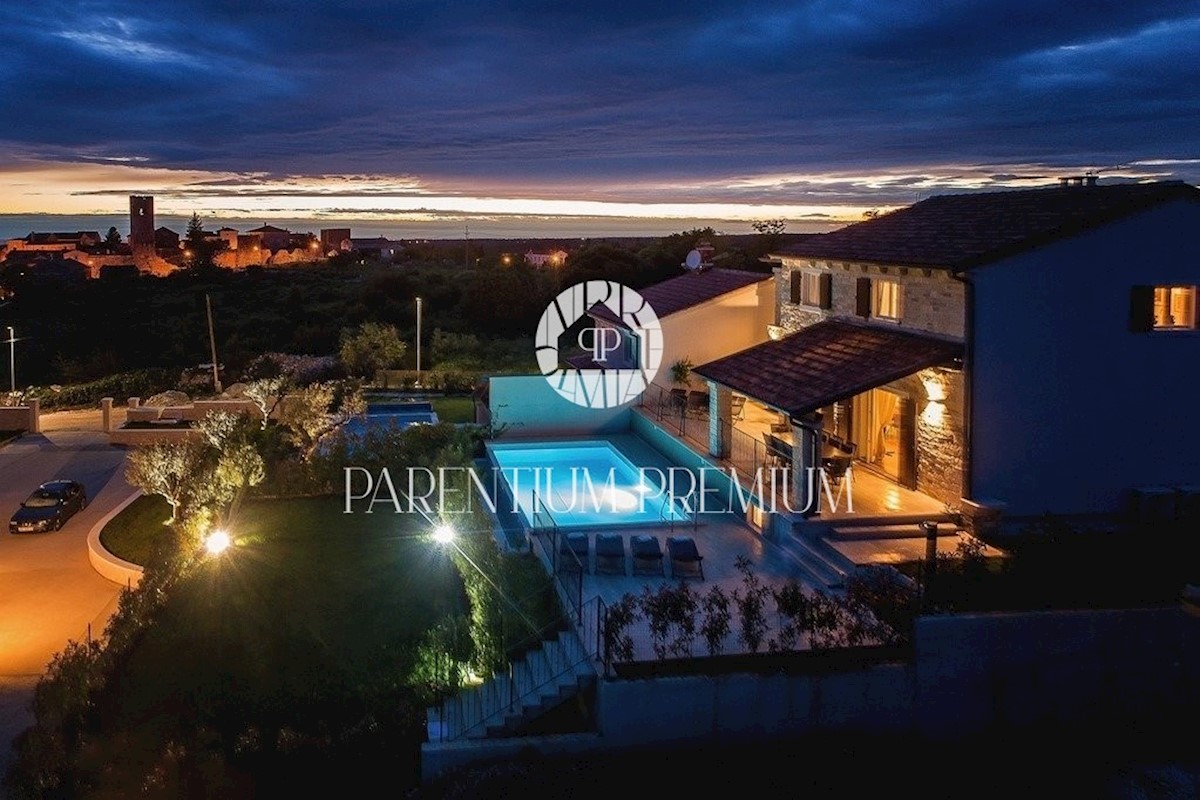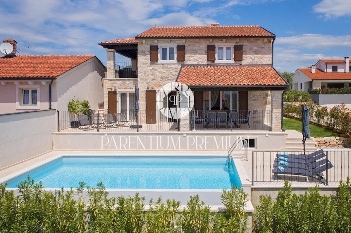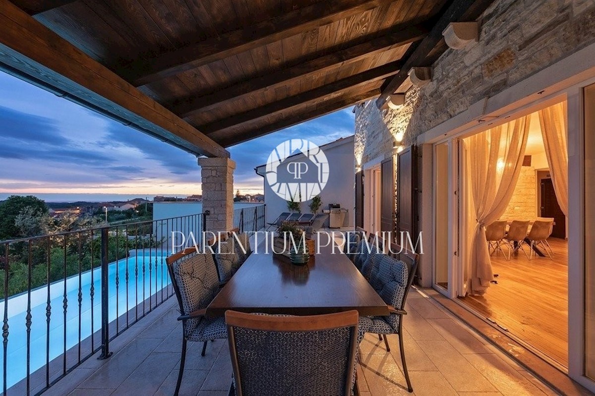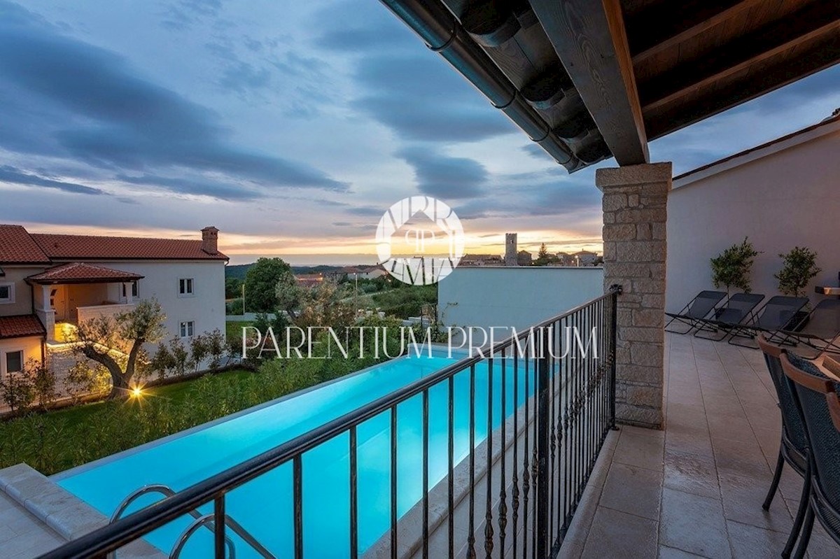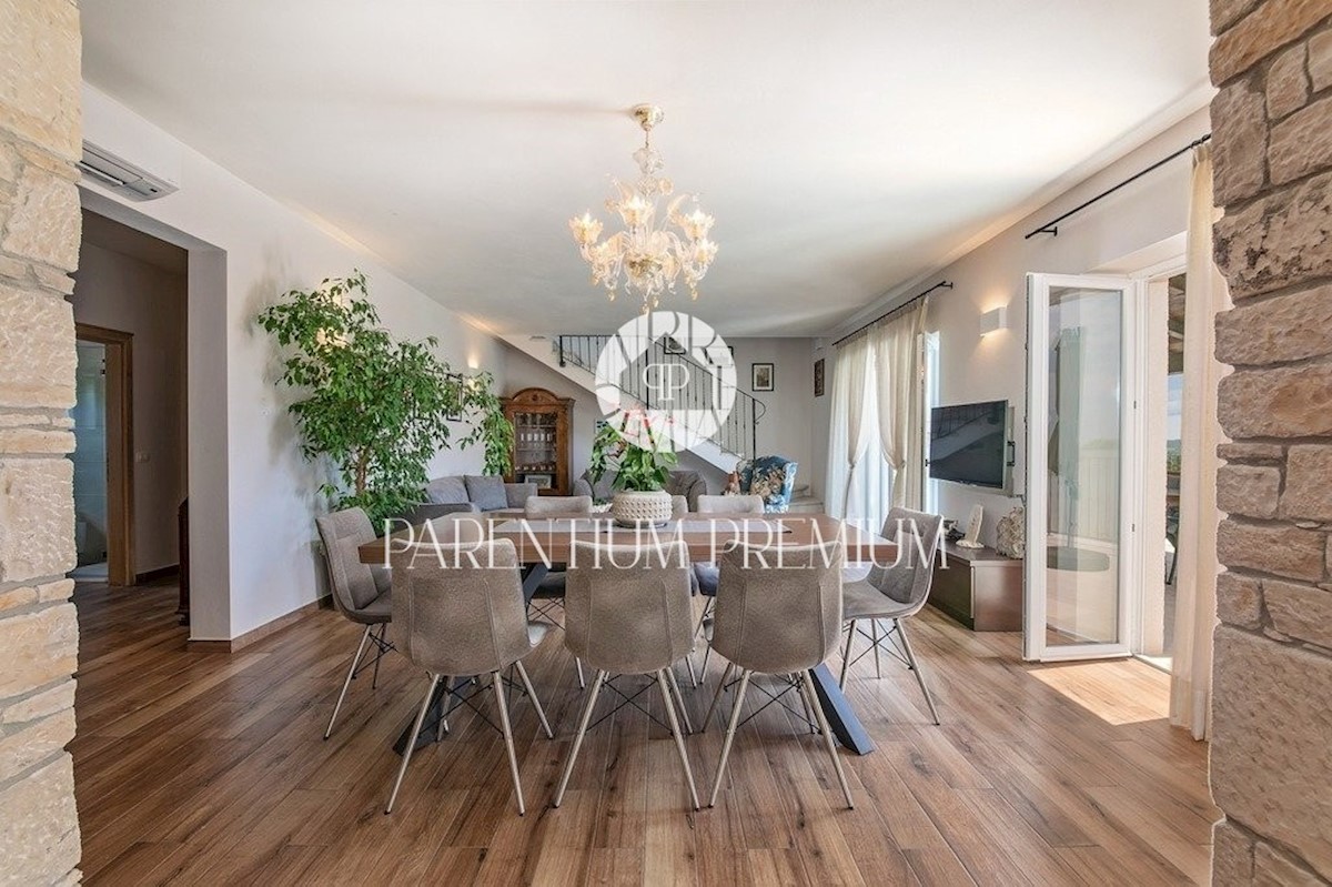 Istra, Poreč Ta dizajnerska vila velikosti 355m2 s parcelo 562m2 je zgrajena v istrskem slogu in se nahaja v majhnem, mirnem kraju v bližini mesta Poreč. Pritličje vile sestavljajo predprostor, kuhinja, jedilnica in velika dnevna soba z izhodom na pokri