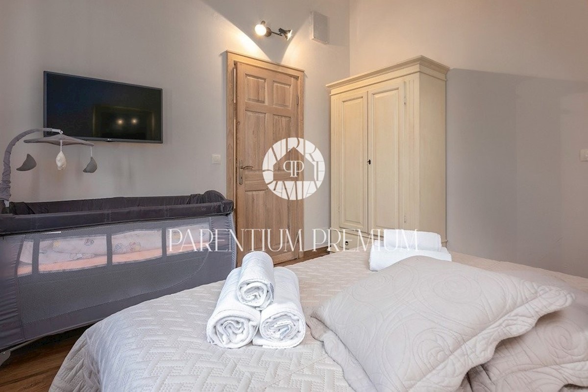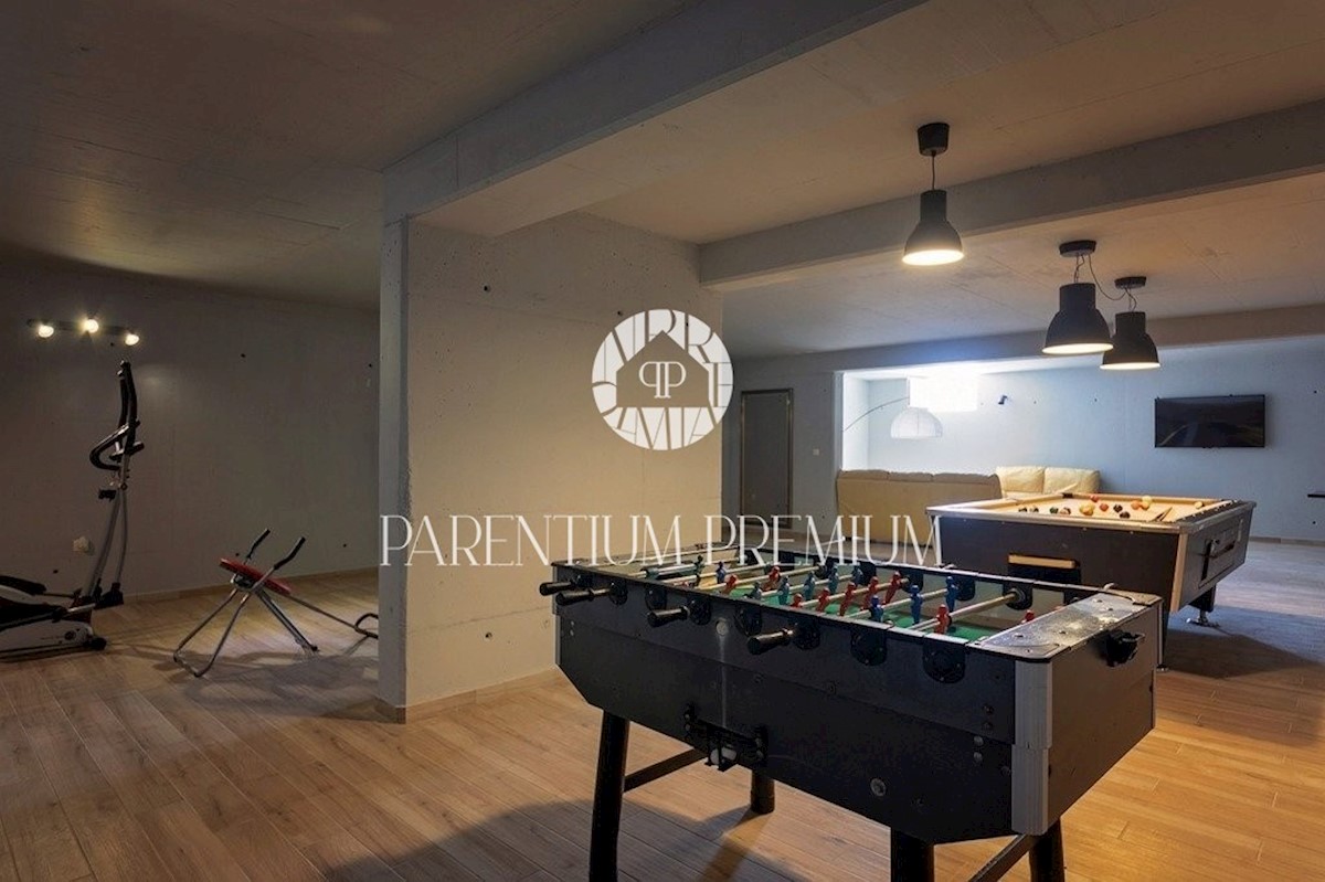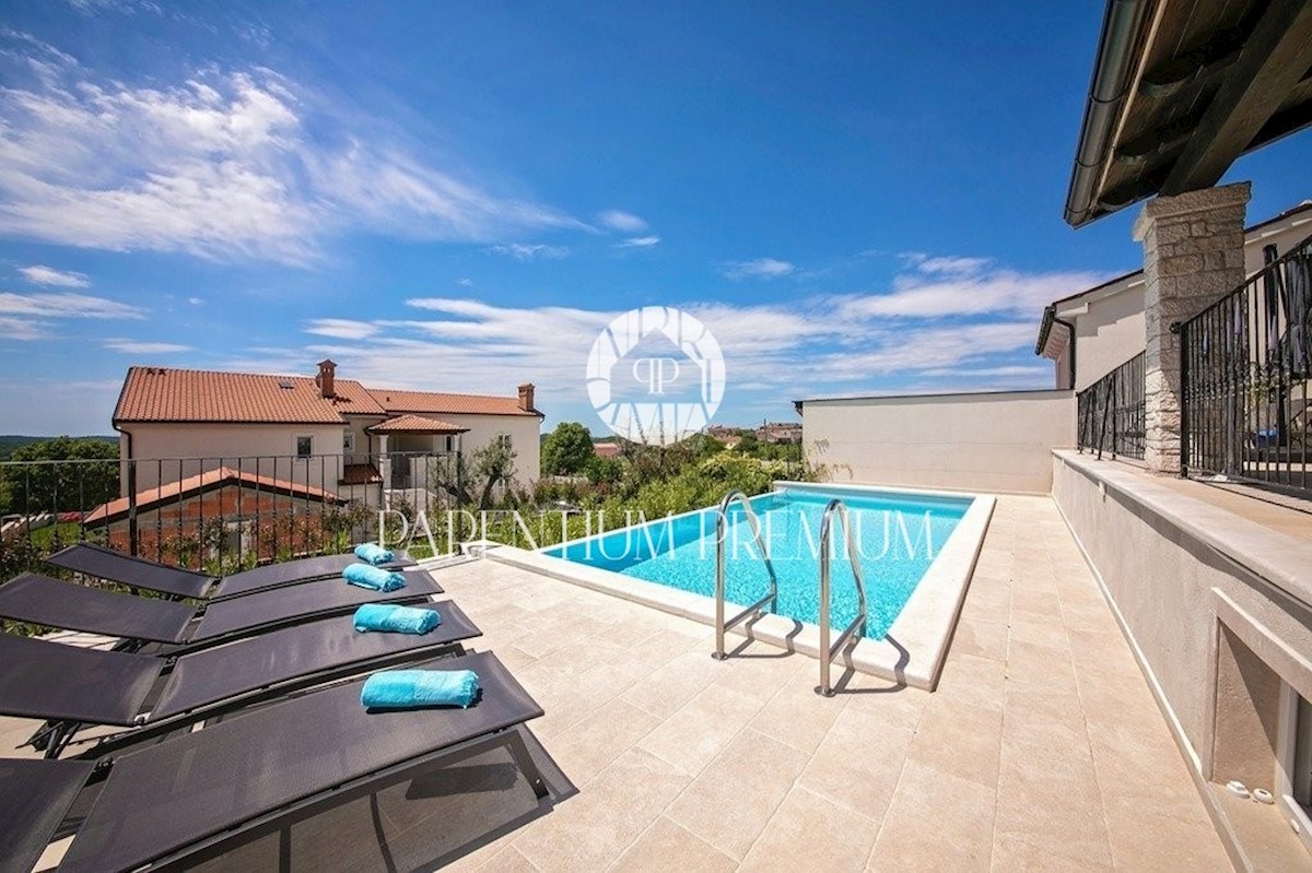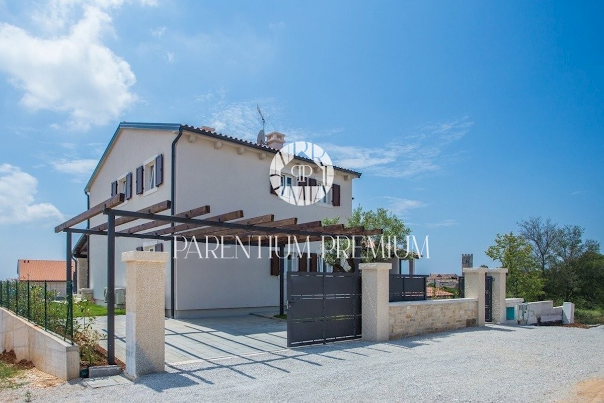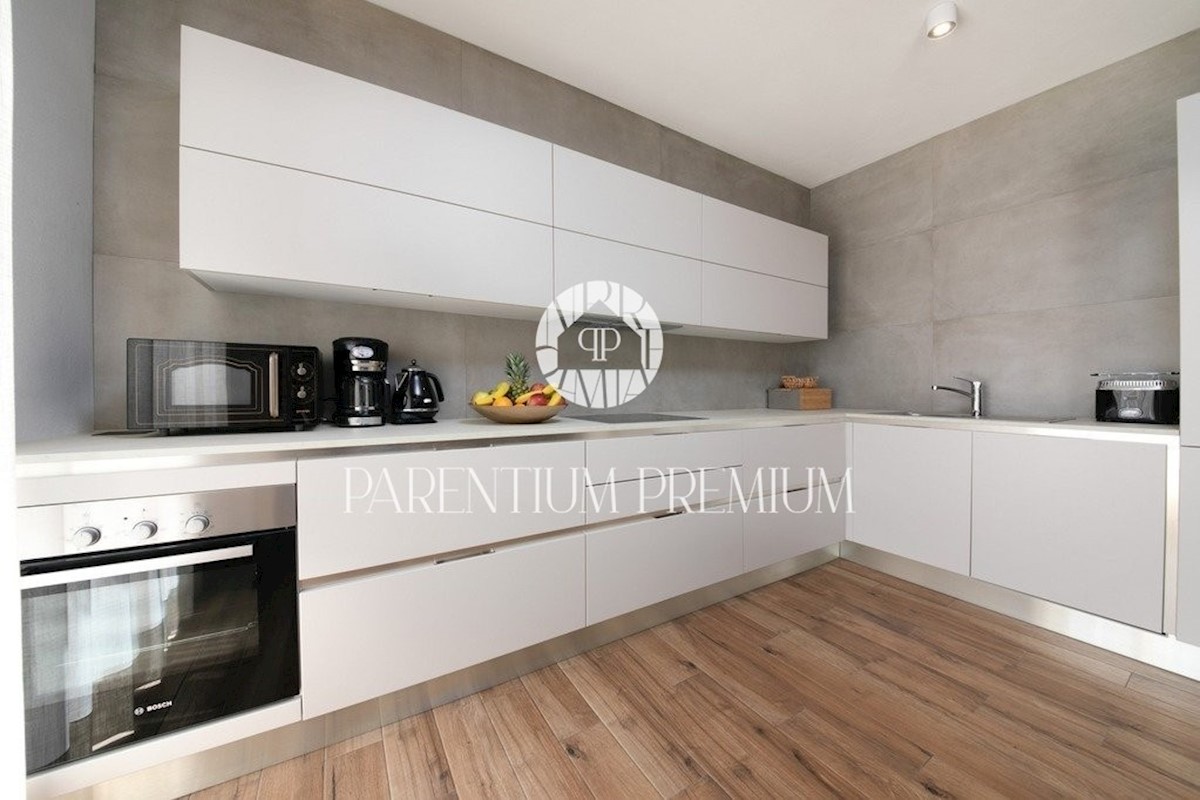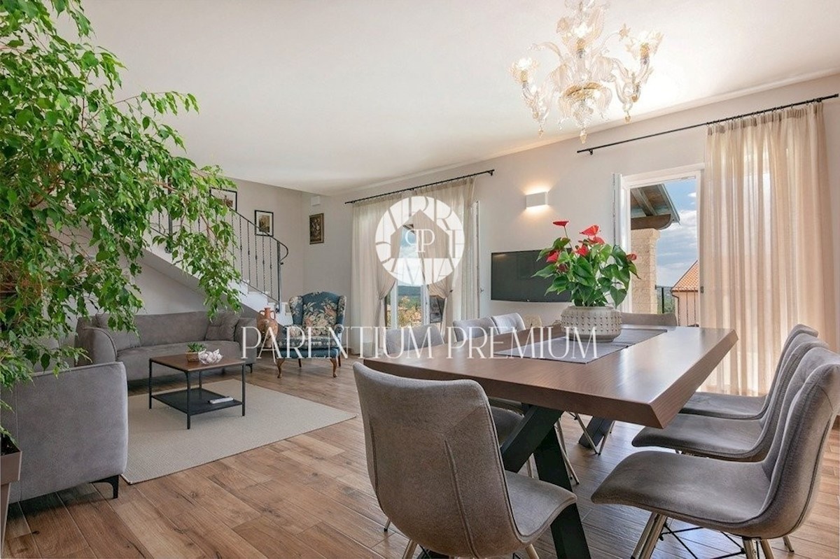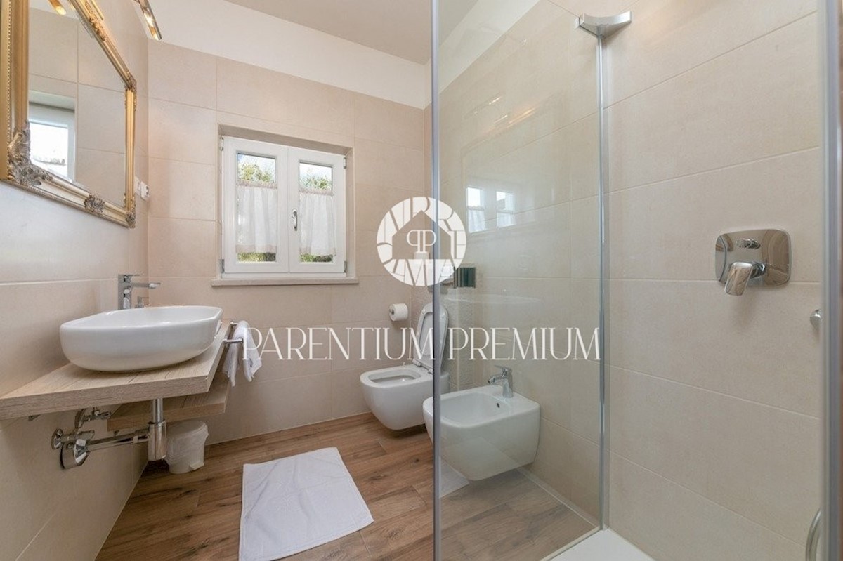 Istra, Poreč Ta dizajnerska vila velikosti 355m2 s parcelo 562m2 je zgrajena v istrskem slogu in se nahaja v majhnem, mirnem kraju v bližini mesta Poreč. Pritličje vile sestavljajo predprostor, kuhinja, jedilnica in velika dnevna soba z izhodom na pokri