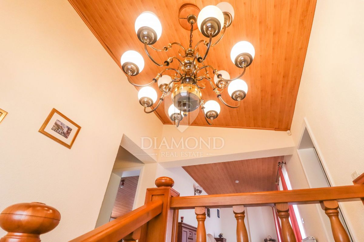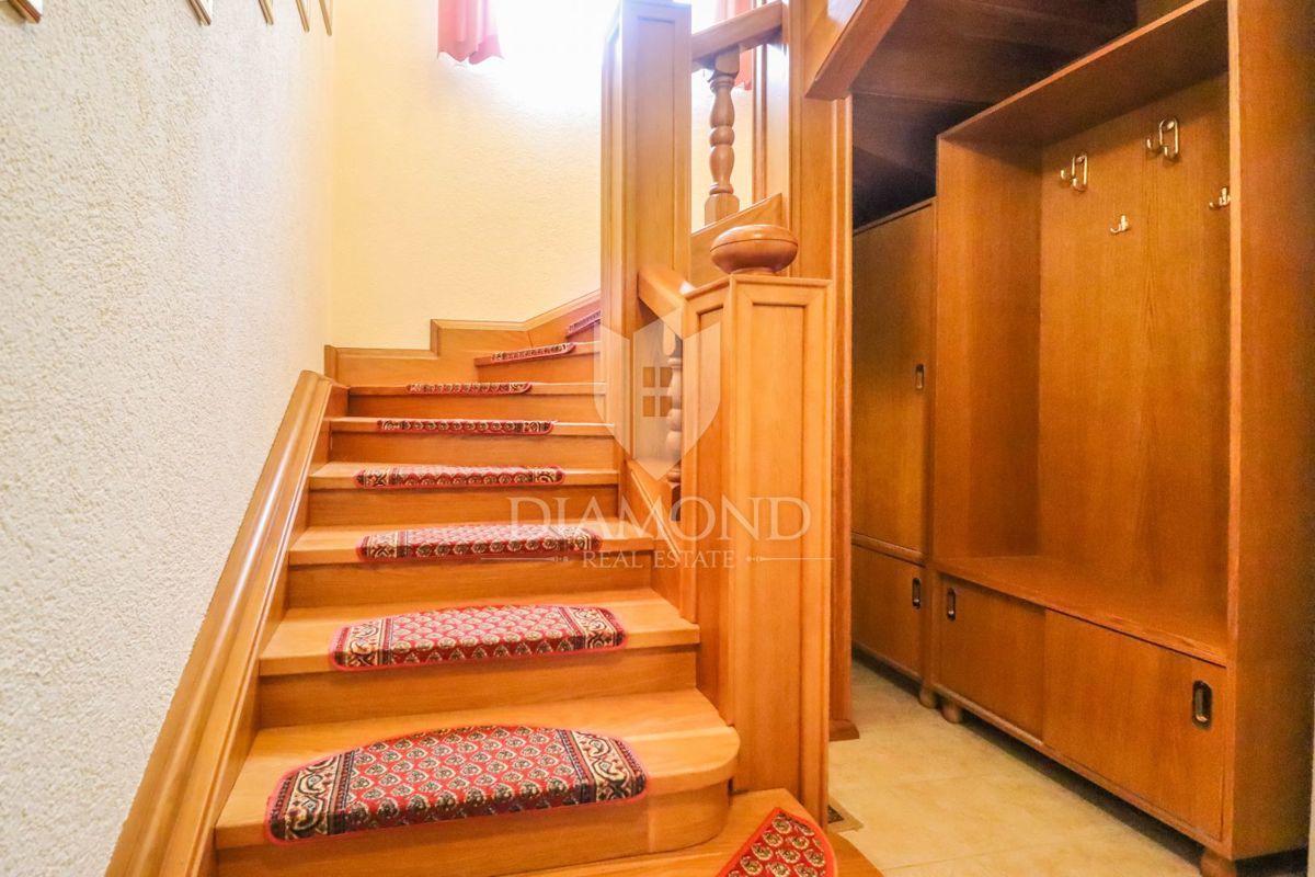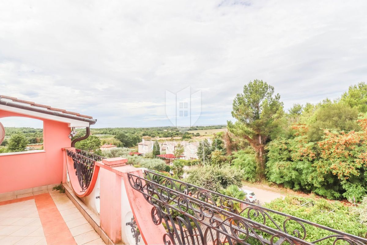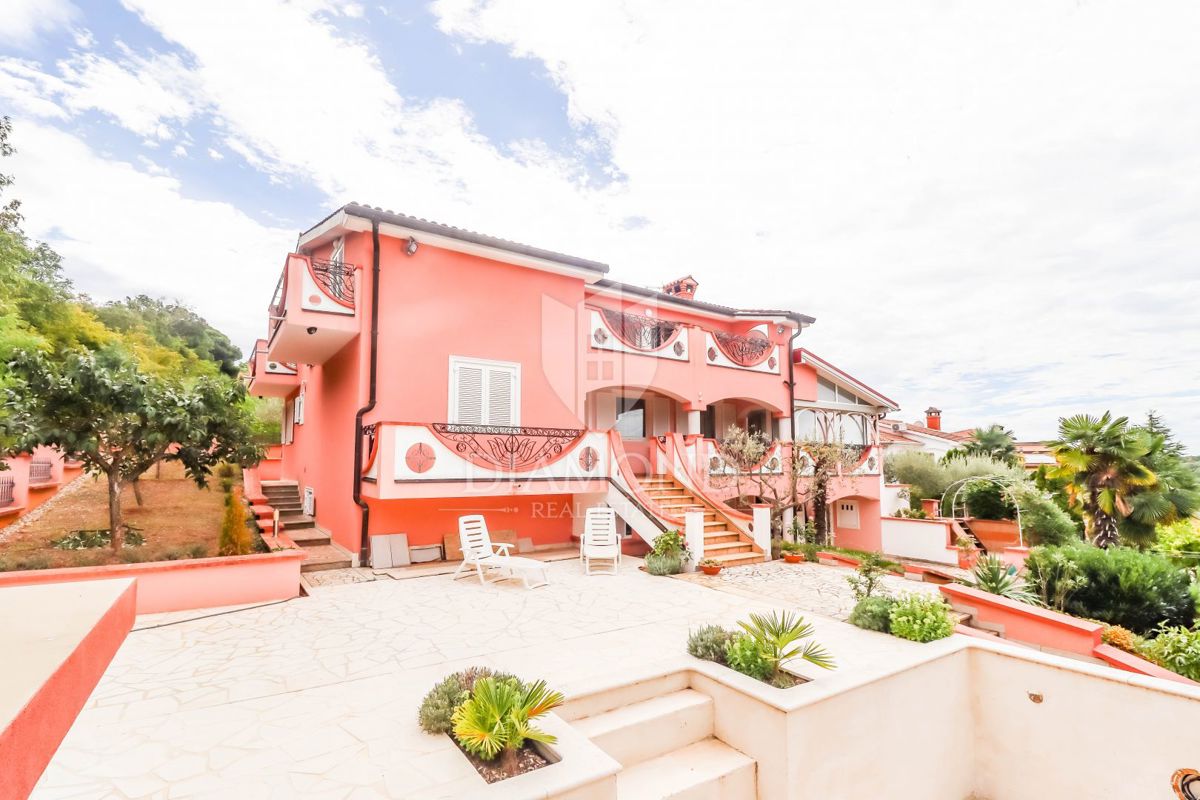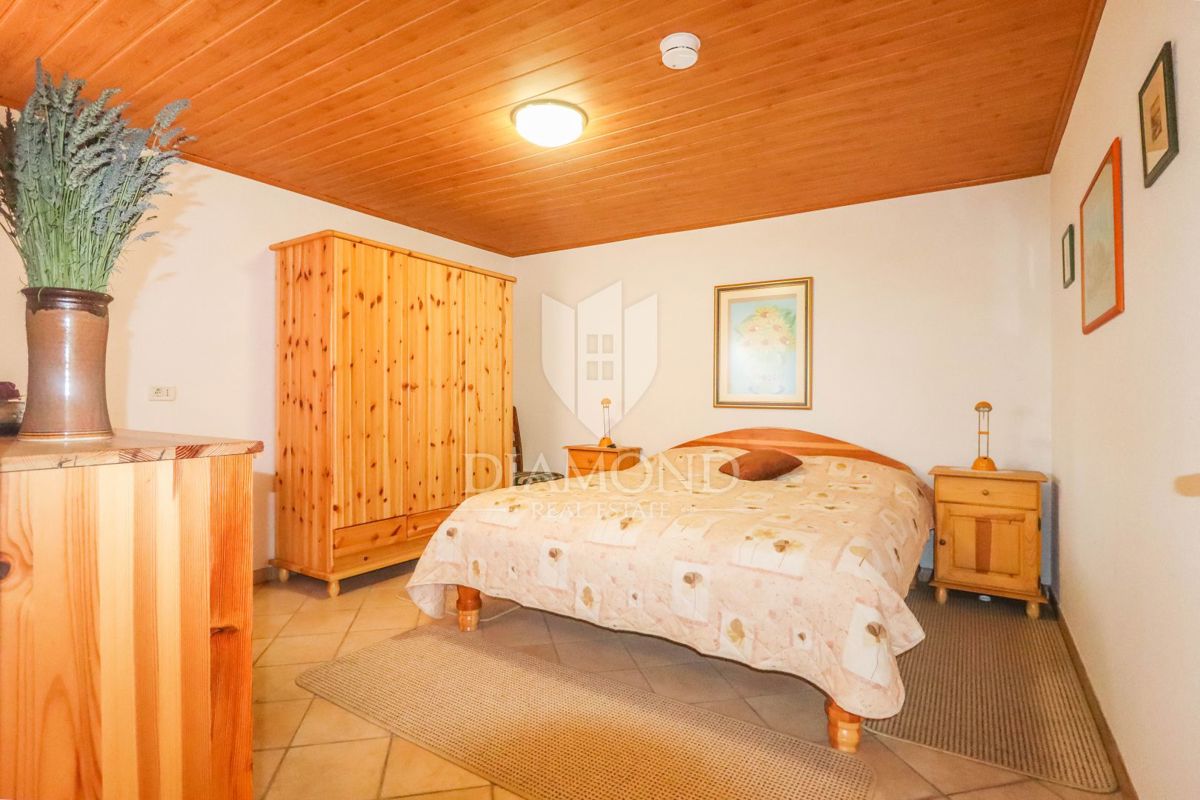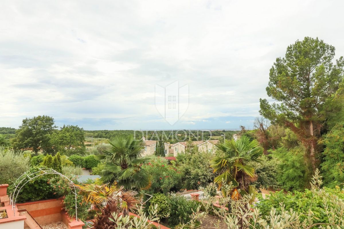 Poreč, okolica, prostorna hiša z bazenom in pogledom na morje! Ta prostorna družinska hiša z bazenom in čudovitim pogledom na morje se nahaja v majhnem in mirnem kraju, 7 km od mesta Poreč in 4 km od prvih plaž. Hiša se razprostira na 1173 m2 zemljišč