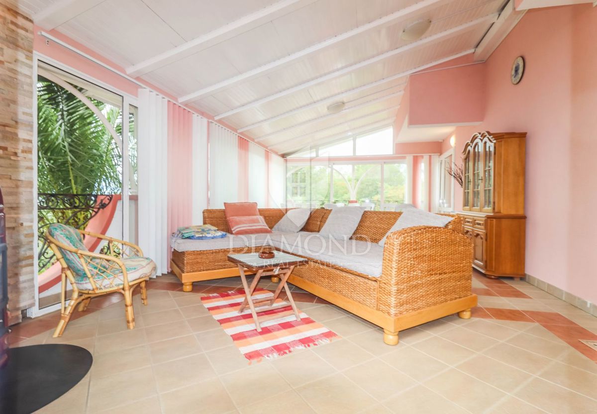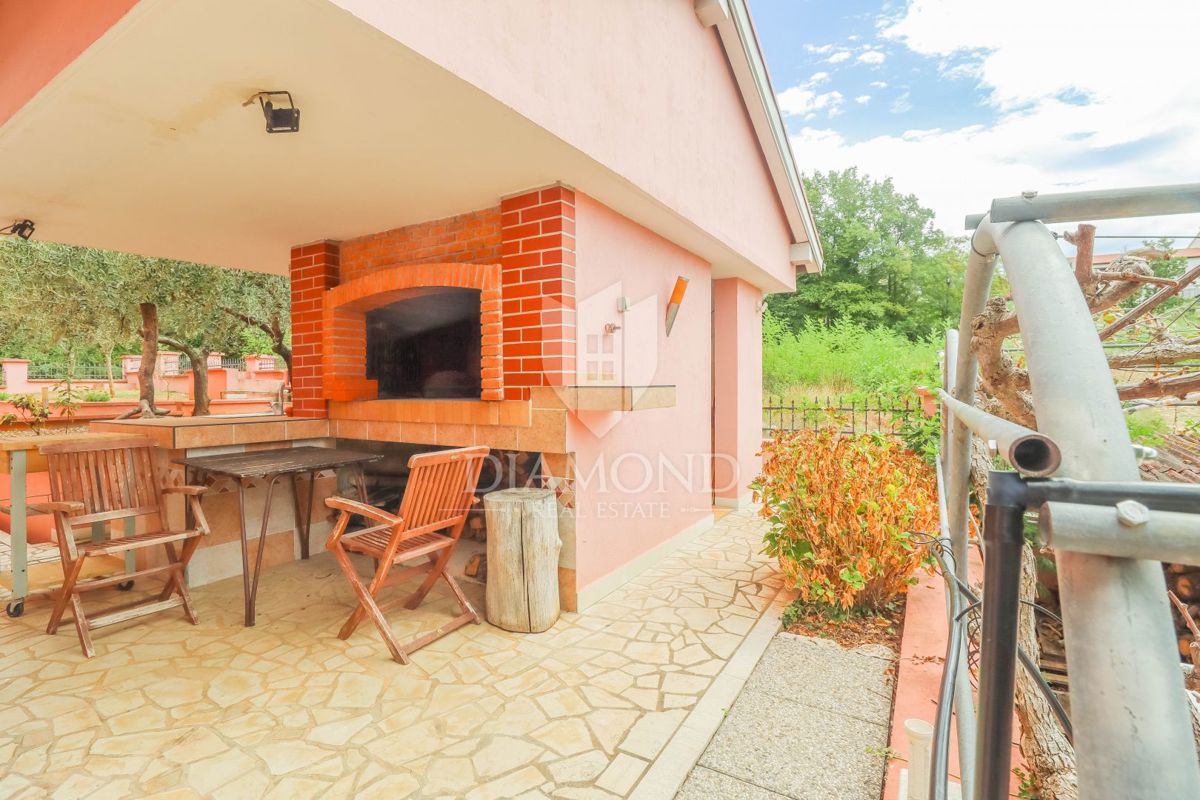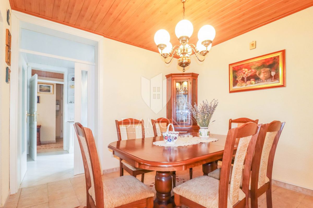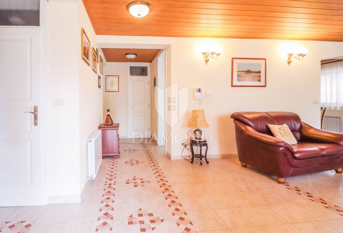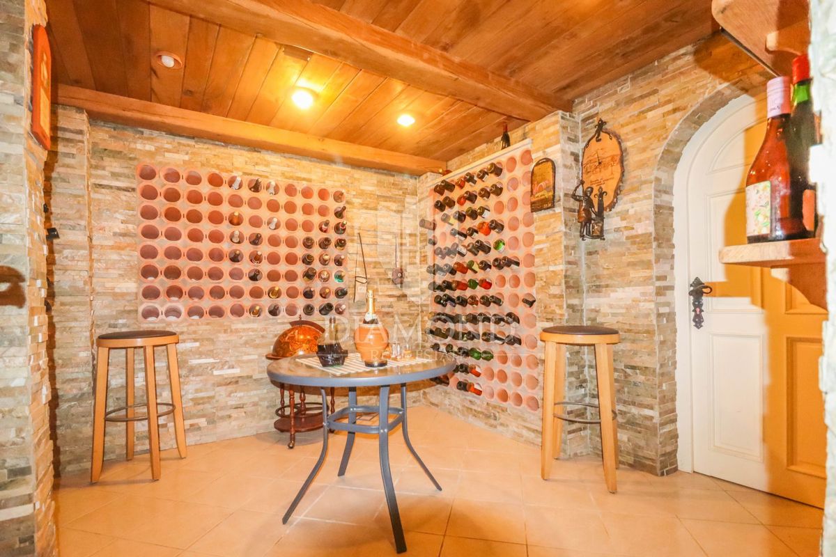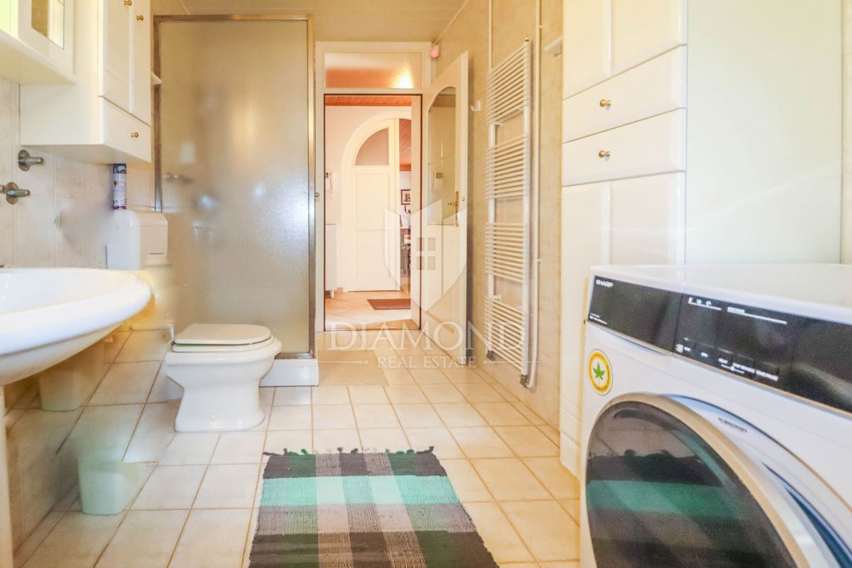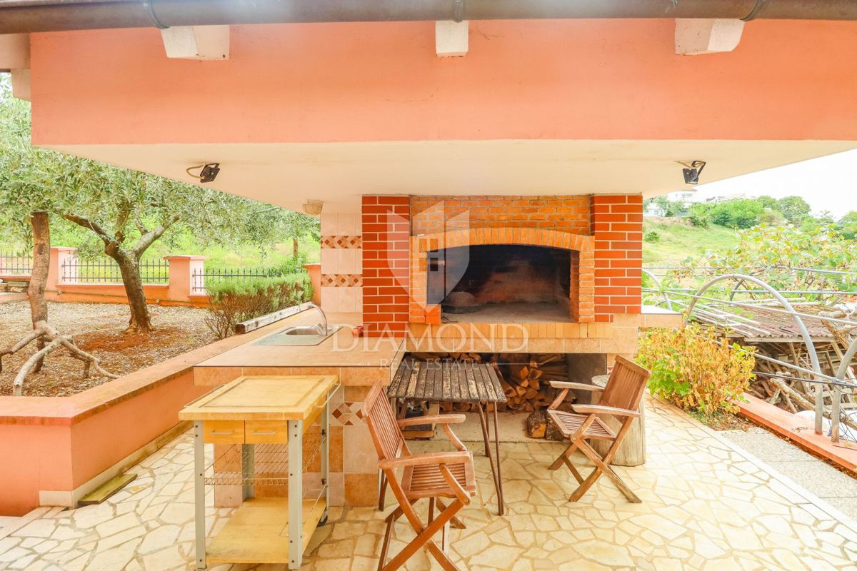 Poreč, okolica, prostorna hiša z bazenom in pogledom na morje! Ta prostorna družinska hiša z bazenom in čudovitim pogledom na morje se nahaja v majhnem in mirnem kraju, 7 km od mesta Poreč in 4 km od prvih plaž. Hiša se razprostira na 1173 m2 zemljišč