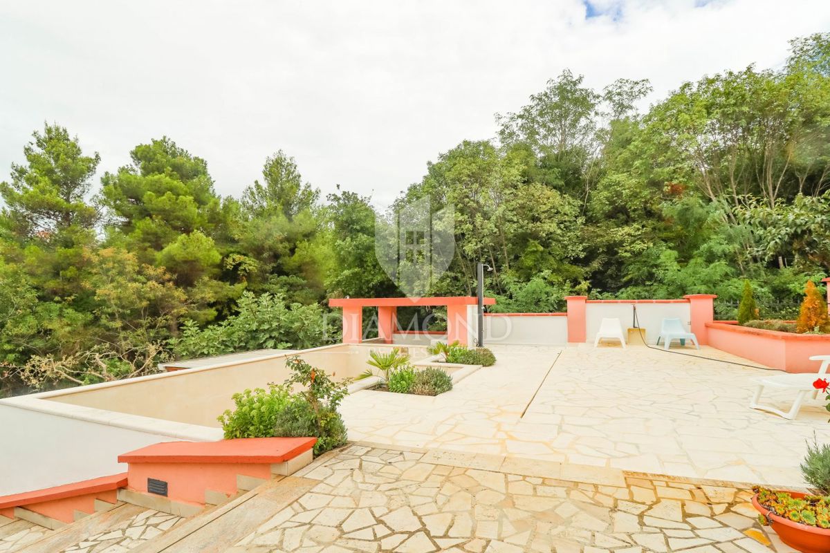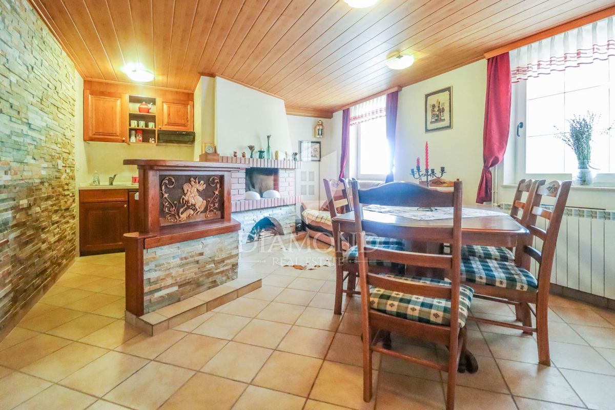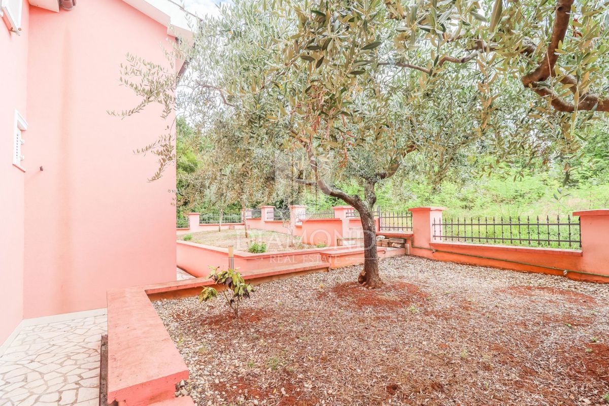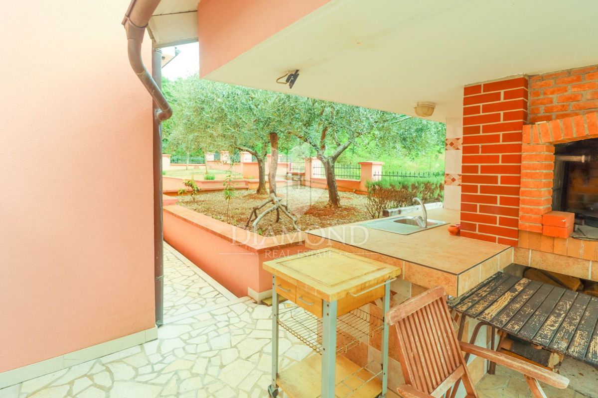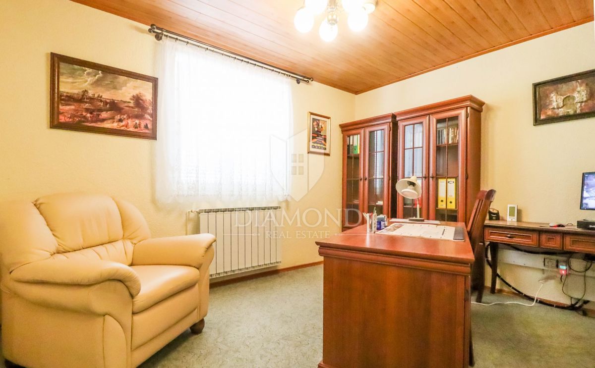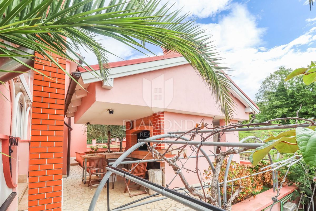 Poreč, okolica, prostorna hiša z bazenom in pogledom na morje! Ta prostorna družinska hiša z bazenom in čudovitim pogledom na morje se nahaja v majhnem in mirnem kraju, 7 km od mesta Poreč in 4 km od prvih plaž. Hiša se razprostira na 1173 m2 zemljišč