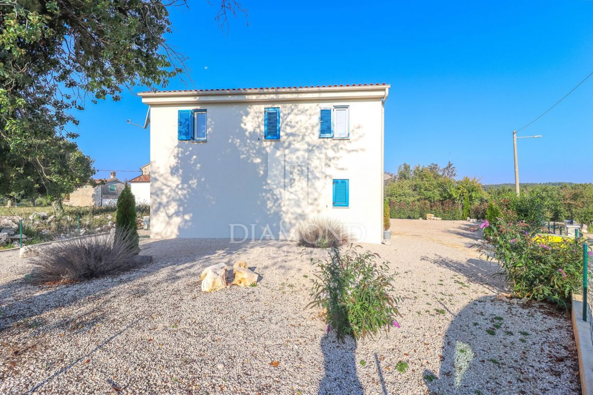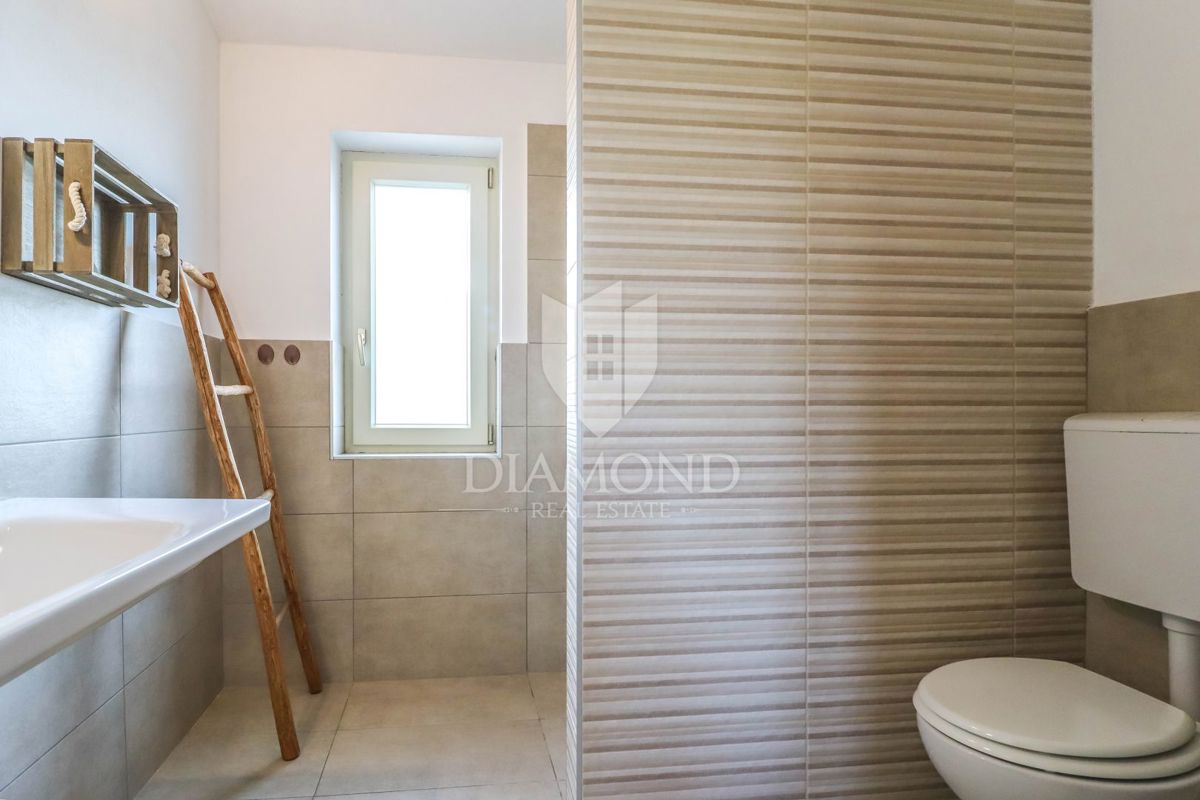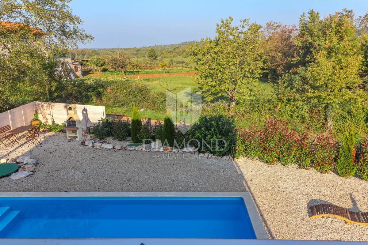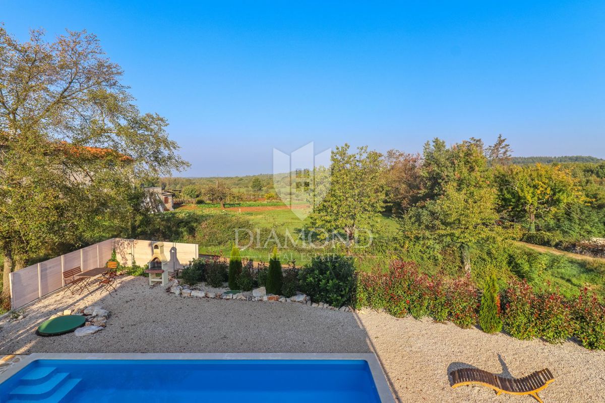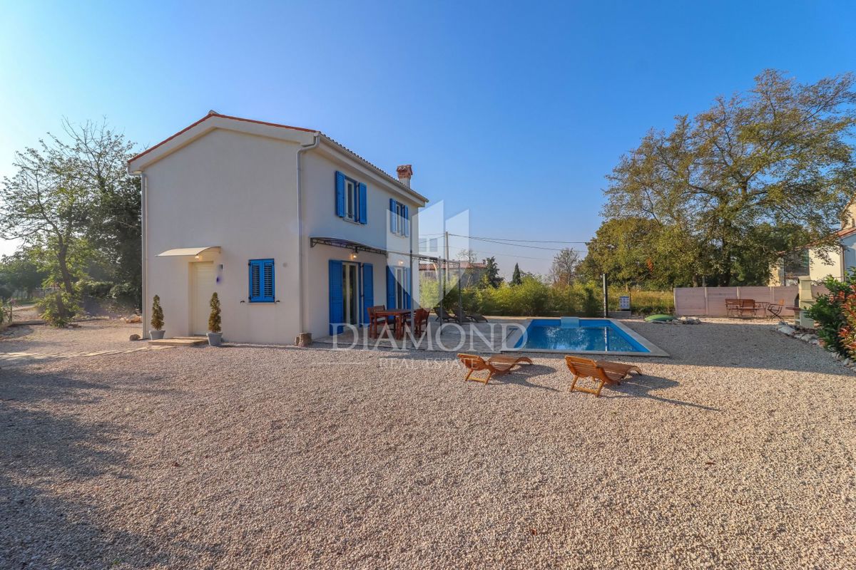 Poreč, okolica, očarljiva vila v mirnem okolju! Ta lepa hiša z bazenom se nahaja na mirnem mestu, le 14 km od Poreča in plaž. Skupna površina zemljišča je 613 m2, skupna površina hiše pa je 106 m2 in se razteza v dveh etažah. V pritličju je prostorna dn