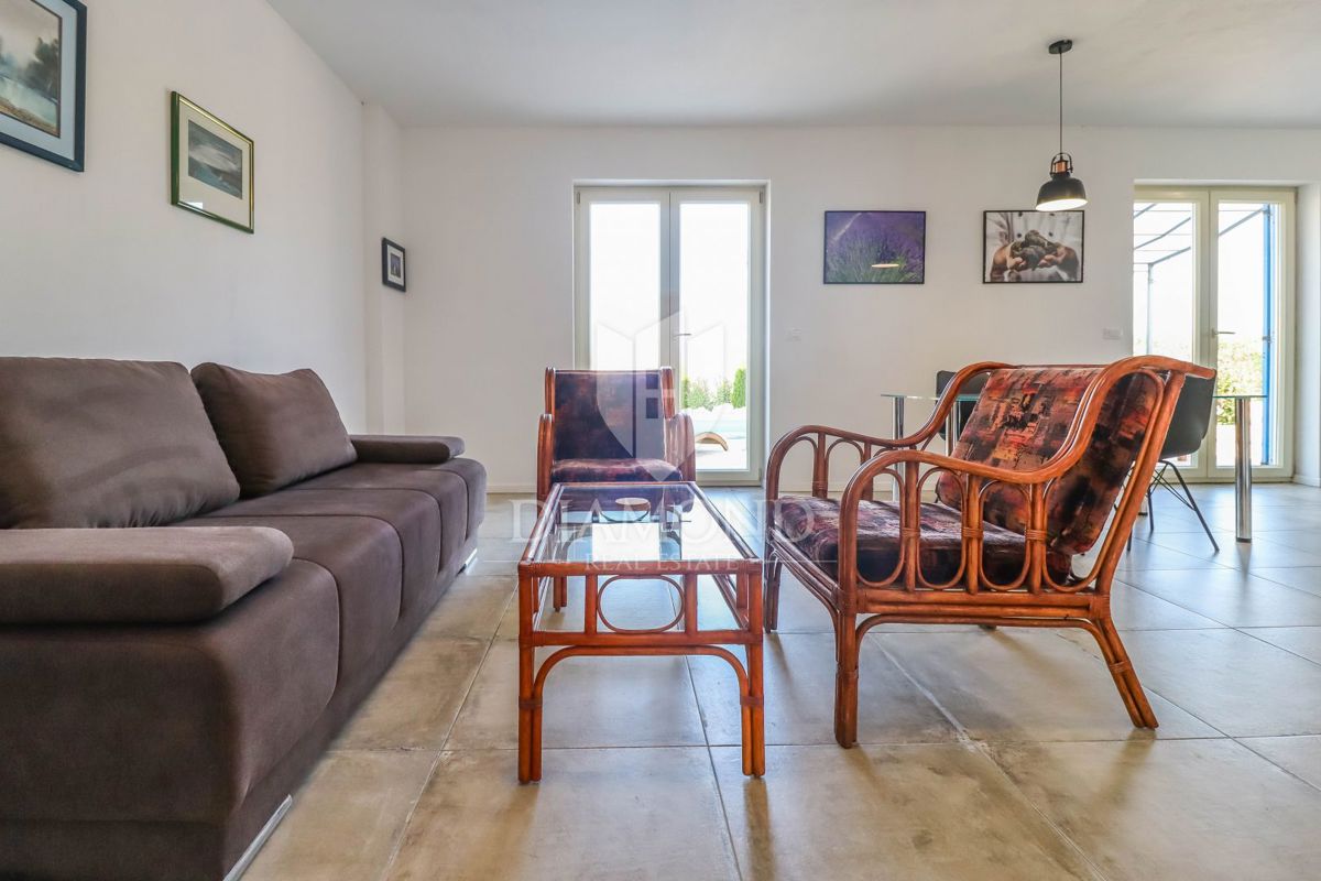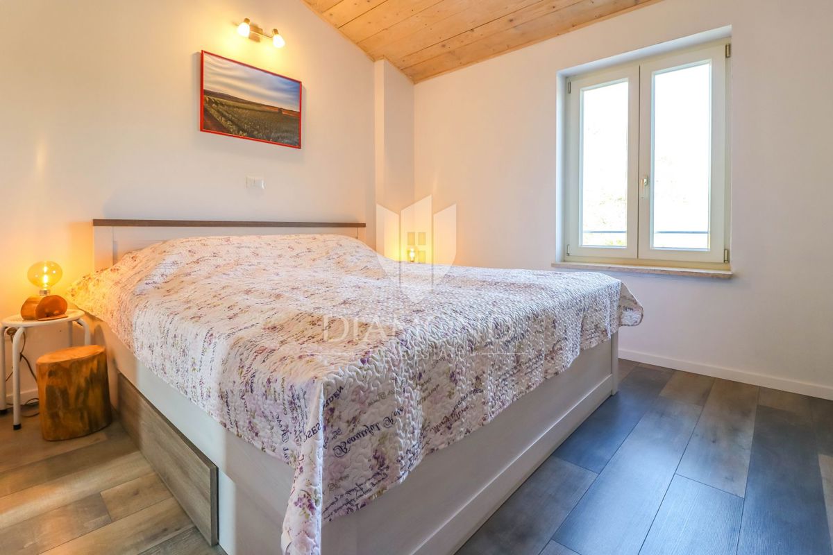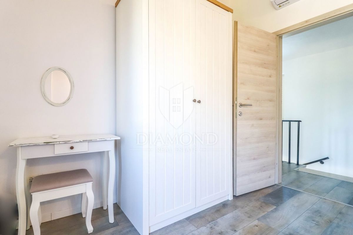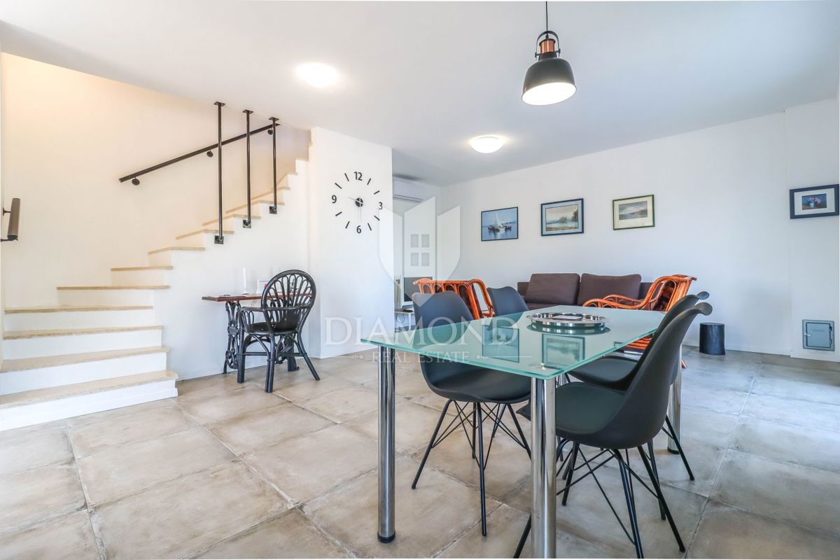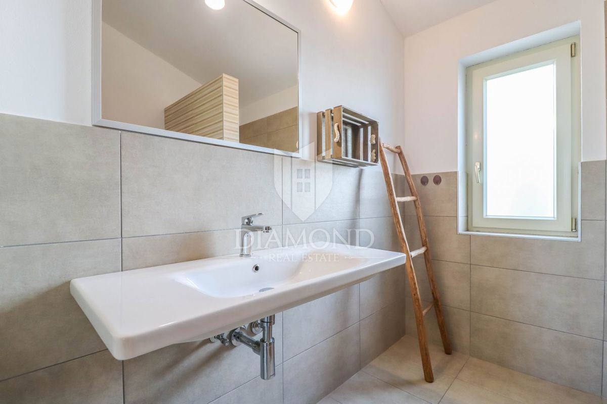Poreč, okolica, očarljiva vila v mirnem okolju! Ta lepa hiša z bazenom se nahaja na mirnem mestu, le 14 km od Poreča in plaž. Skupna površina zemljišča je 613 m2, skupna površina hiše pa je 106 m2 in se razteza v dveh etažah. V pritličju je prostorna dn