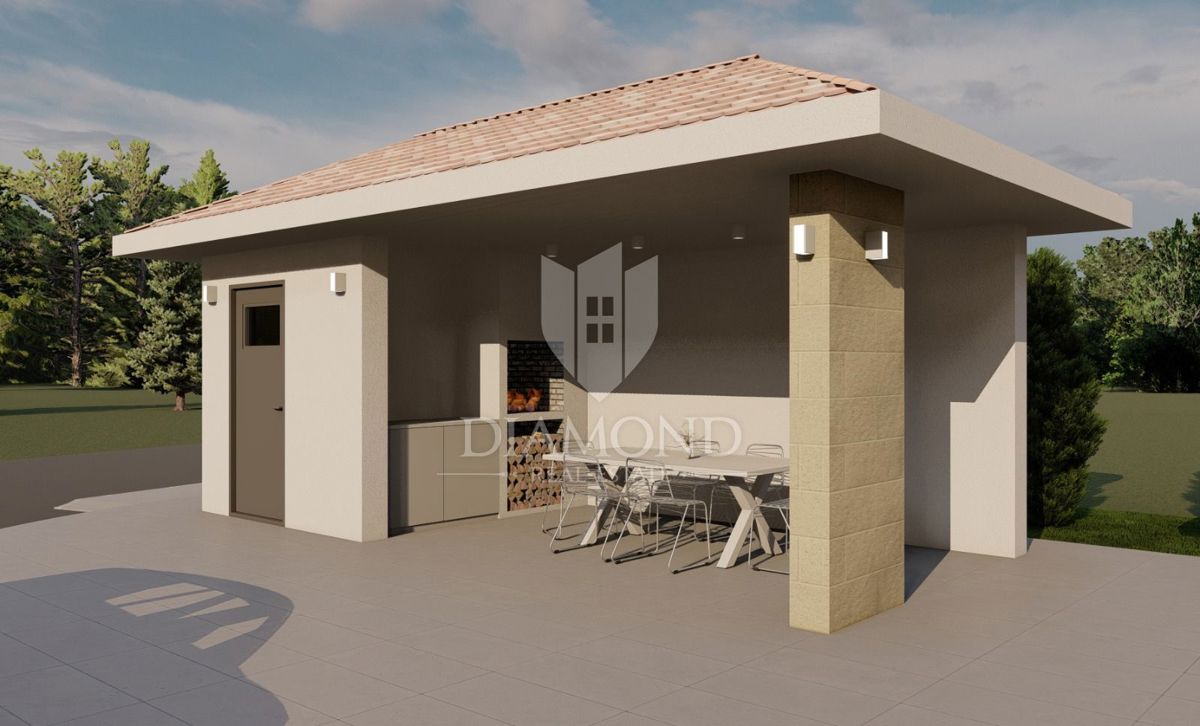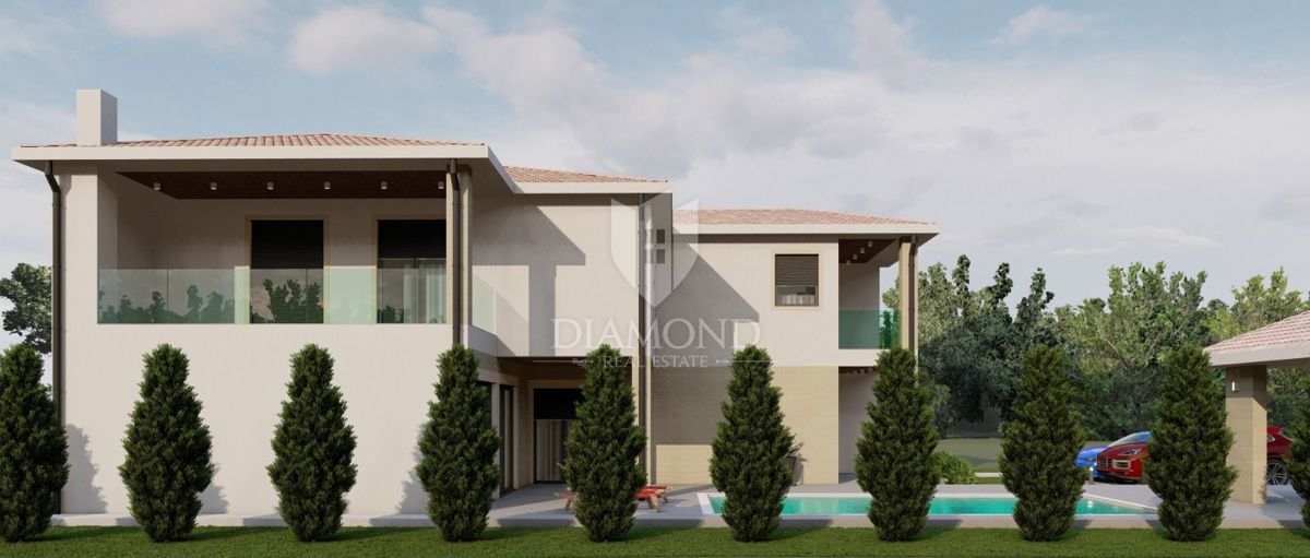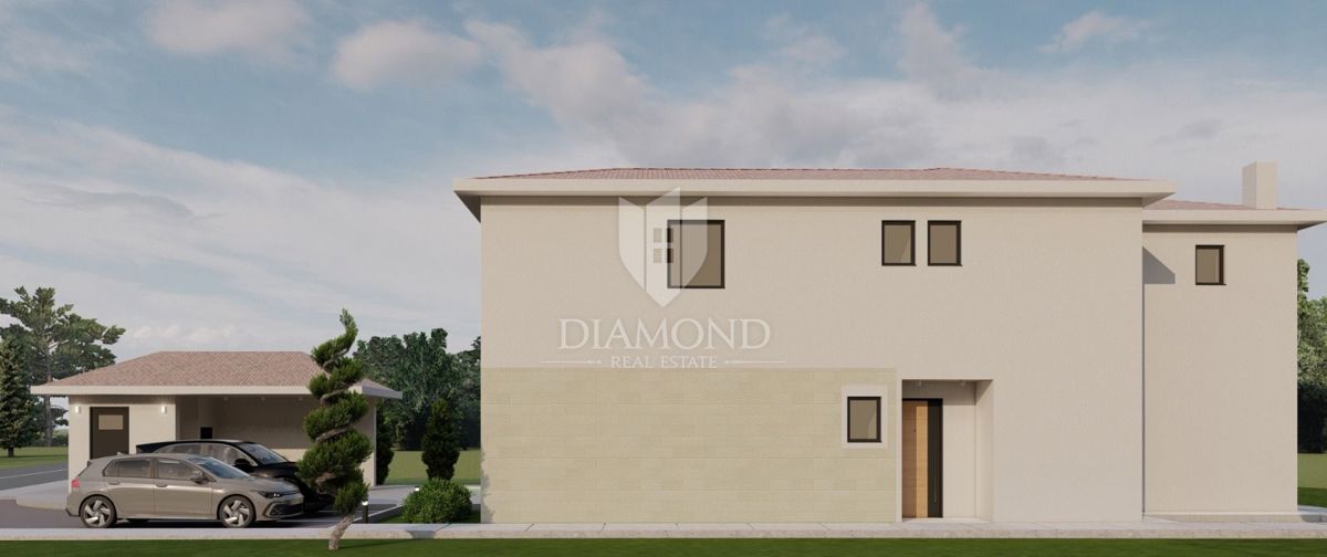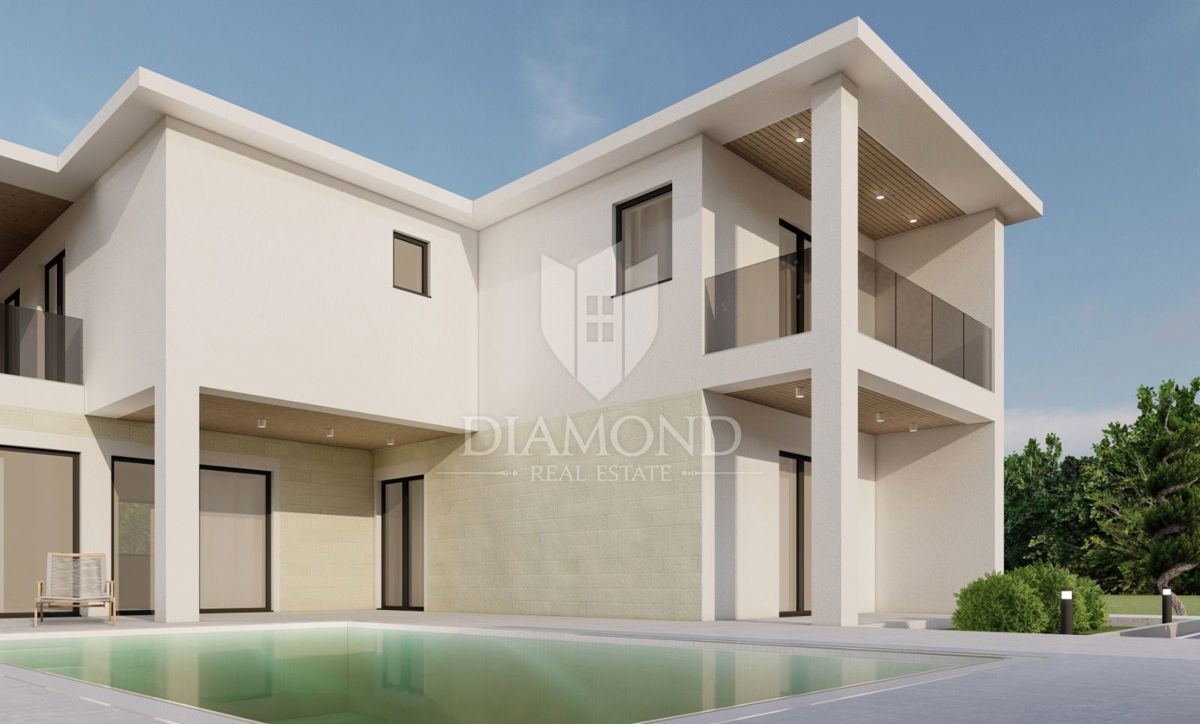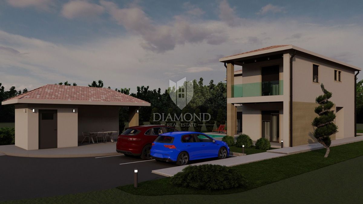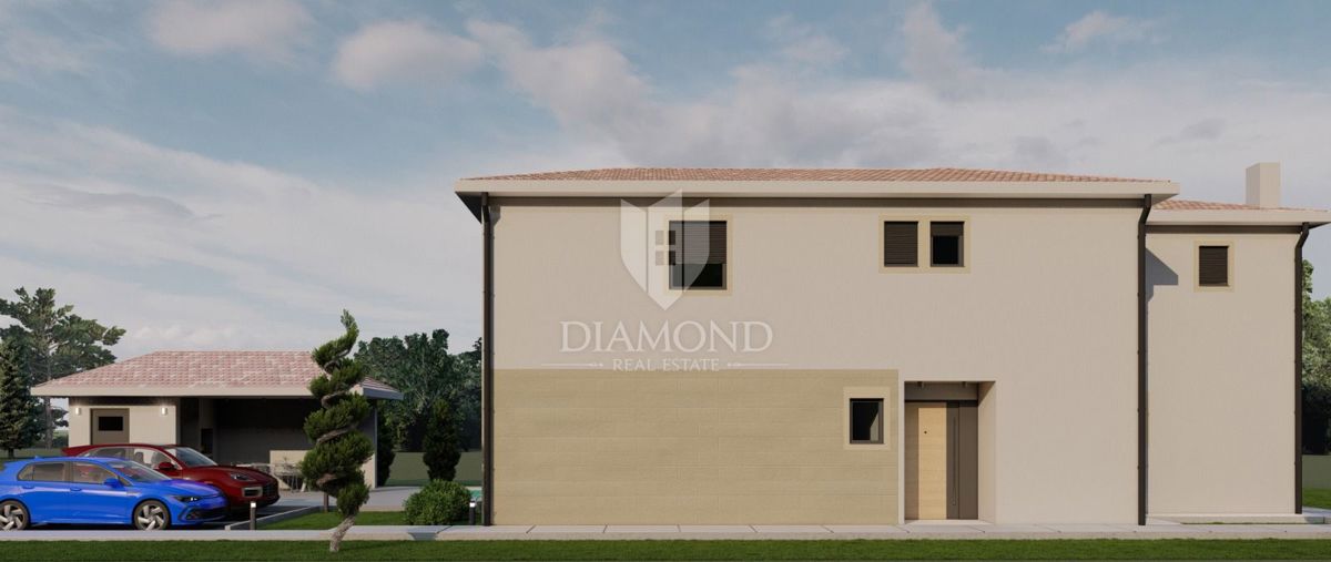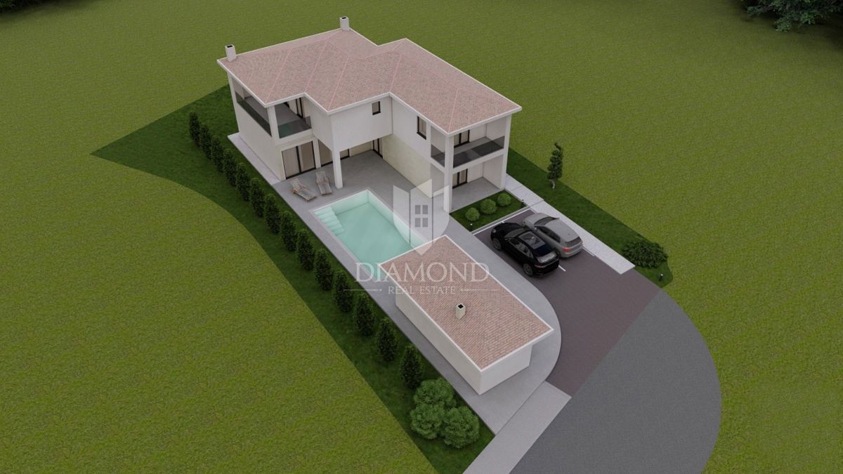 Poreč, okolica, Istra V mestecu v zaledju Poreča se prodaja ta atraktivna in moderna vila v gradnji z bazenom! Nahaja se v mirnem delu mesta, obdanem z naravo in modernimi novozgrajenimi hišami. Hiša se nahaja v kraju, ki obstaja in kjer so vse potrebne