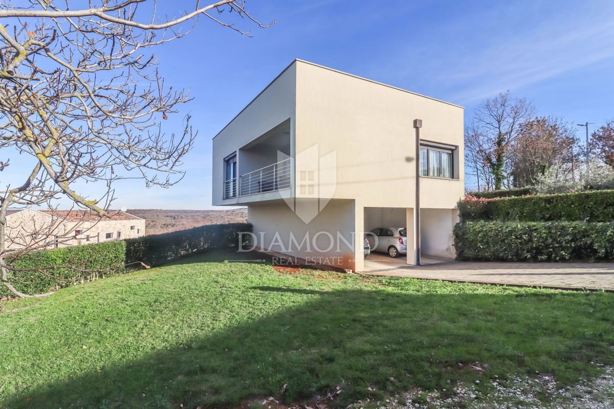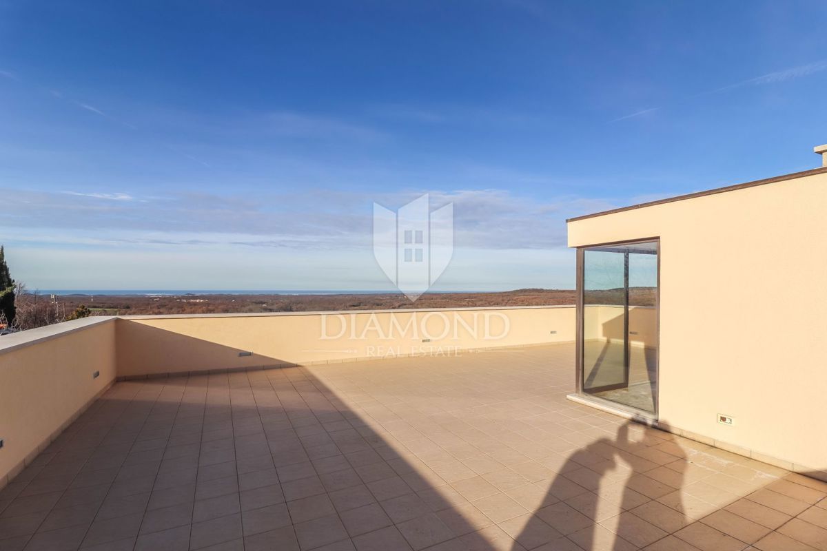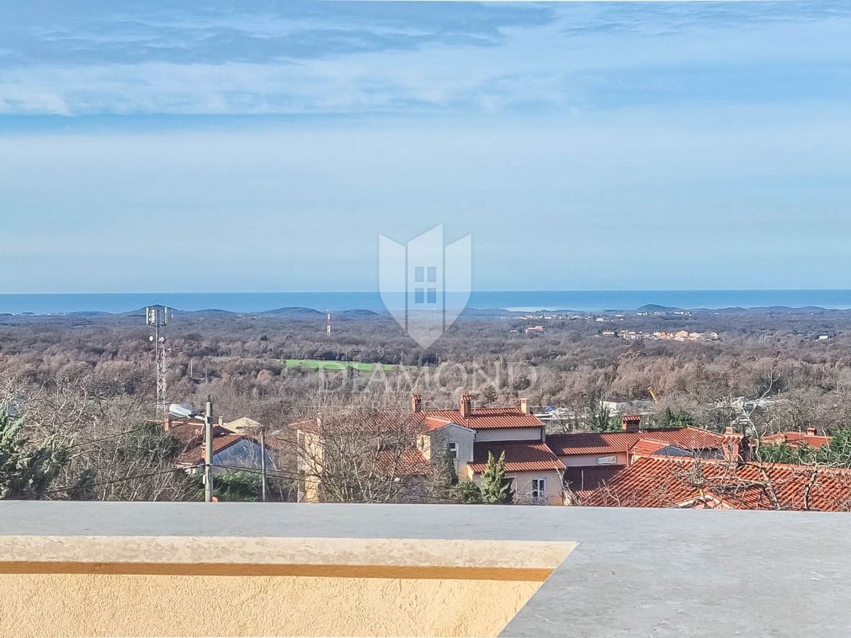 Poreč, okolica, odlična hiša s panoramskim pogledom na morje! Prodaja se samostojna moderna družinska hiša z dvema stanovanjskima enotama. Od centra Poreča in njegovih čarobnih plaž je oddaljen 10 km. Nahaja se na mirni lokaciji z vsemi potrebnimi vsebi