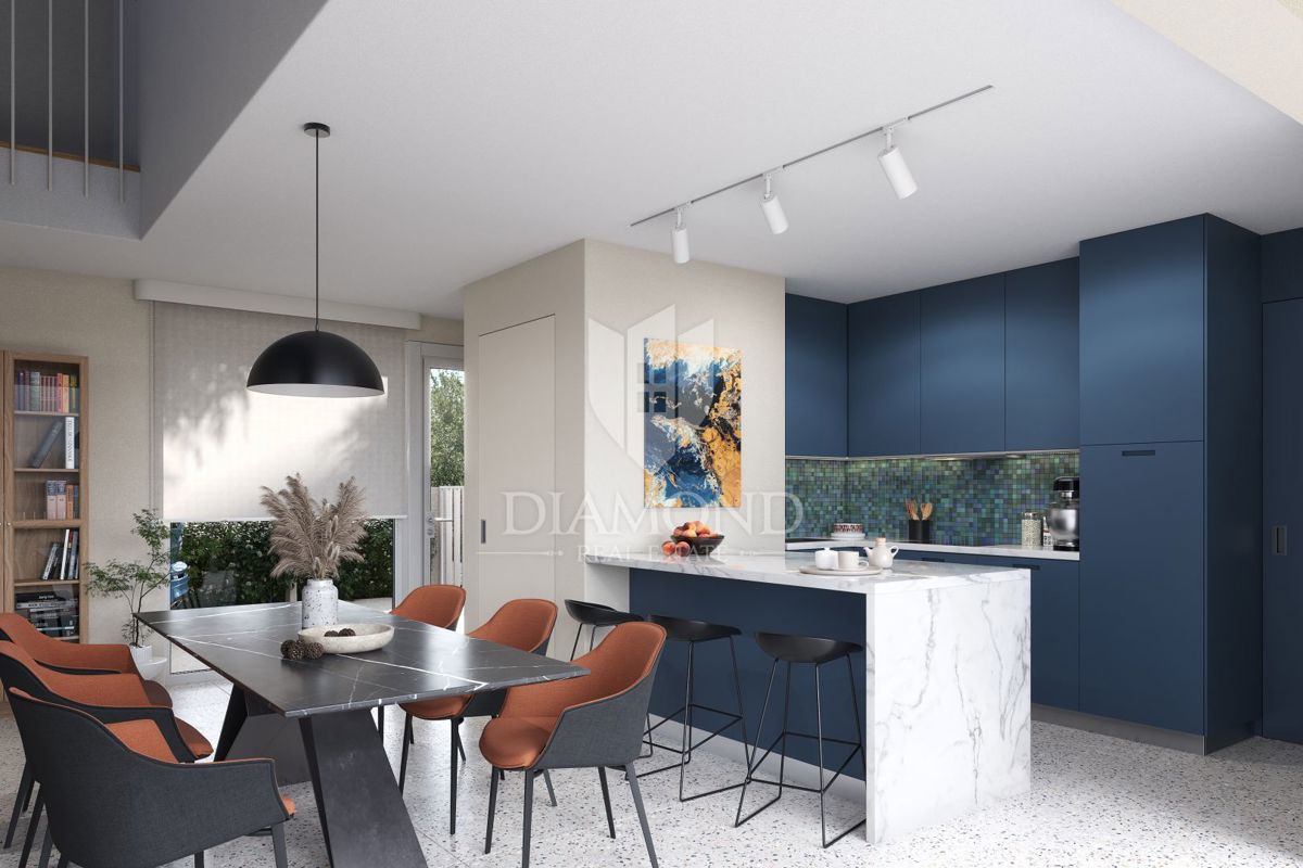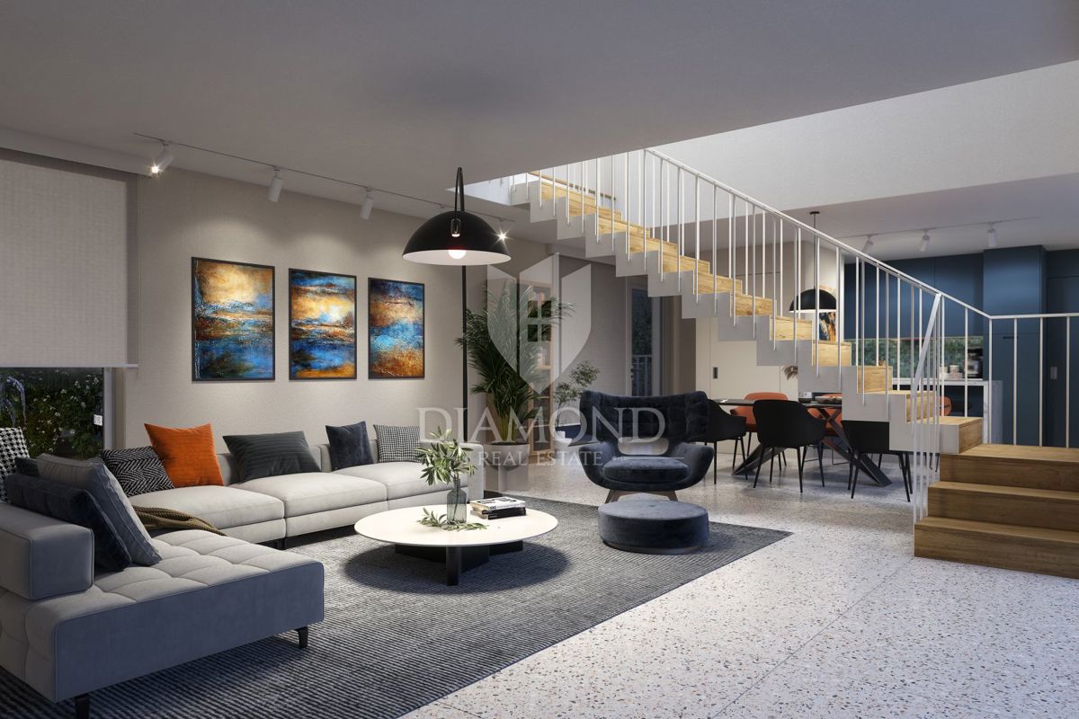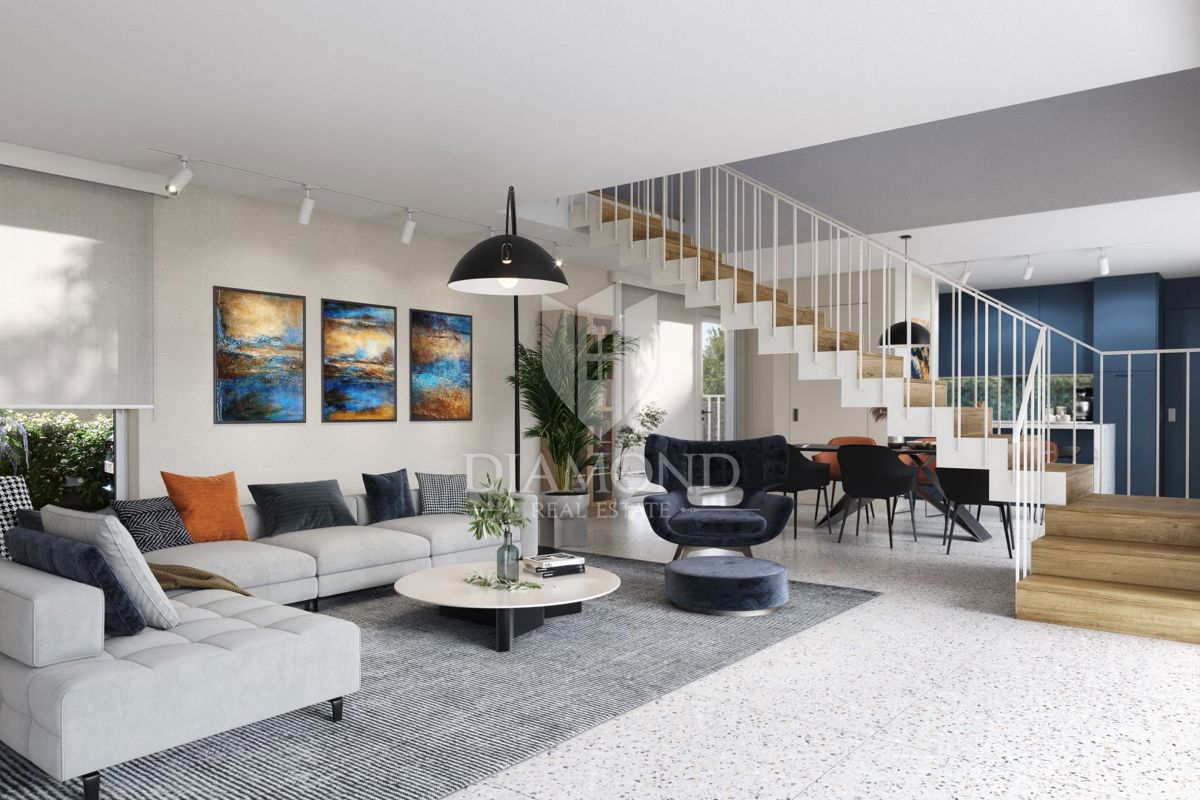 Poreč, okolica, lepa hiša 100 m od morja! Ta lepa samostojna hiša se bo nahajala le 100 m od prvih plaž. Njena skupna izmera bo 135,17 m2, dvorišče pa skupno 376 m2. Hiša se razprostira na dveh etažah. V pritličju se nahaja dnevna soba, kuhinja in jedilni