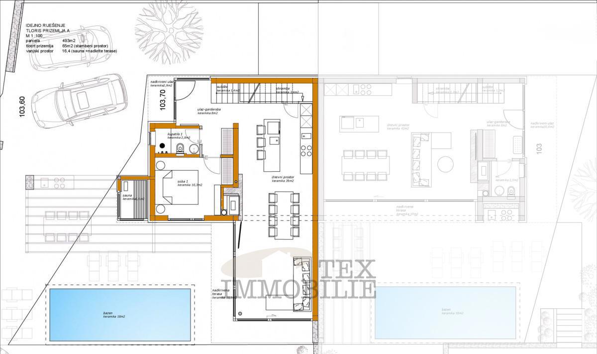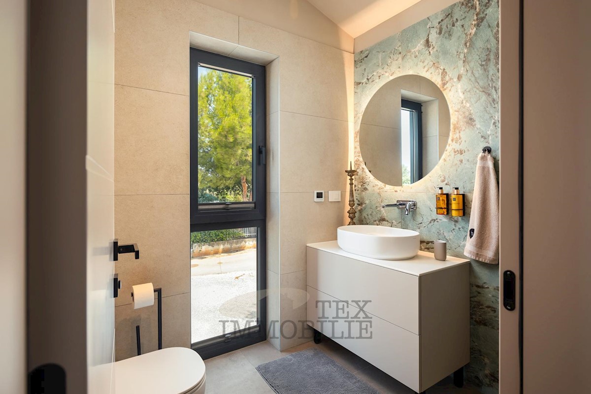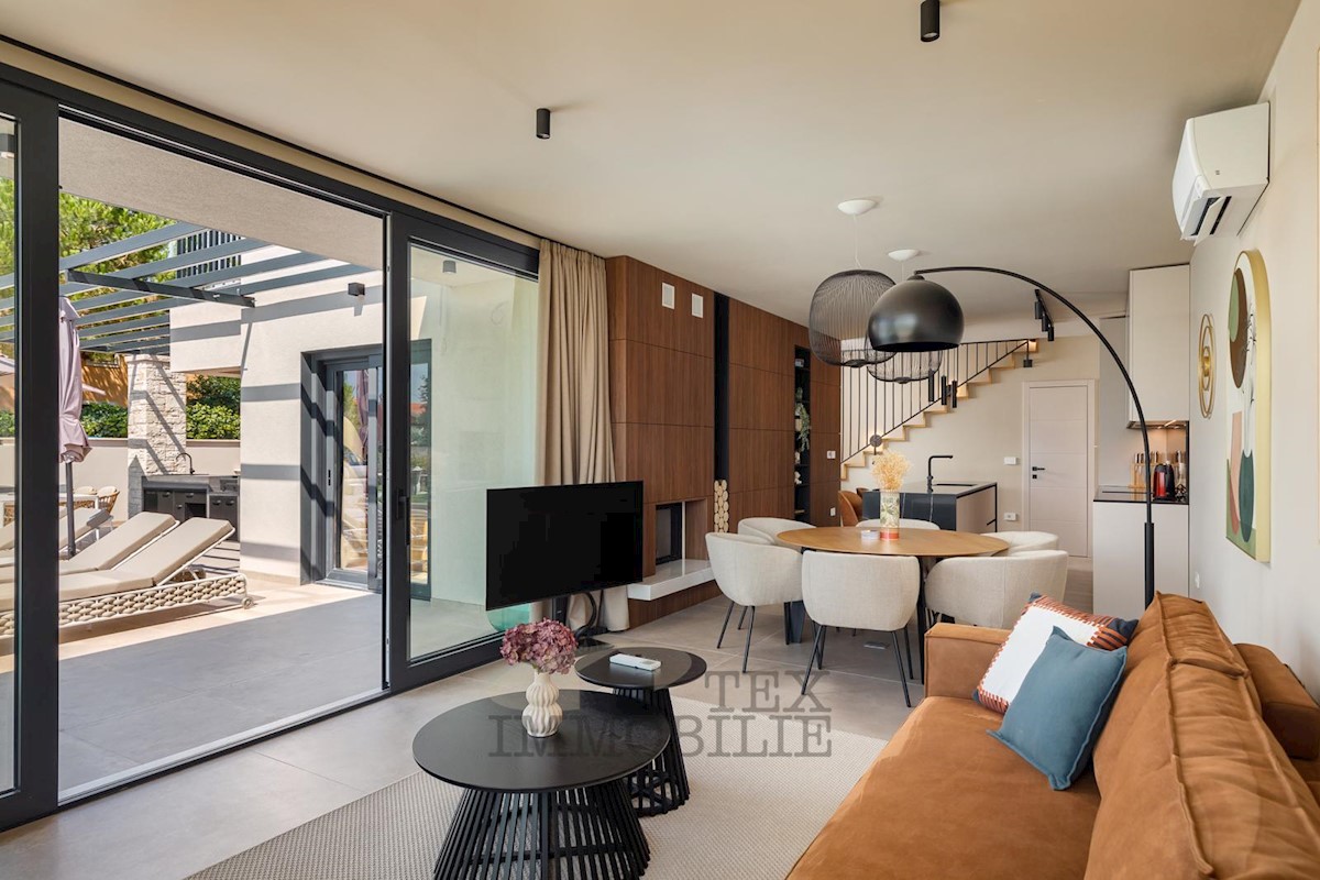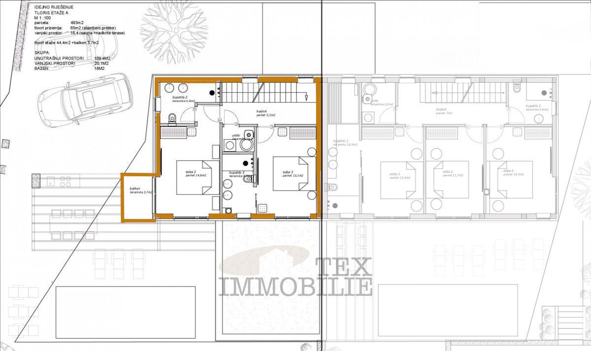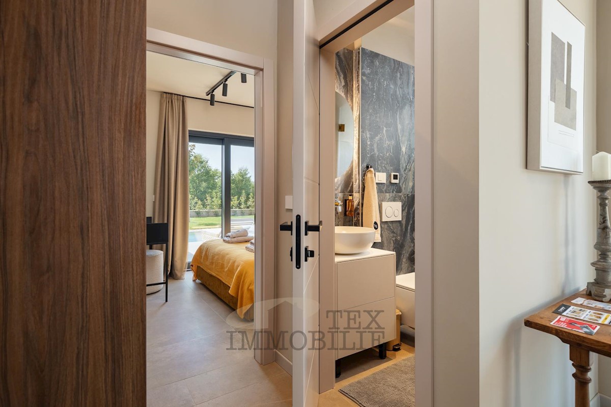 Ta čudovita dvojna hiša bo zgrajena v majhnem mestu, 5 kilometrov od centra Poreča in 4 kilometre od prvih plaž. Obkrožena je z novimi sodobnimi hišami in lepim oljčnim nasadom. Skupna površina je 111 m2, hiša pa je sestavljena iz dveh nadstropij. Pritlič